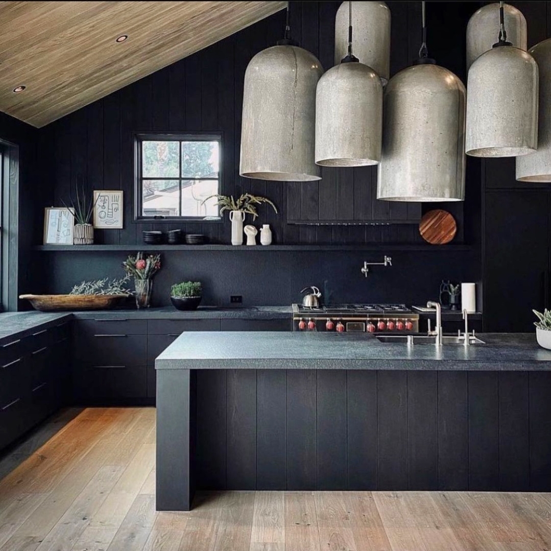 The Cathedral ceilings in this great room that serves as kitchen, dining and living space is close to twenty feet in height and by using a group of large scale concrete pieces we were able to create moody lighting giving the island area into it's own small environment inside of this really large space.