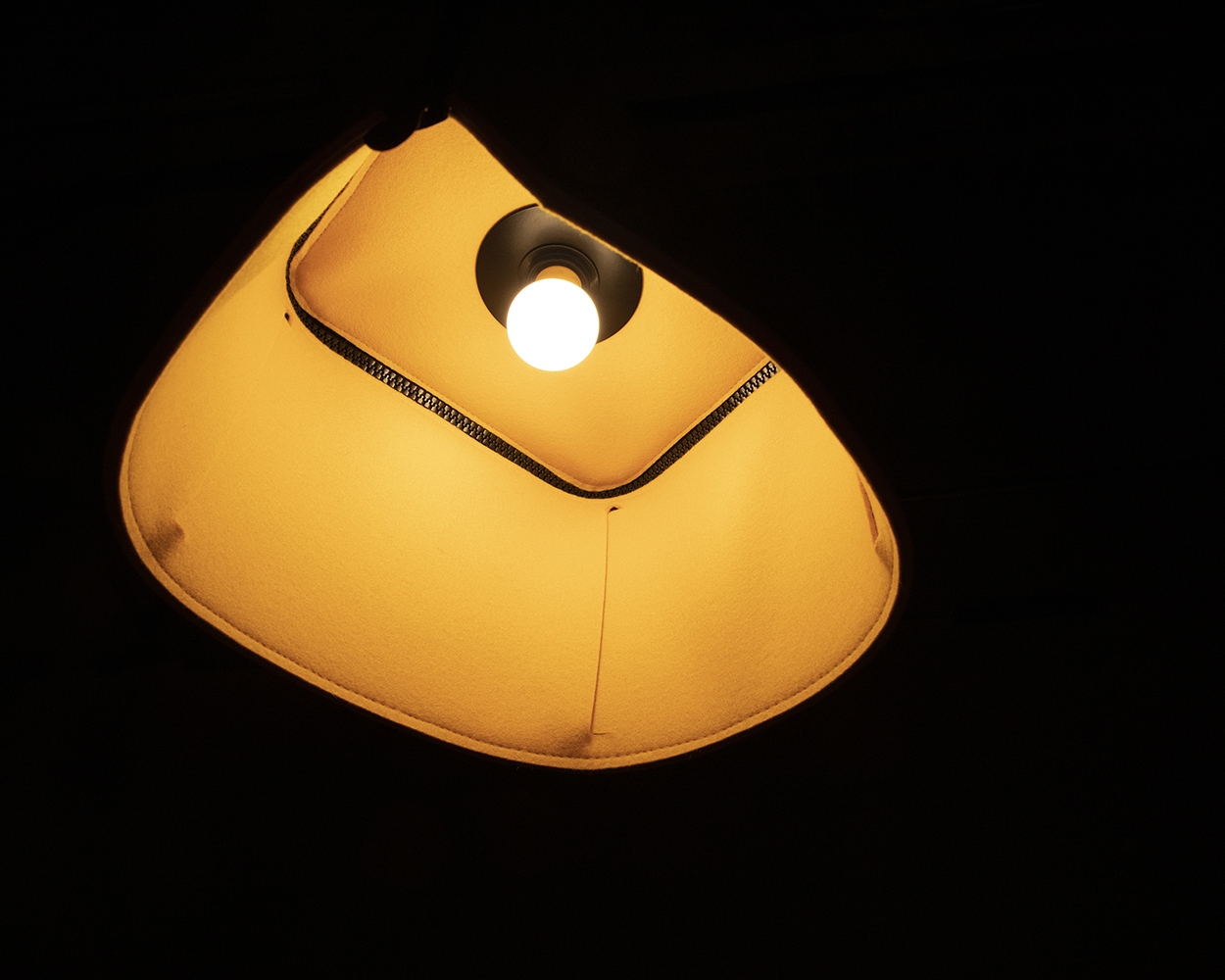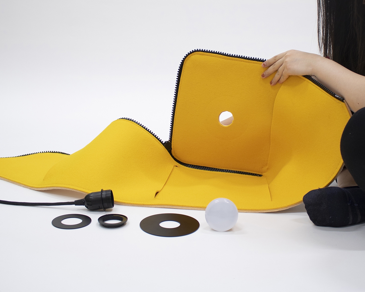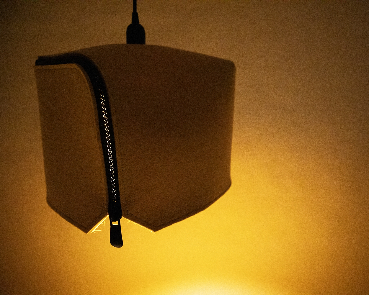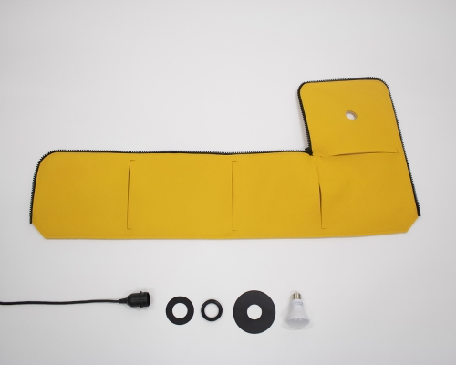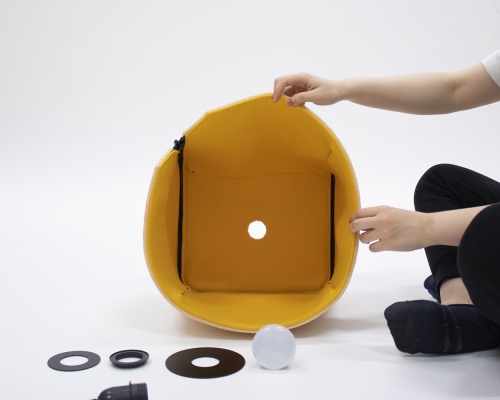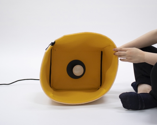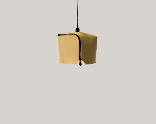Nowadays, lighting becomes an important part of our daily life. It is an interesting element that is a highlight of a space. Be- box is a lamp that is inspired by a box shape. It consists of two parts- a 100% Wool felt body and metal pieces to secure the felt layer. The body part works as a sound absorber and is designed to be assembled and disassembled easily with an oversize zipper. In the meantime, the dimming of the light can be controlled by the position of the zipper. When clients begin to interact with the zipper, they will be able to see the bright yellow inner layer that creates a contrast with the neutral outside layer. In addition, to protect the felt layer from getting damaged by the pressure of the socket, it is sandwiched by two powder-coated metal sheets.