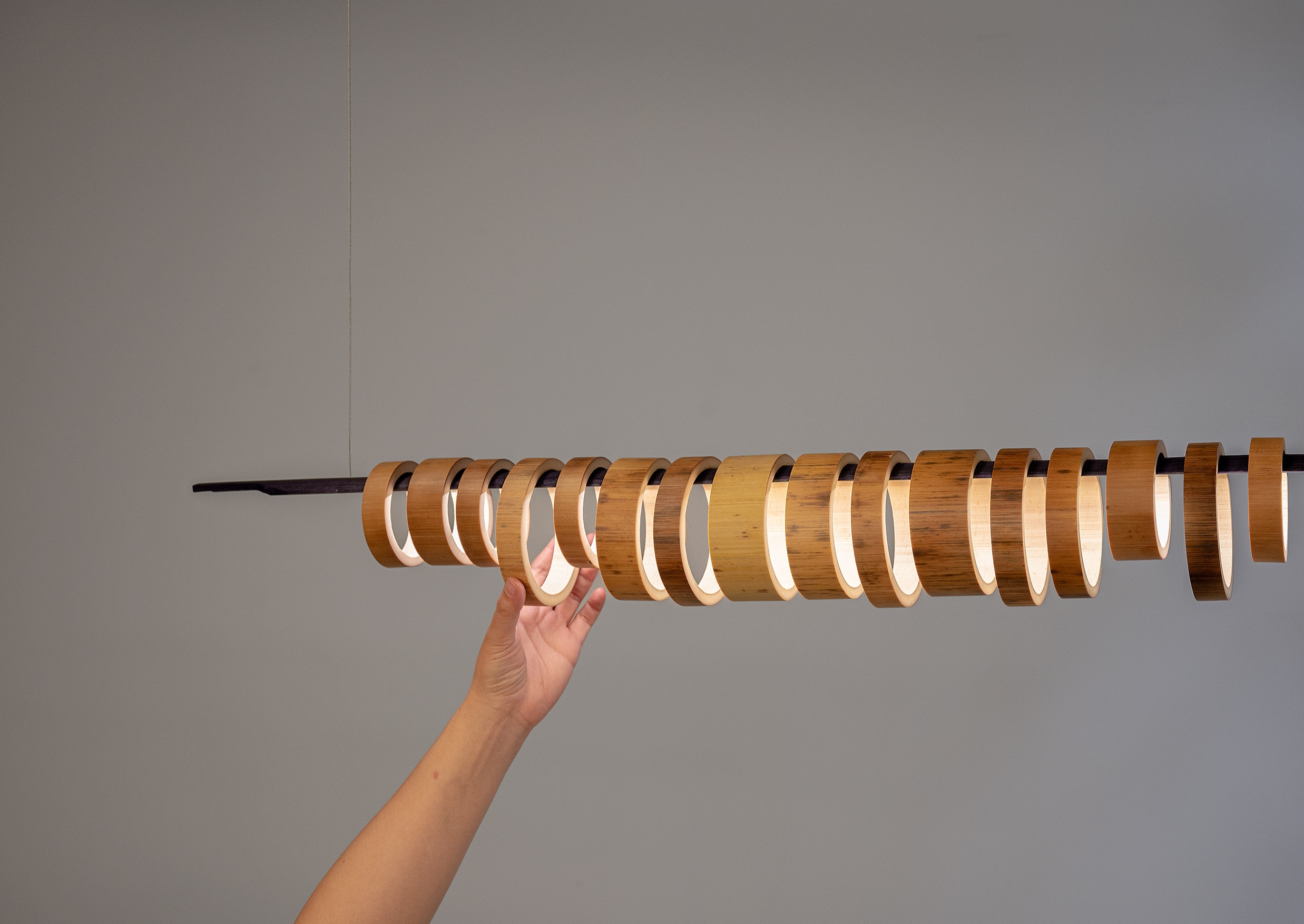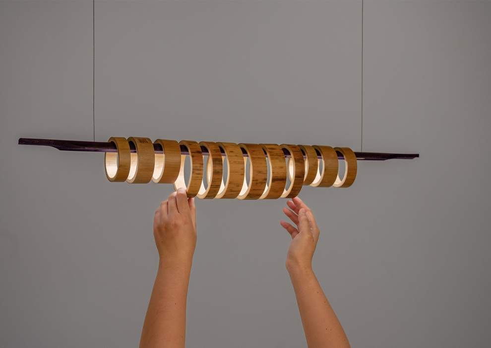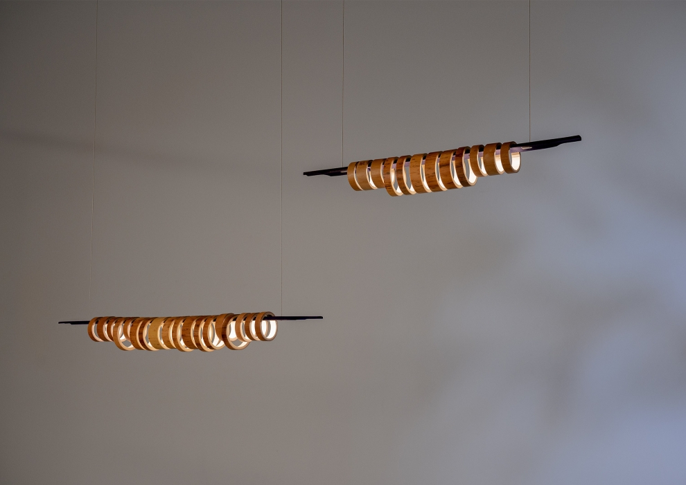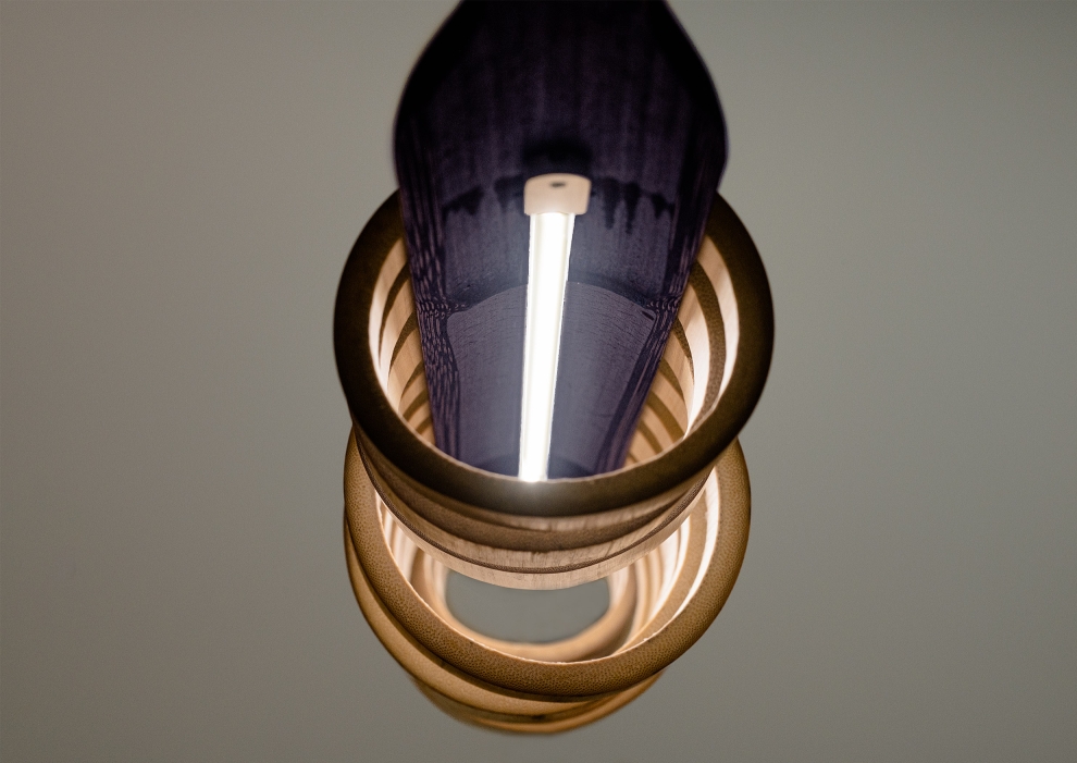 Virtue Aura combines two species of sustainable grass, strengthened through traditional heat curing processes and assembled with no glues or adhesives. Each pendant comprises a split, coloured, and machined quarter-stem with LED inlay juxtaposed with a series of Moso and Madake rings to diffuse the illumination. The result is a beautifully resolved luminous object that casts configurable light patterns upon the space it inhabits.