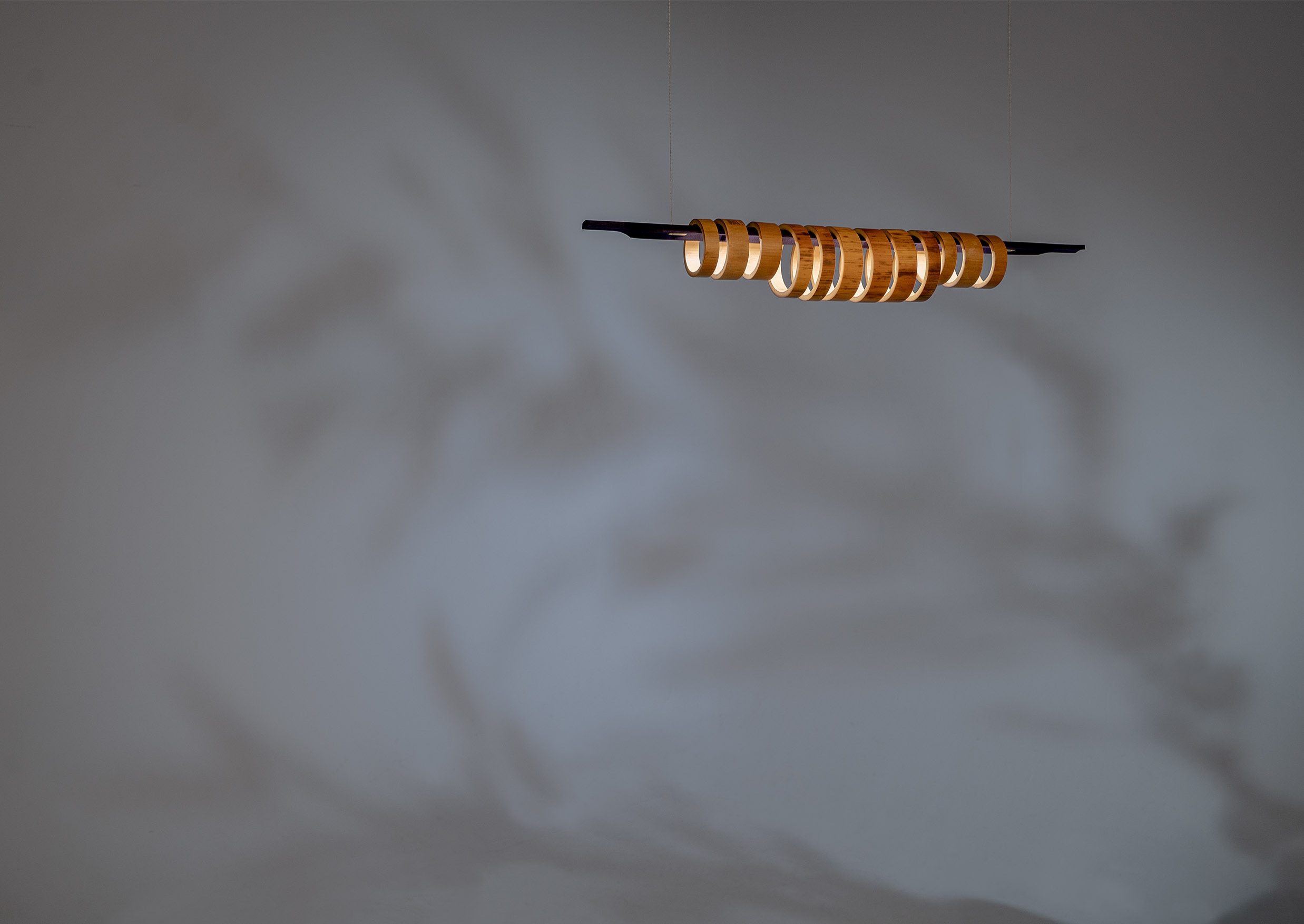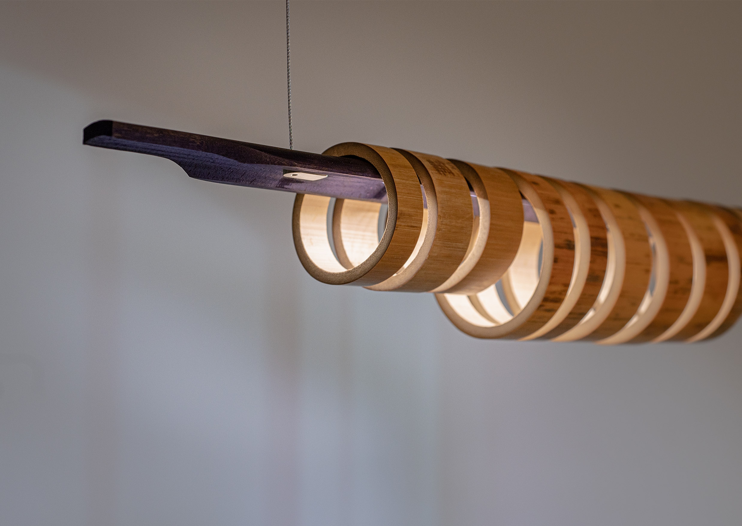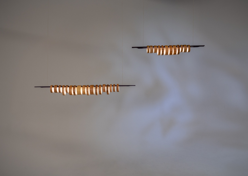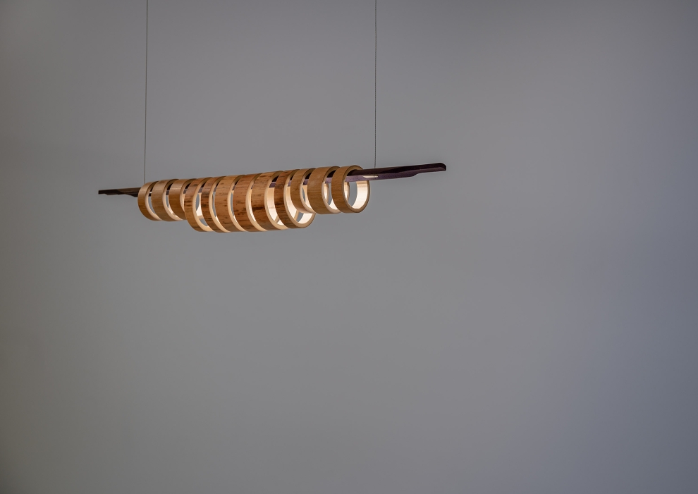 Virtue Aura combines two species of sustainable grass, strengthened through traditional heat curing processes and assembled with no glues or adhesives. Each pendant comprises a split, coloured, and machined quarter-stem with LED inlay juxtaposed with a series of Moso and Madake rings to diffuse the illumination. The result is a beautifully resolved luminous object that casts configurable light patterns upon the space it inhabits.
