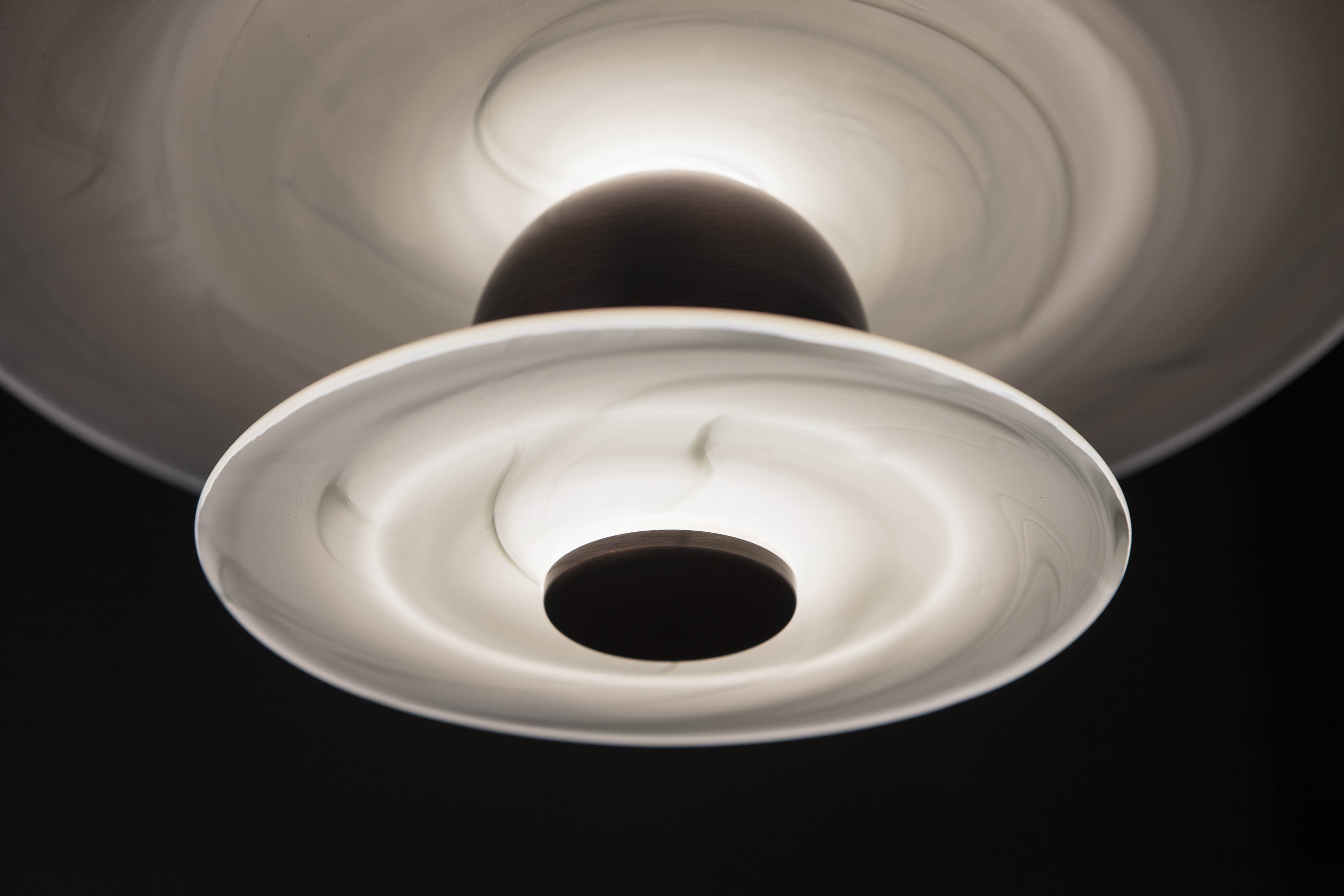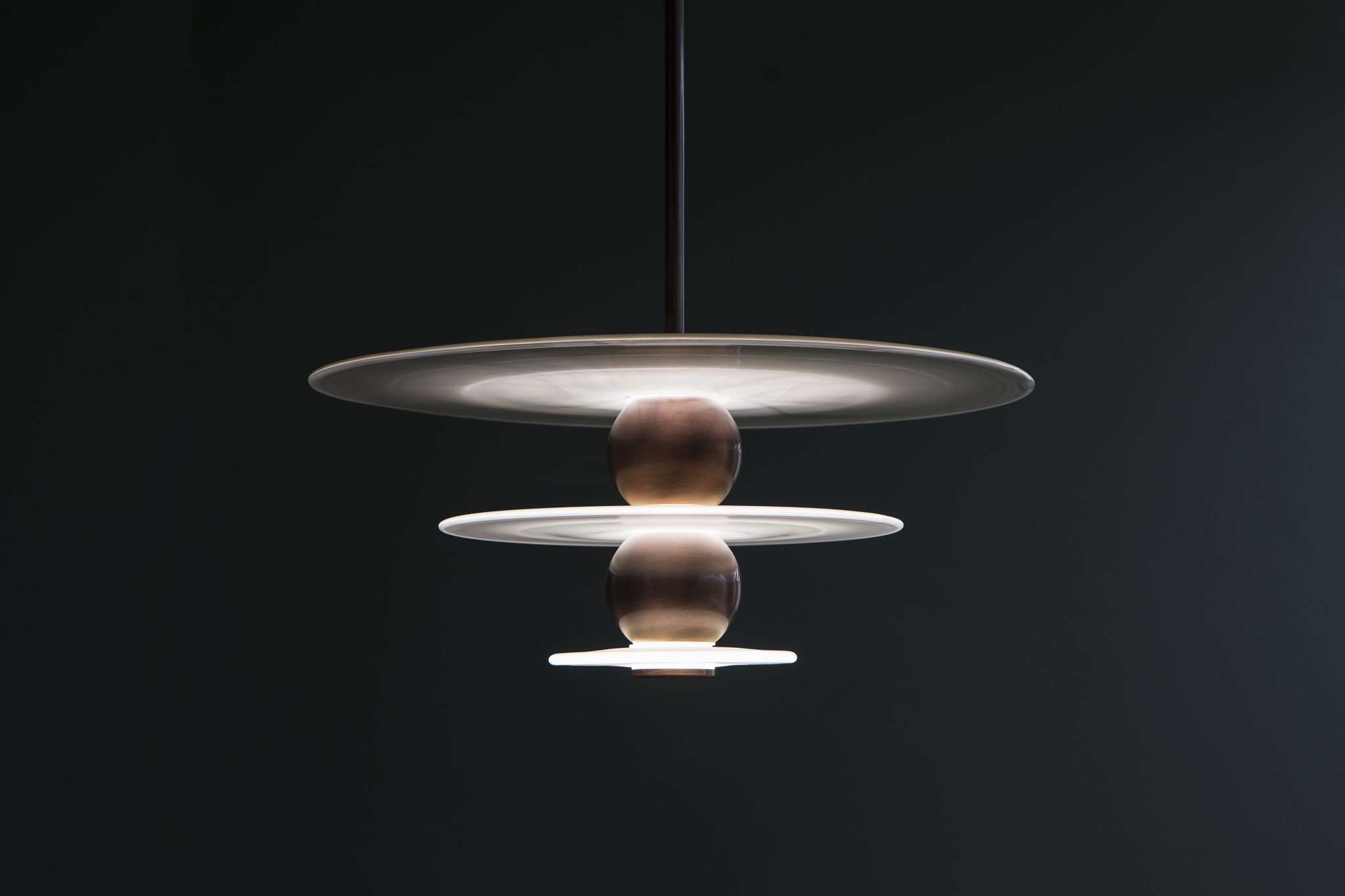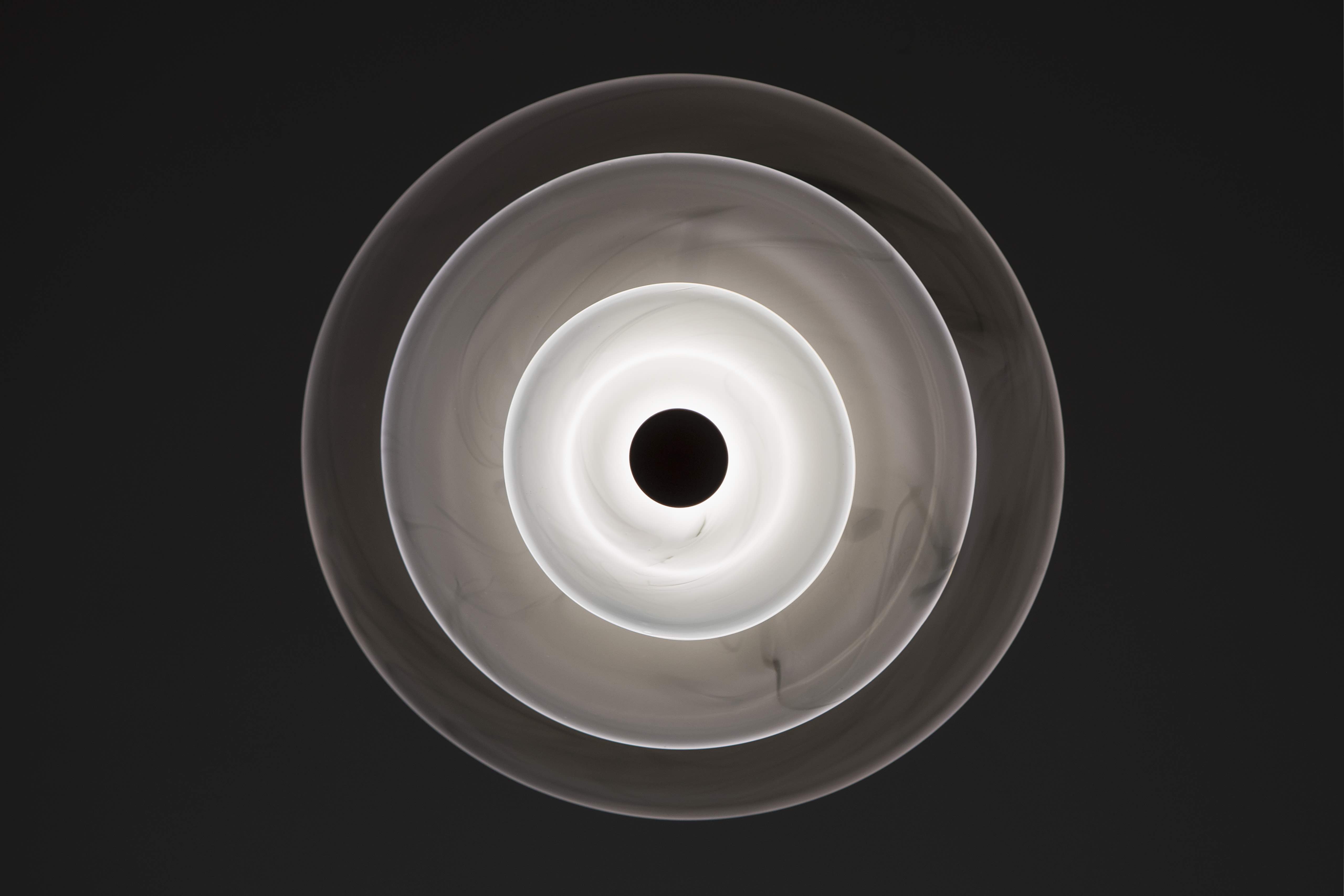 Inspired by the subtle hues and contours of the planets, the pendant comprises three hand-formed glass discs. Each of the glass tiers is unique in its intricate detail due to the nature of the hand-spun process, as pigment is dropped into the glass to produce a distinctive swirling effect. The centre of each glass element houses a ring of side emitting diffused LED, which emanates light outwards and accentuates the cloudy texture of the glass. The smaller the glass piece the more prominent the light, which creates a beautiful gradient from underneath.