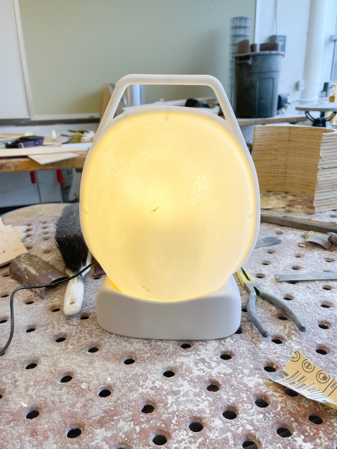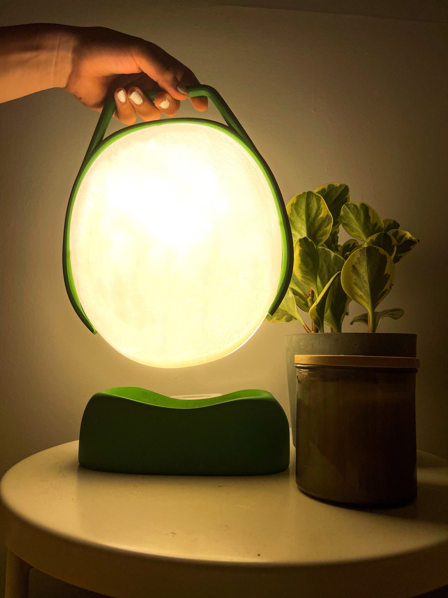 Lumo is a portable home lighting solution designed to brighten up night time routines. Many people need to finish various tasks at night, with anything from last-minute work to leisure; however, overhead lighting is often too harsh and stationery lights confine the user to a given workspace. Lumo's friendly form brings both portability and comfort to nighttime routines, giving you new possibilities to illuminate your life.