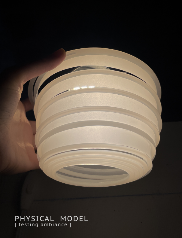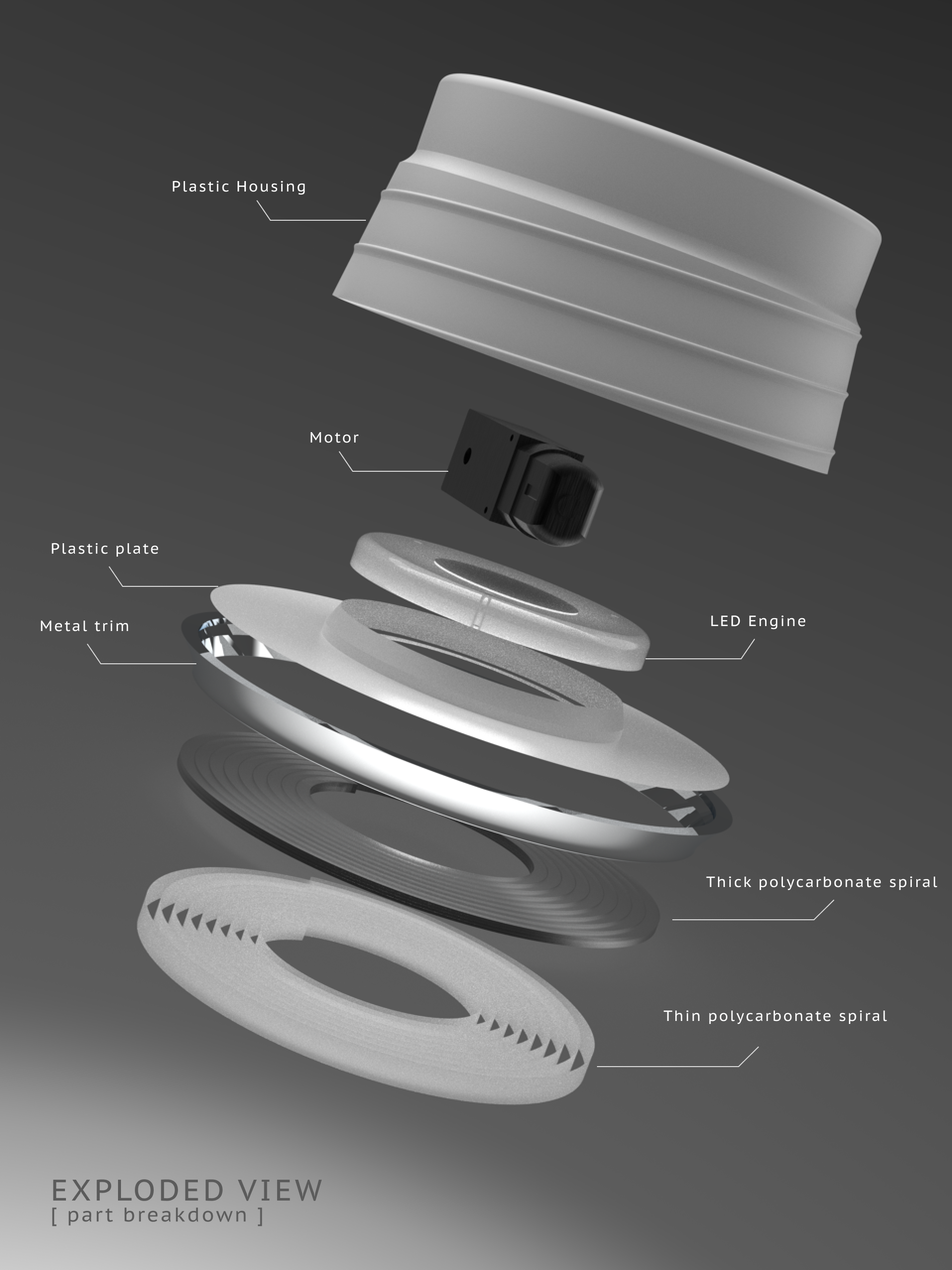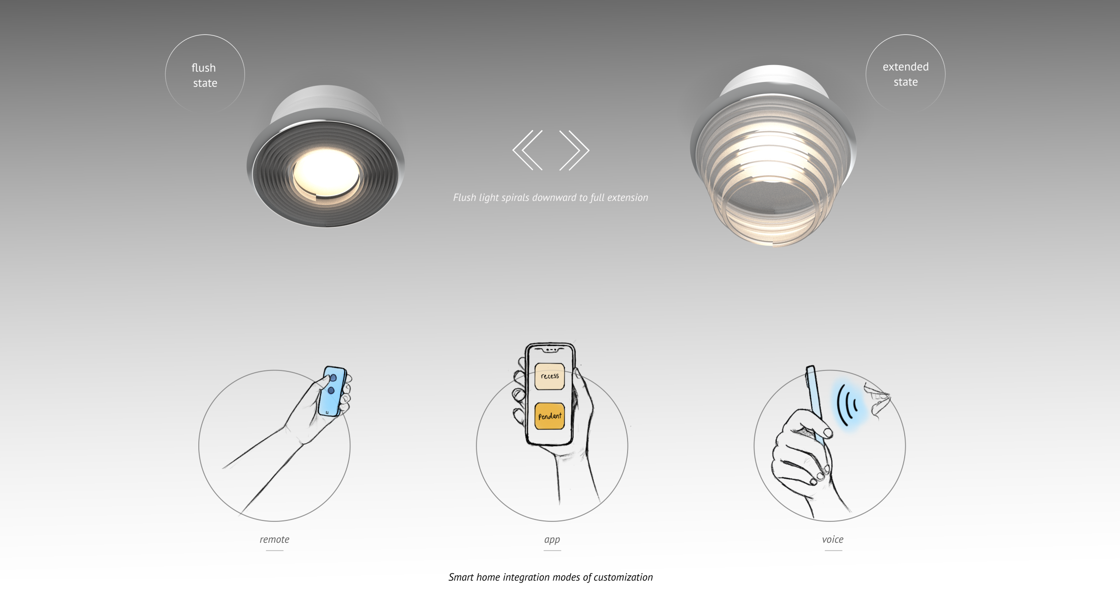 Current recessed lighting has a high performing function, but sacrifices aesthetics. Recessed lights are discrete spotlights, serving as primary source of light in most homes. Because they are flush, they open the space and always remain in style. However, recessed lights produce a static lighting environment: bright, boring lighting. My design will allow the user to change both the aesthetics of the fixture and the ambiance of the room, without compromising the functional integrity of current recessed lights. With smart home integration, the user may adjust their lighting based on mood, occasion, or space use.