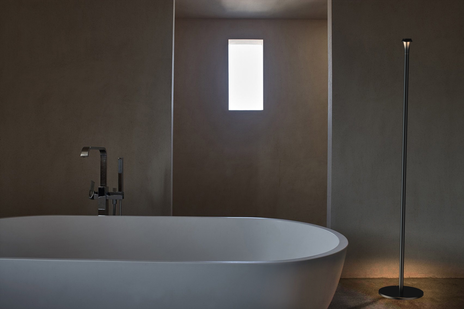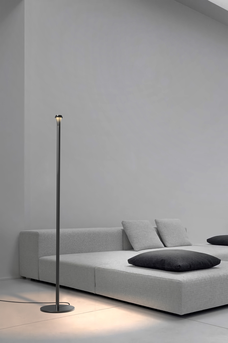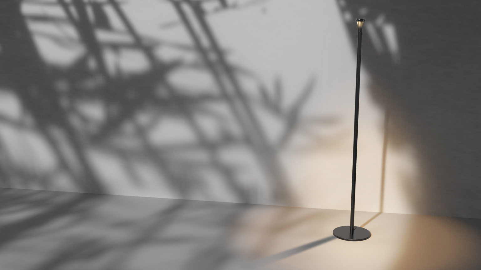 This floor lamp emits intense light to the ground through the top annular bulb and blocks part of the light with a 360 ° rotating light barrier to simulate the effect of a sundial on the floor.