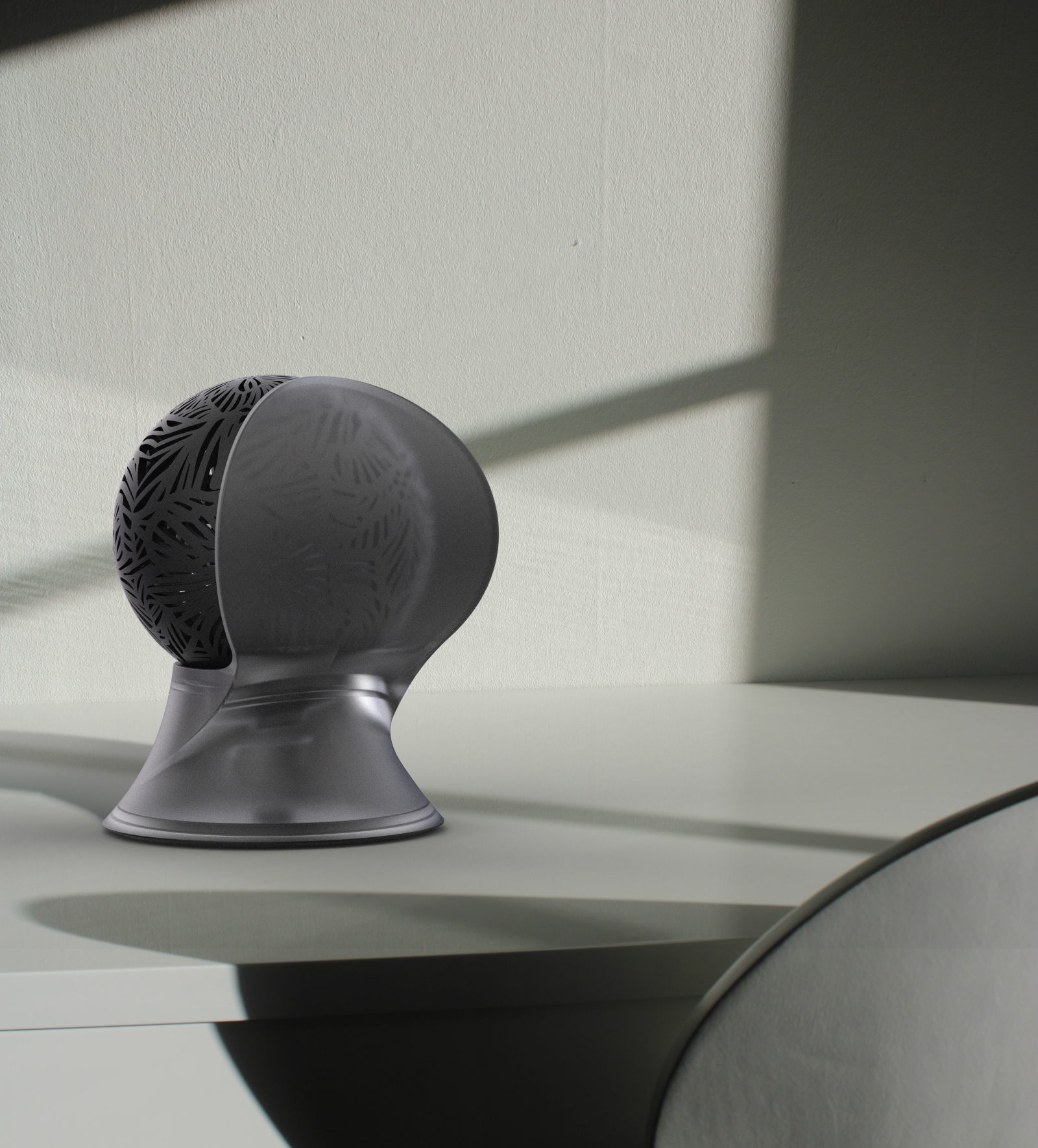 Divine is a decorative table lamp whenever lit up or off. By creating the magic relationship between light and shadow, corners will be filled with elegant floral patterns. It is a portal to bring us to a new divine world.