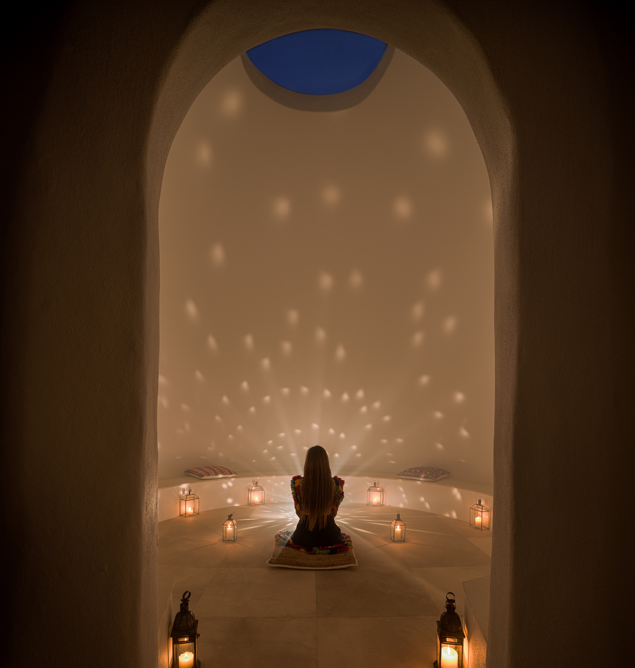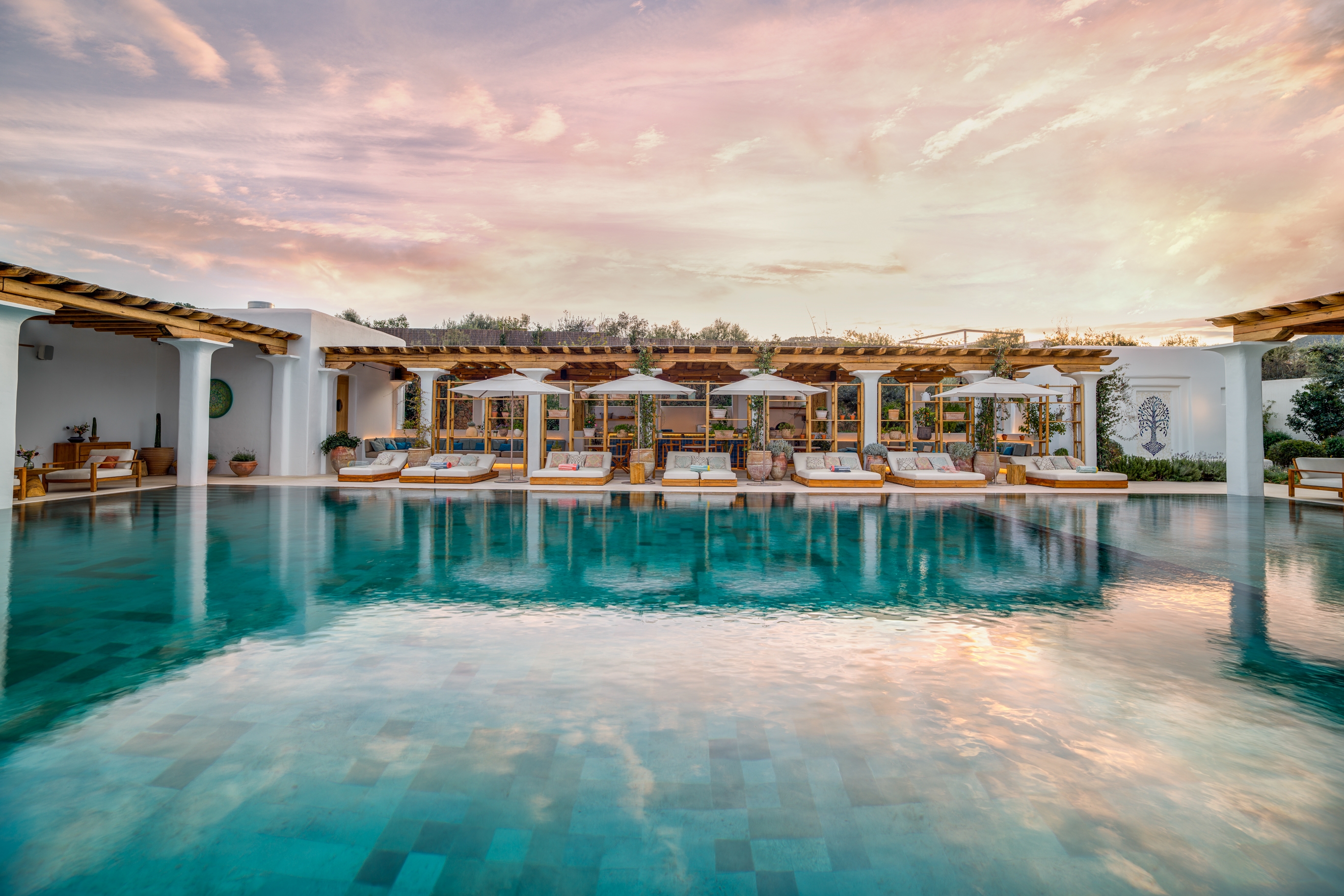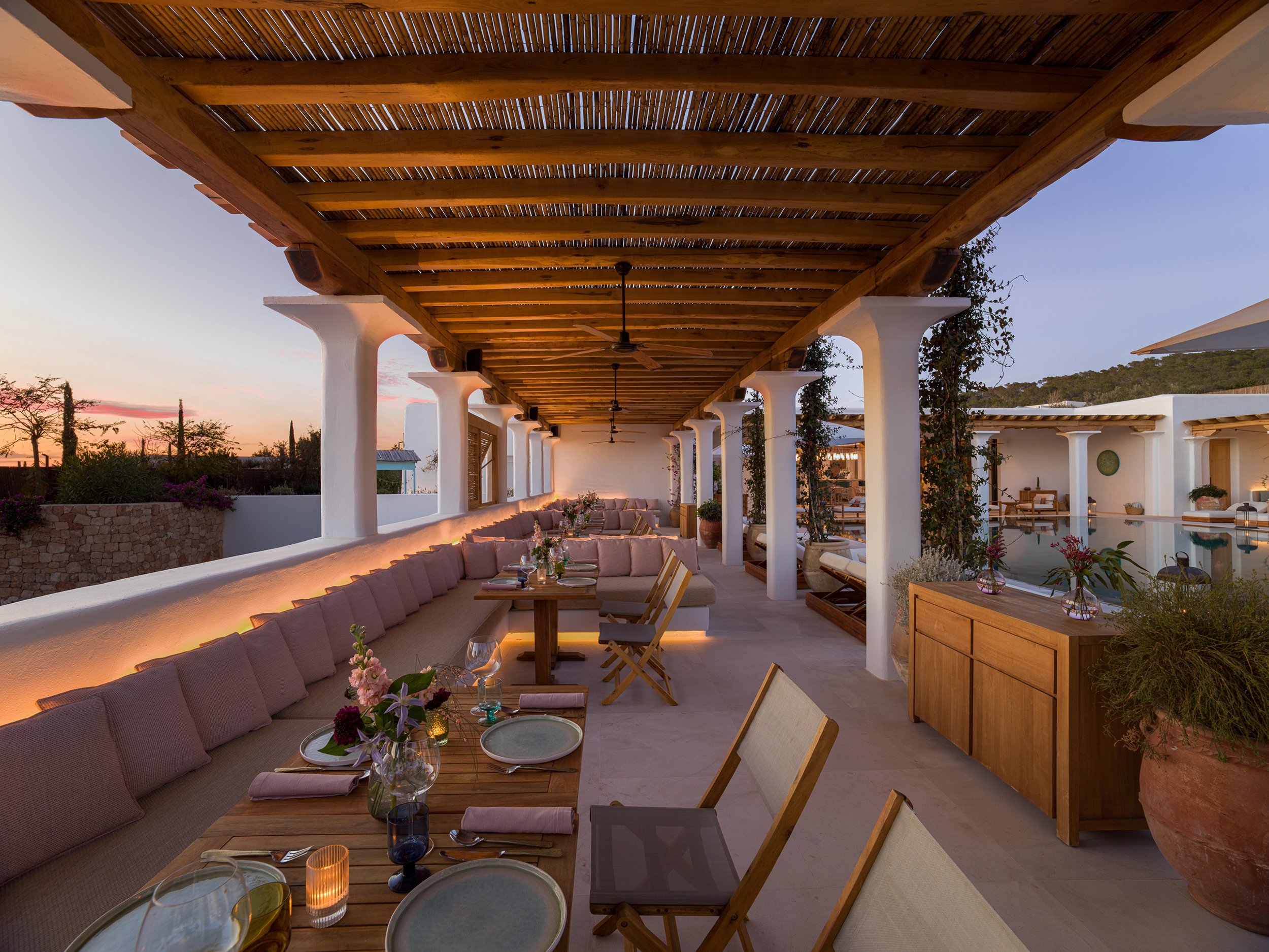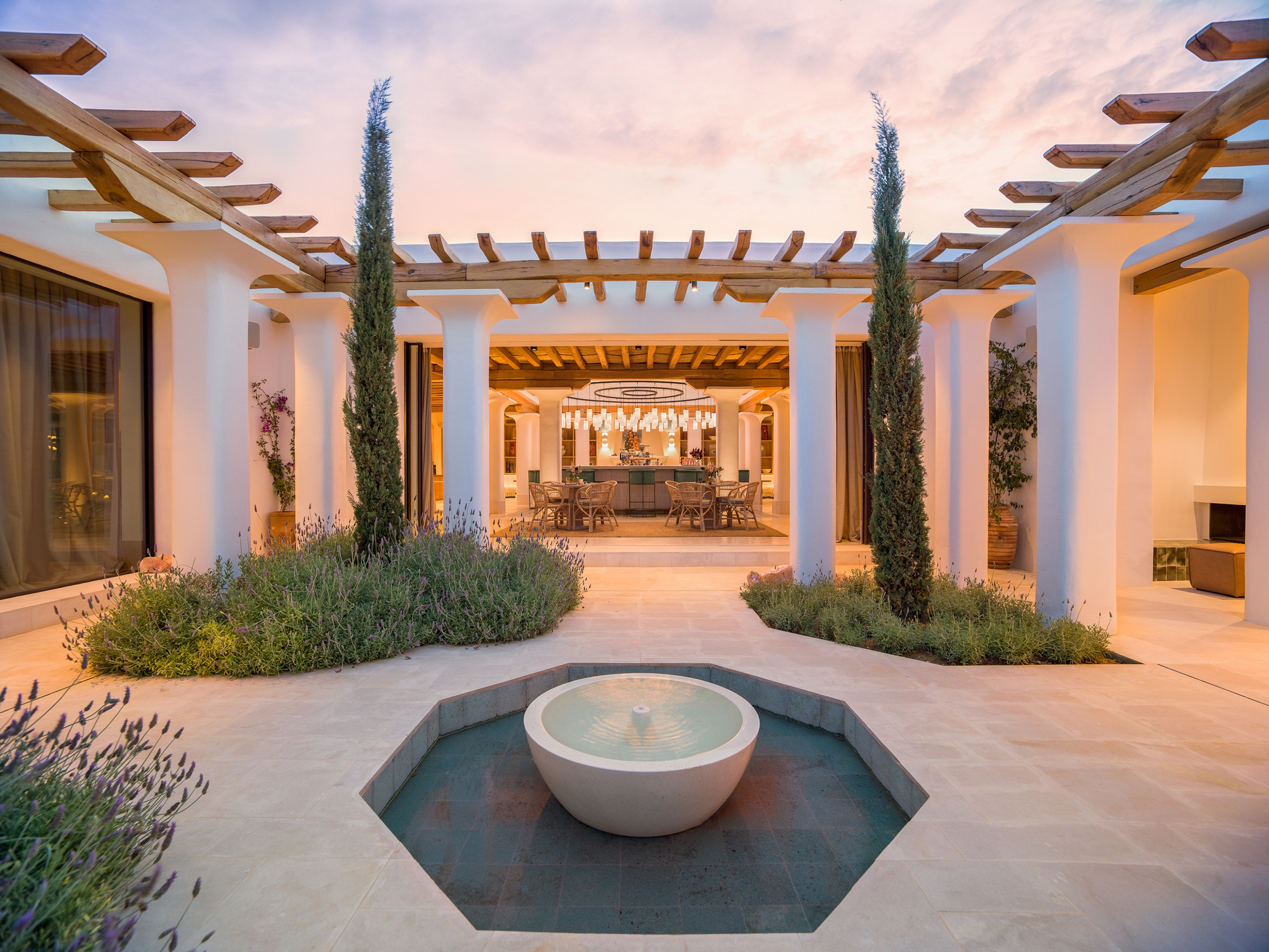 Our goal: Ensure a soothing environment for visitor and guest to be able to relax, which we achieved thru ceiling surface mount downlights at exposed wood ceilings of restaurant and bar, and thru integrated lighting at ledges and seating that wash adjacent surfaces, planters and pools.