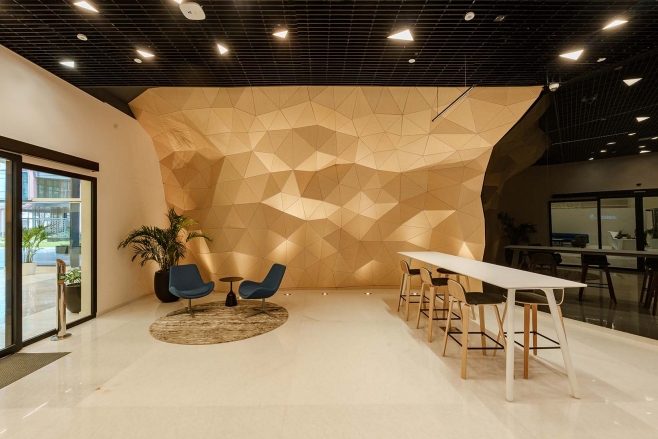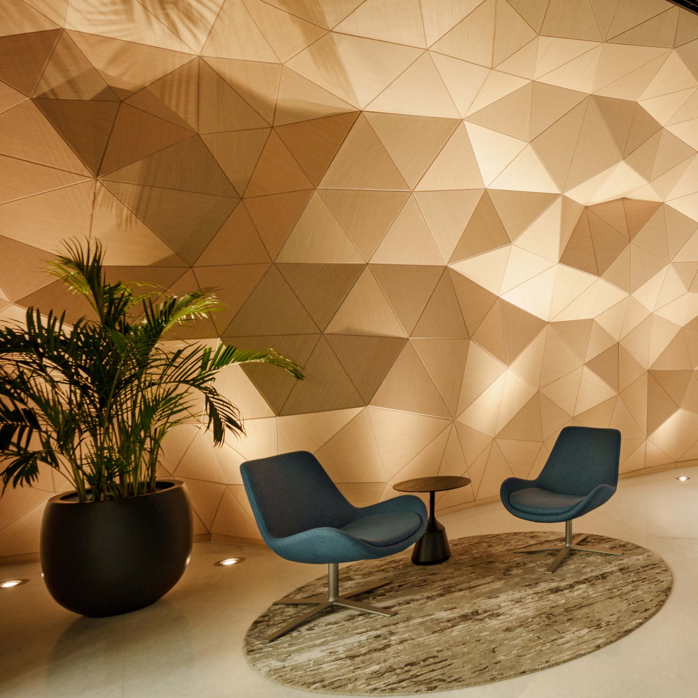 Wood panel is a primary material in the Arrival space which brings a lot of warmth into the space. General lighting is used and these are tunable and dimmable for energy efficiency and to avoid a glare effect, also triangular downlights are created with micro prismatic covers. The project is certified with a LEED certificate for contribution towards the mindful use of sustainable materials.