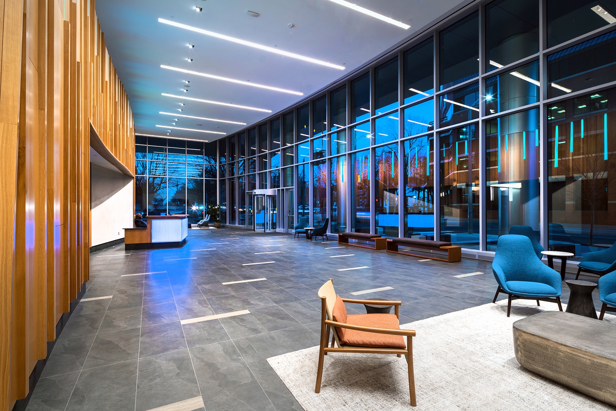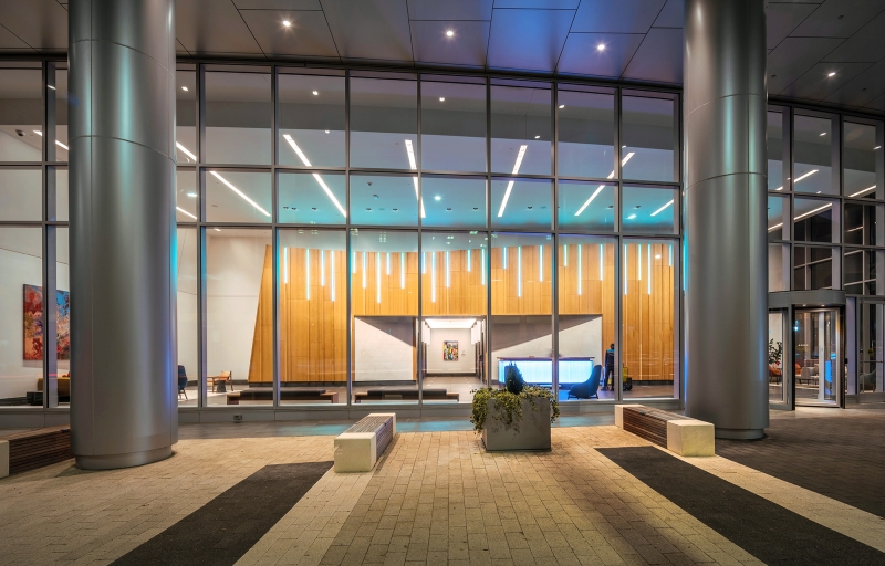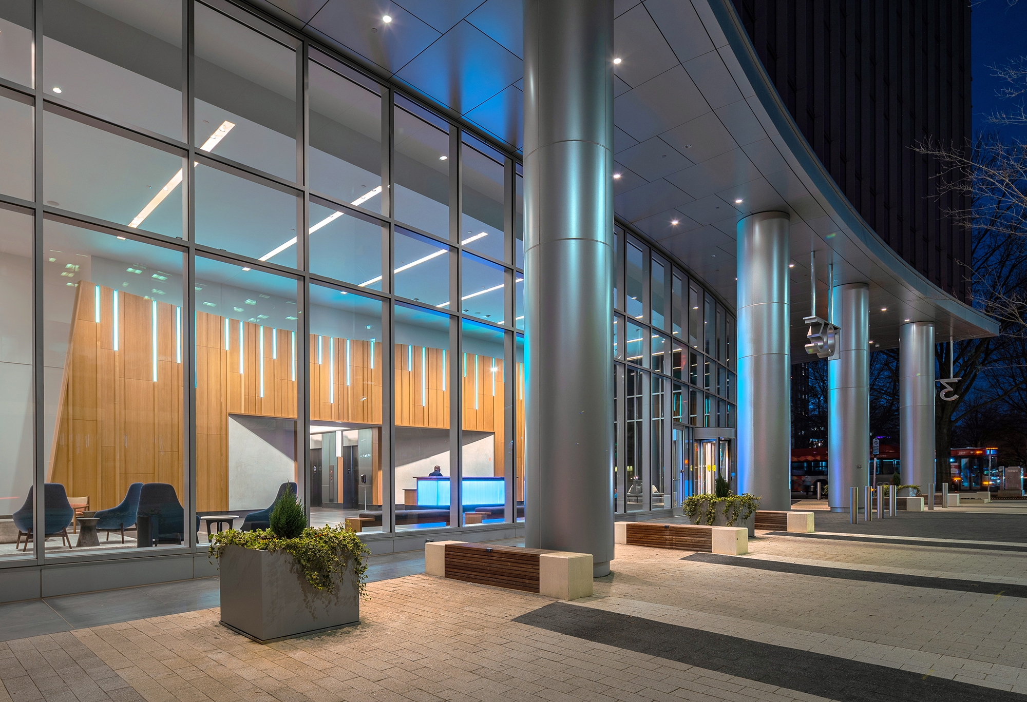 Entry DescriptionImage_001: The Lobby lighting of this sleek, LEED gold certified tower underscores the transparency of the curtain wall glass, dissolving the boundaries between the interior space and the gracious plaza outside.