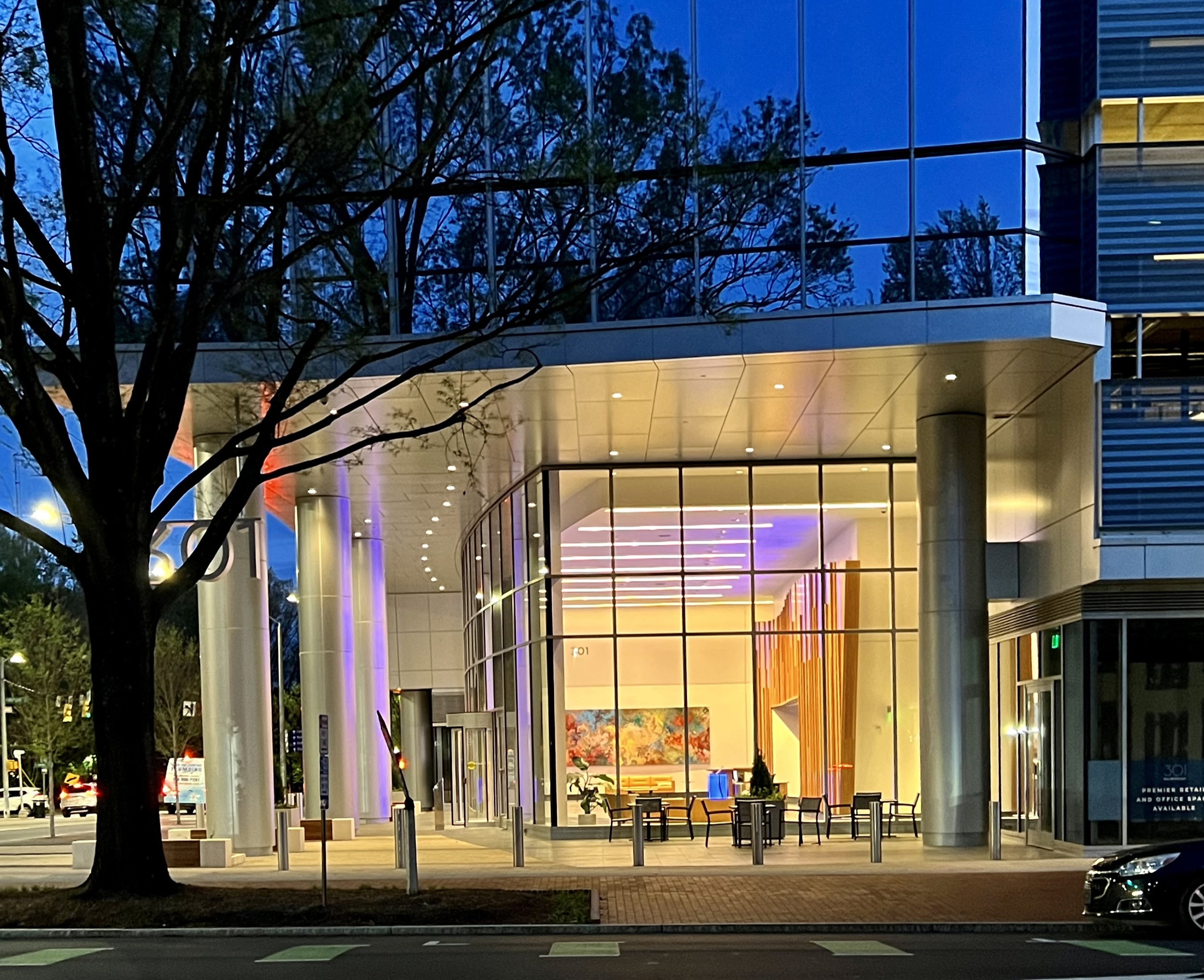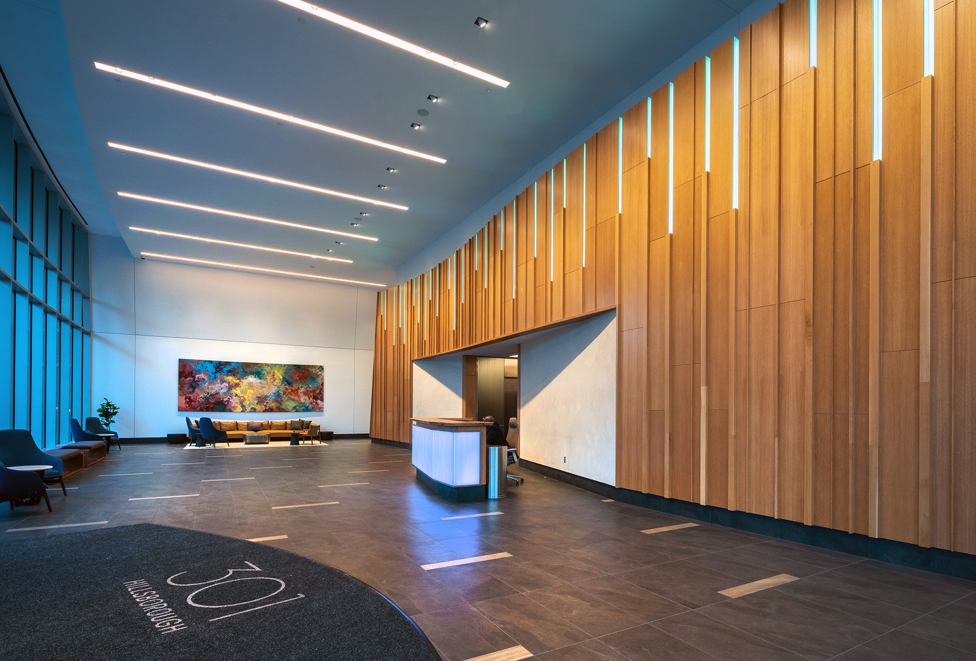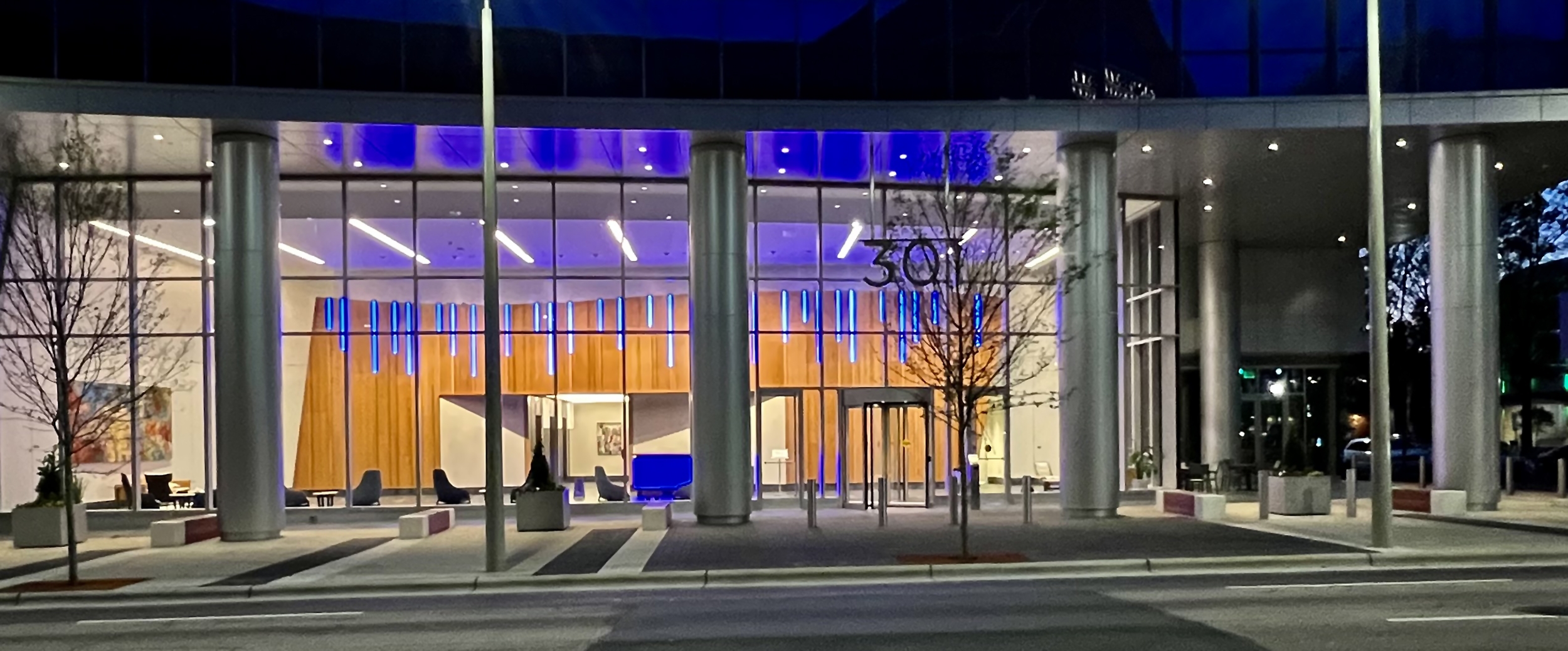 Entry DescriptionImage_001: The Lobby lighting of this sleek, LEED gold certified tower underscores the transparency of the curtain wall glass, dissolving the boundaries between the interior space and the gracious plaza outside.