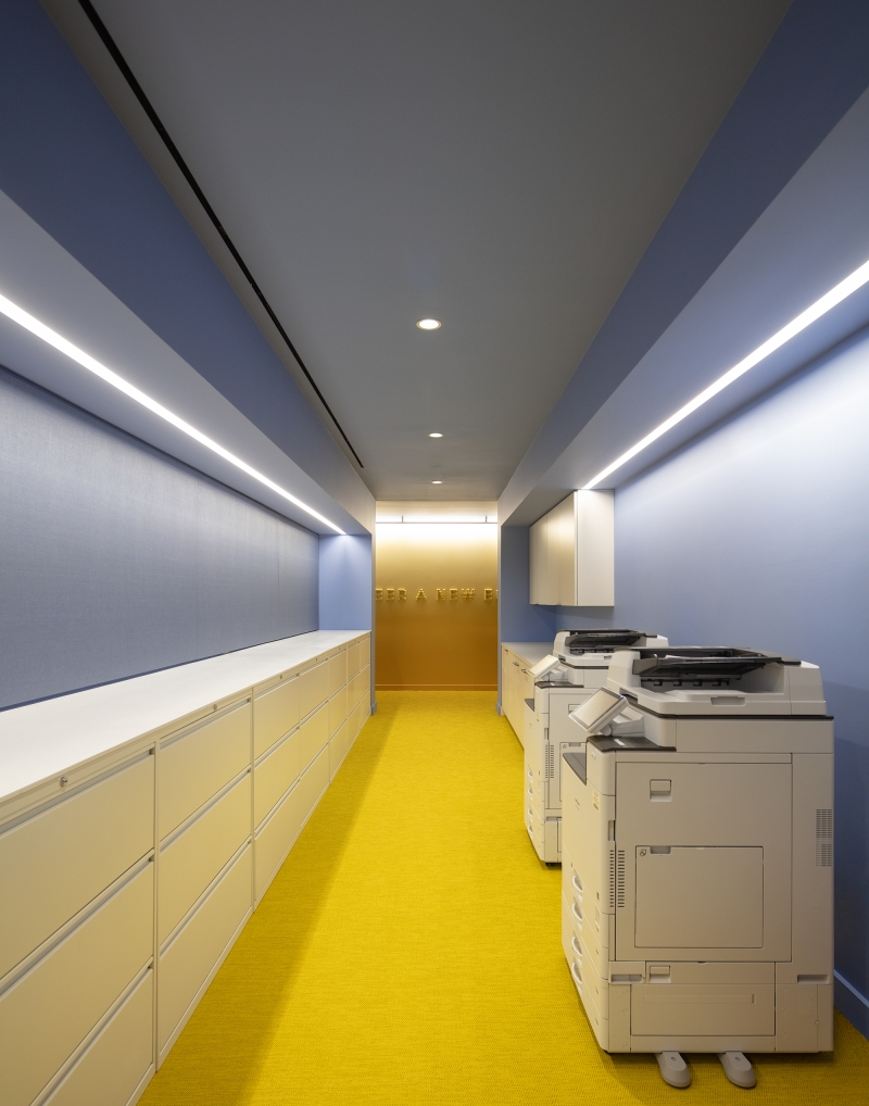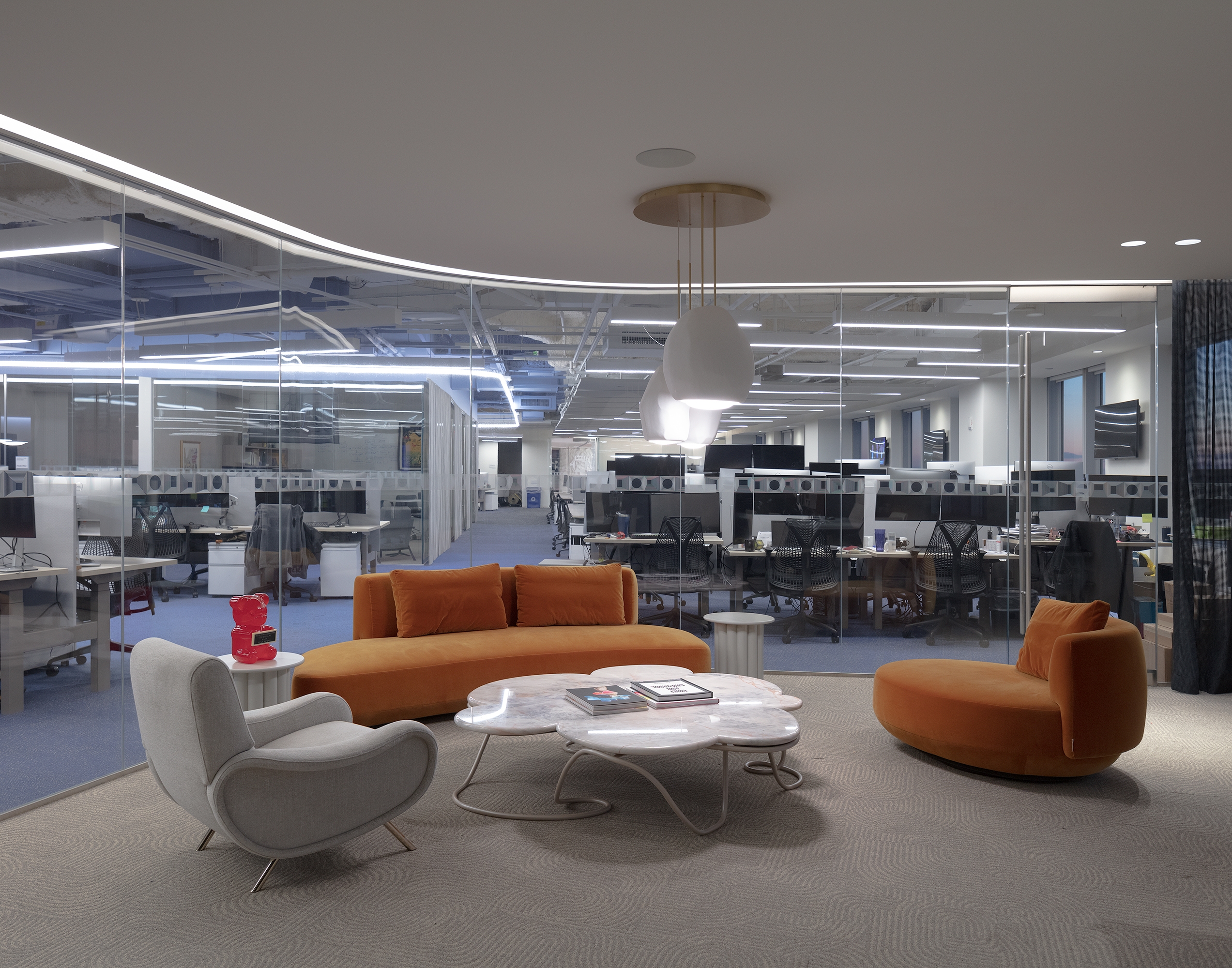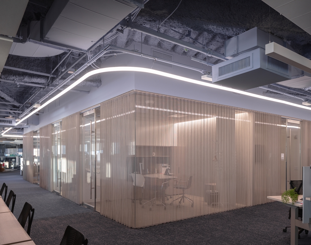 Upon arrival to the elevator vestibule, a bright media screen recessed into a dark ceiling creates a visual impact. Soft, whimsical lighting emanates through the glass doors, inviting guests into the formal lobby where layers of light draw attention to architectural surfaces and objects. Round mirrored pendants reflect light backward, bringing awareness to face-to-face communication. The juxtaposition of soft vertical and bold sculptural lighting creates diversity and relief amidst the repetition of existing fixtures. Movable chain-link curtains at the private office perimeter are illuminated from both sides, emphasizing the “scrim nature” of the material which can be opaque or translucent, depending on the level of privacy desired. Separate dimming features allow personalized controls at each office.