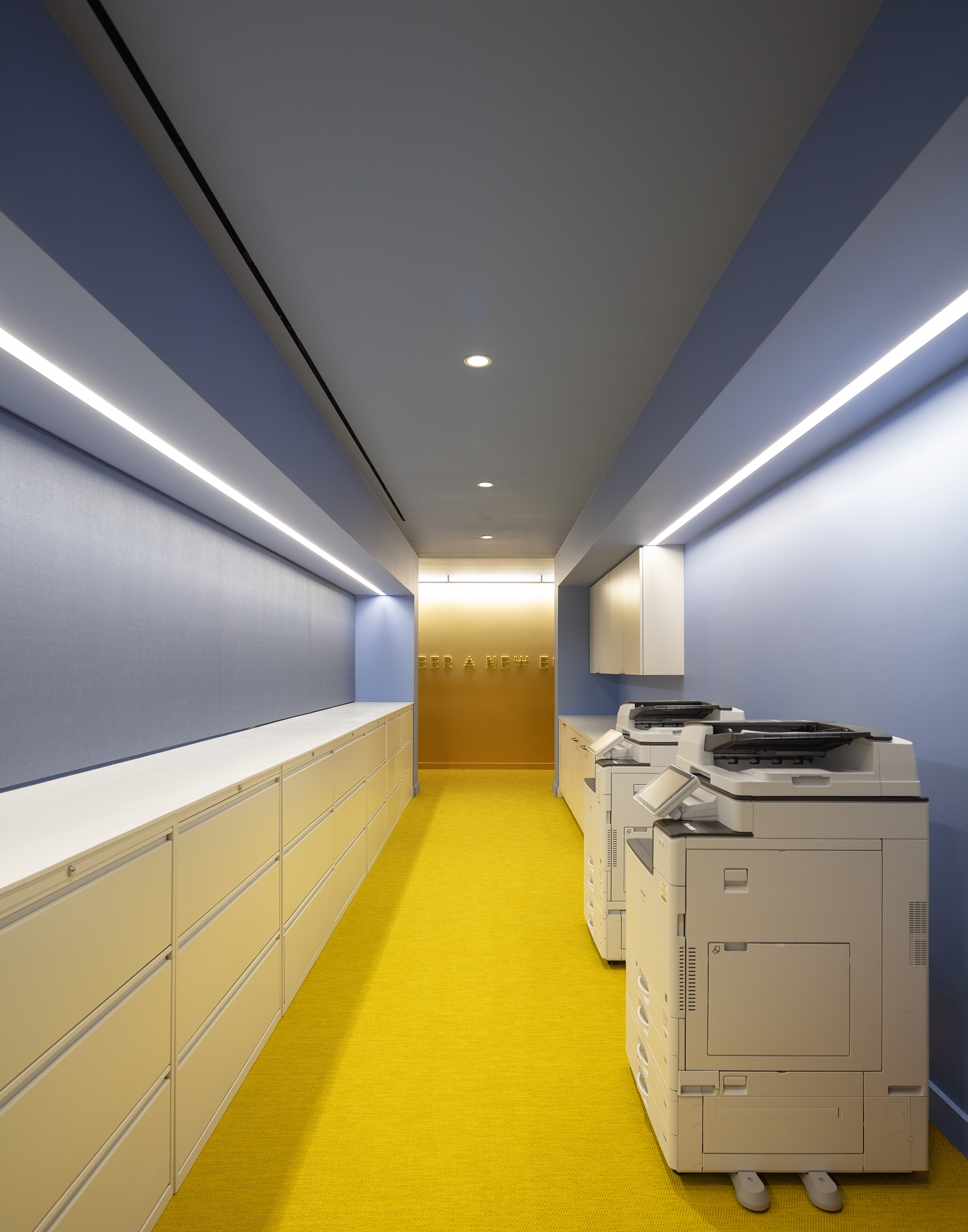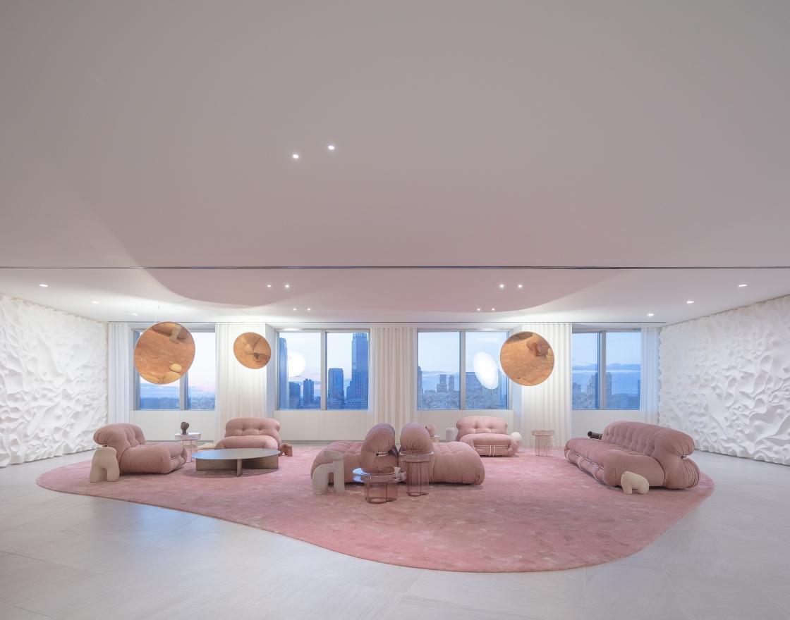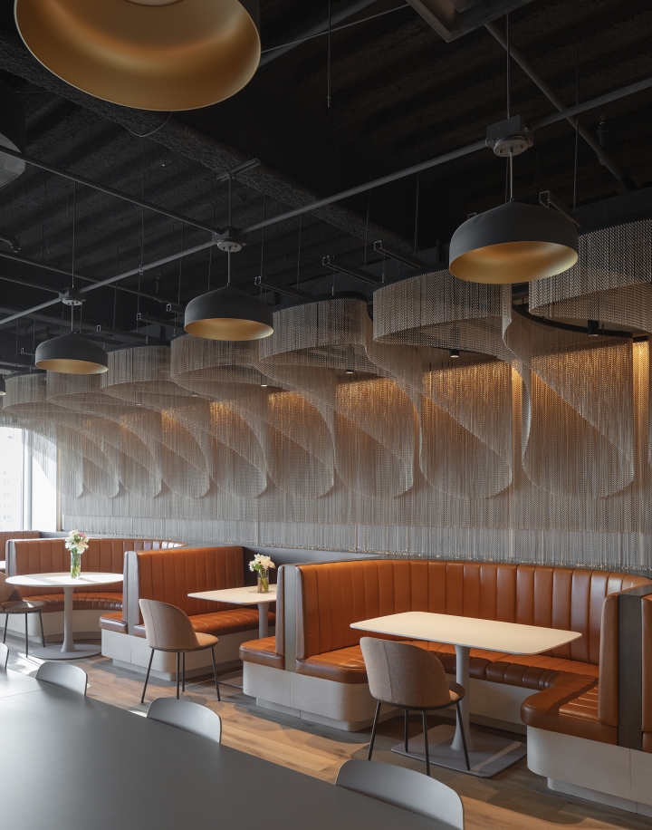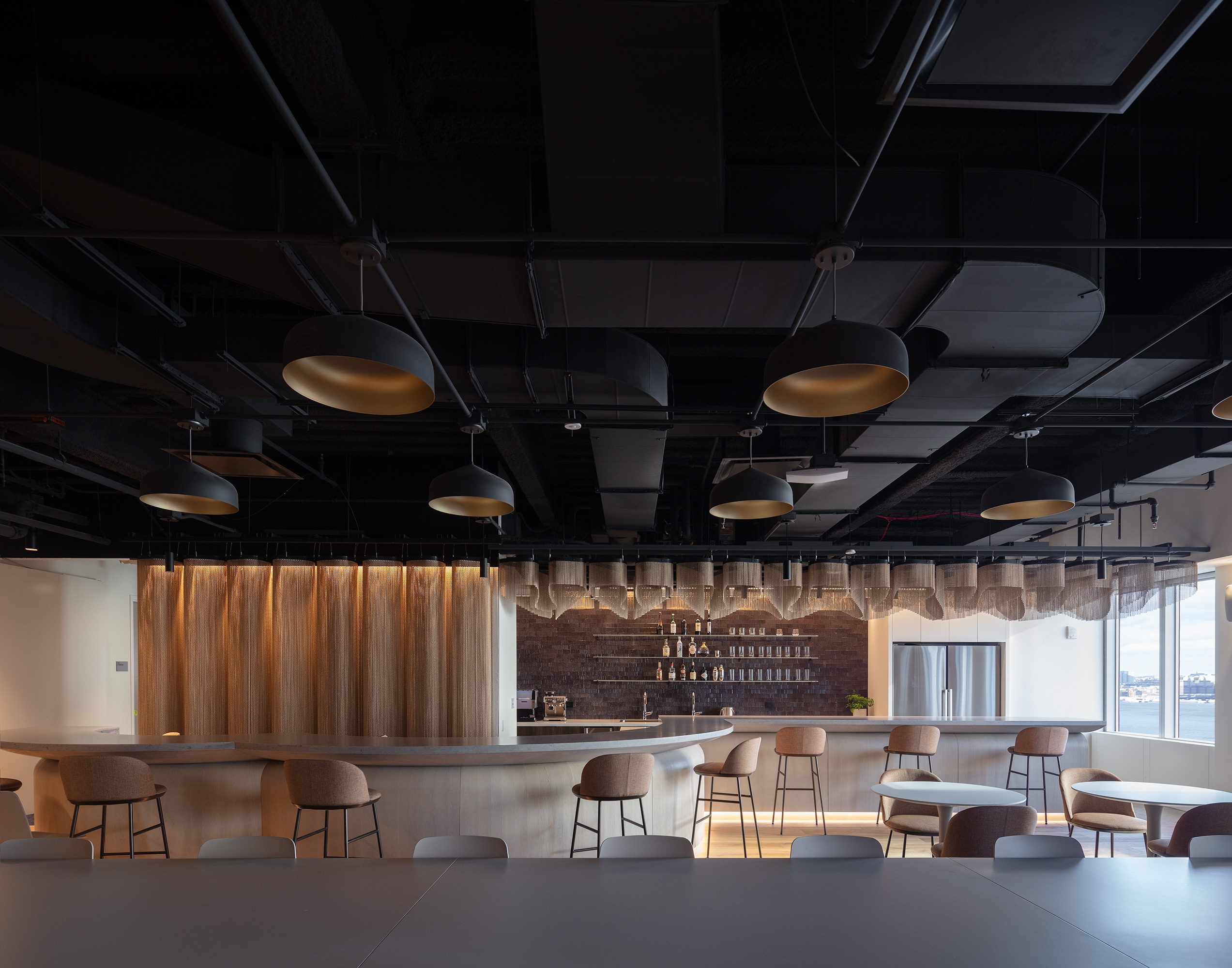 Upon arrival to the elevator vestibule, a bright media screen recessed into a dark ceiling creates a visual impact. Soft, whimsical lighting emanates through the glass doors, inviting guests into the formal lobby where layers of light draw attention to architectural surfaces and objects. Round mirrored pendants reflect light backward, bringing awareness to face-to-face communication. The juxtaposition of soft vertical and bold sculptural lighting creates diversity and relief amidst the repetition of existing fixtures. Movable chain-link curtains at the private office perimeter are illuminated from both sides, emphasizing the “scrim nature” of the material which can be opaque or translucent, depending on the level of privacy desired. Separate dimming features allow personalized controls at each office.