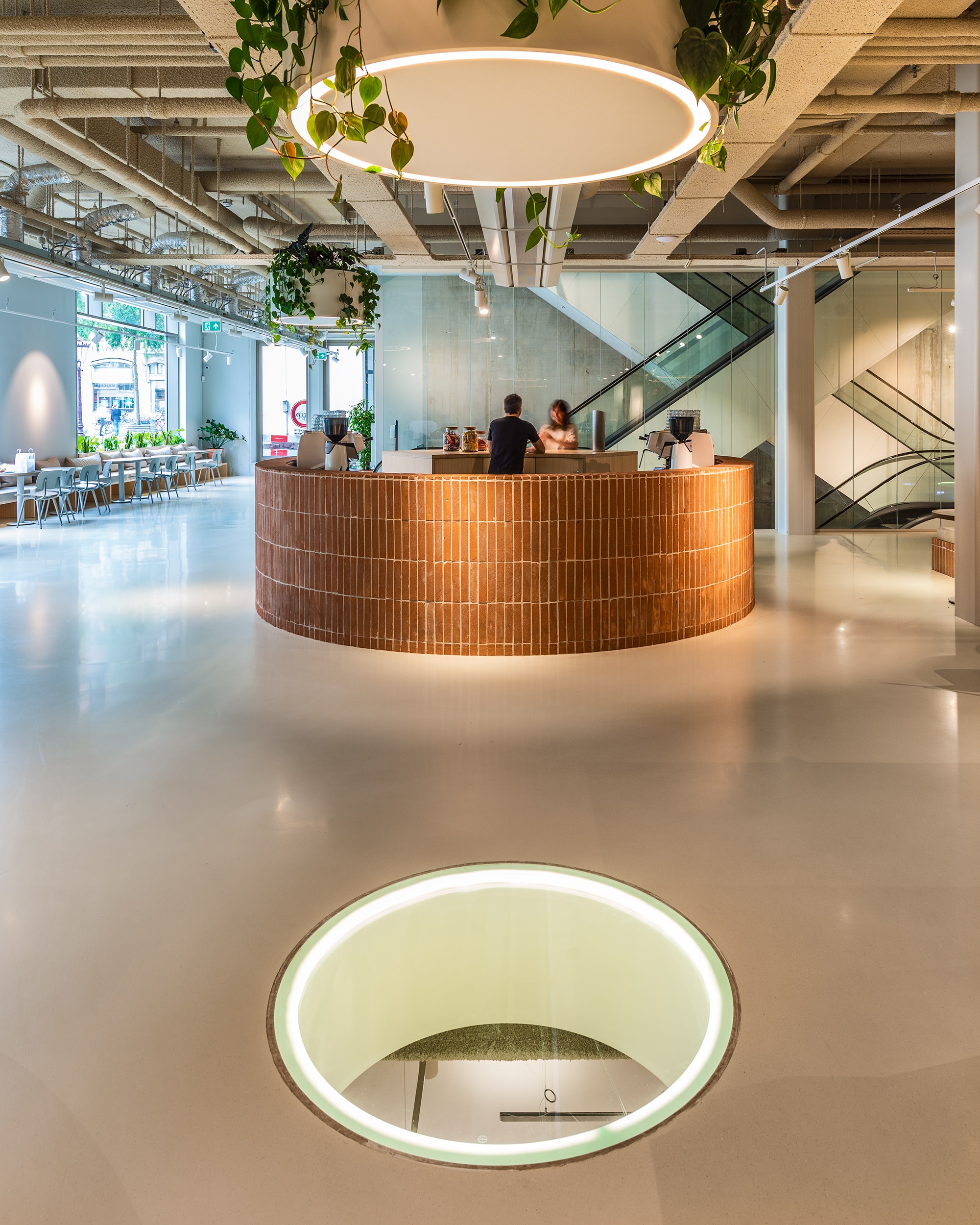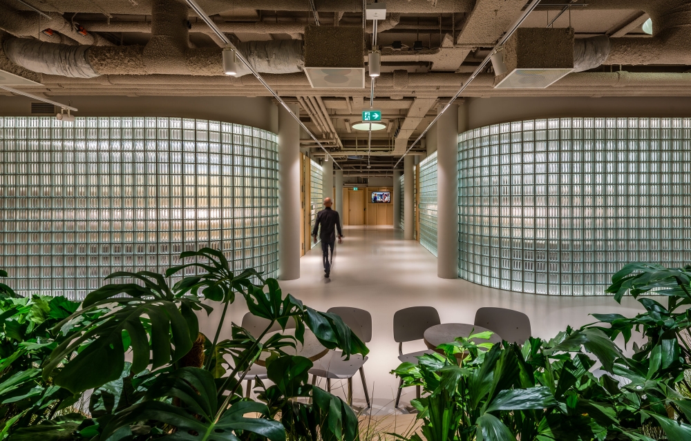 The building is directly connected to a metro station in the basement, where meeting spaces shine like lanterns thanks to the glass bricks and special interior lighting.
