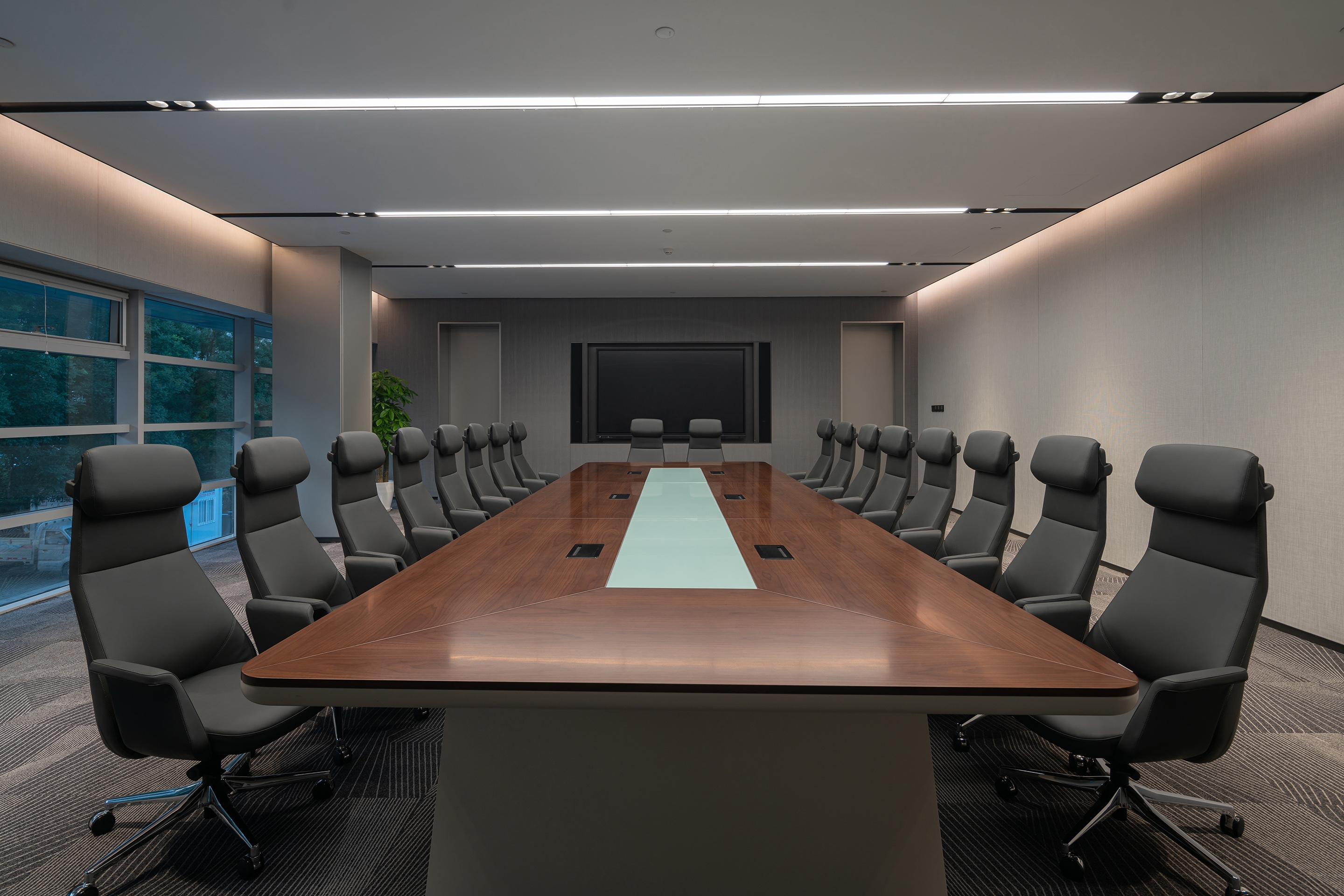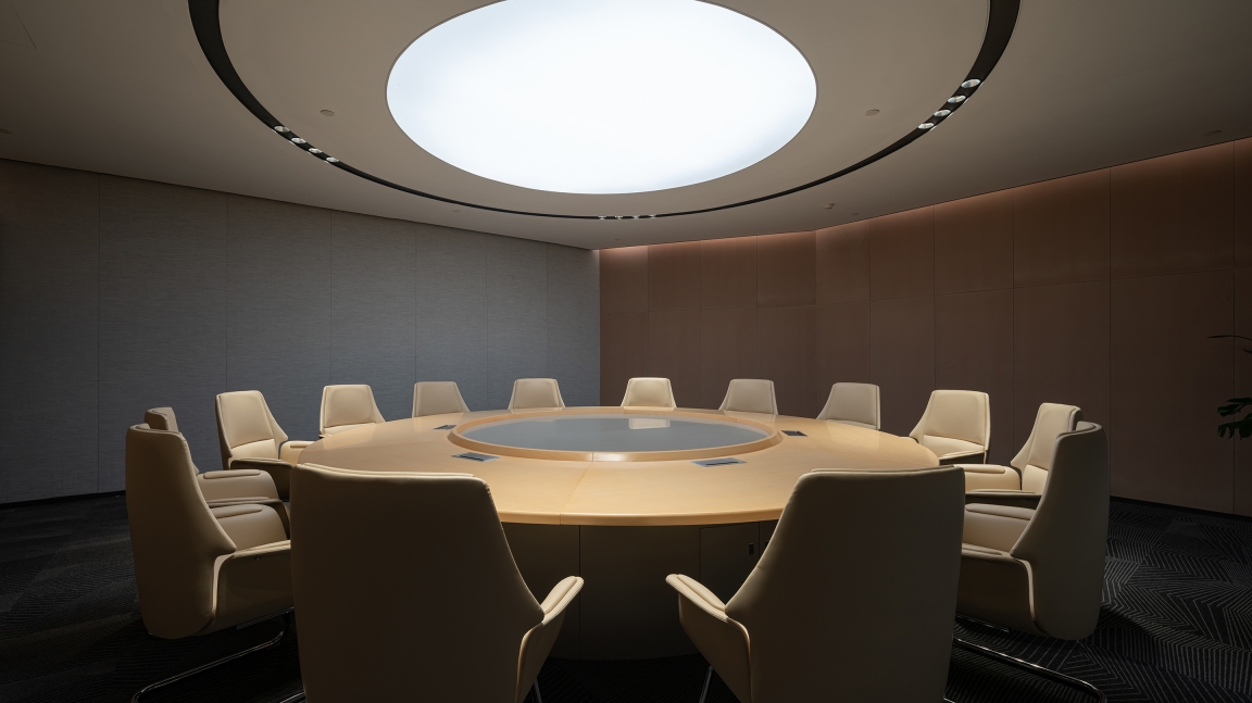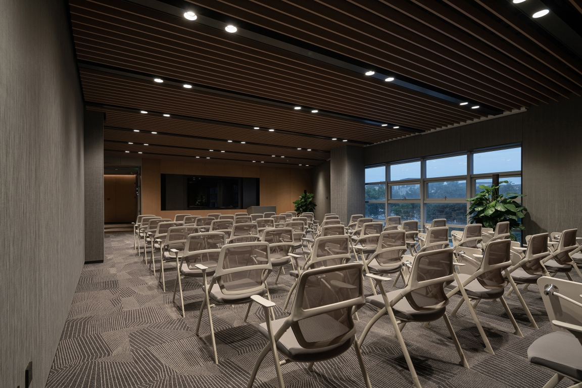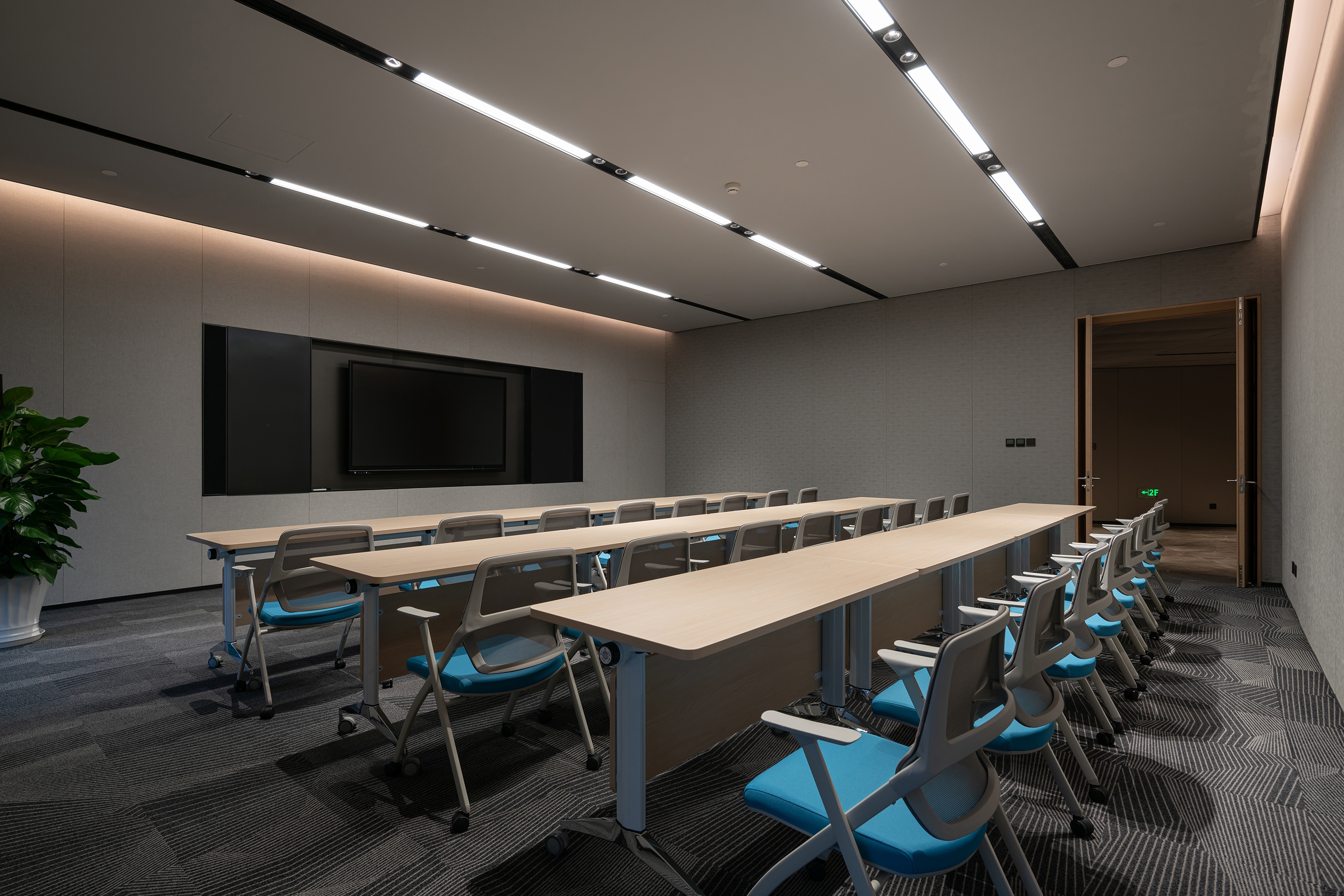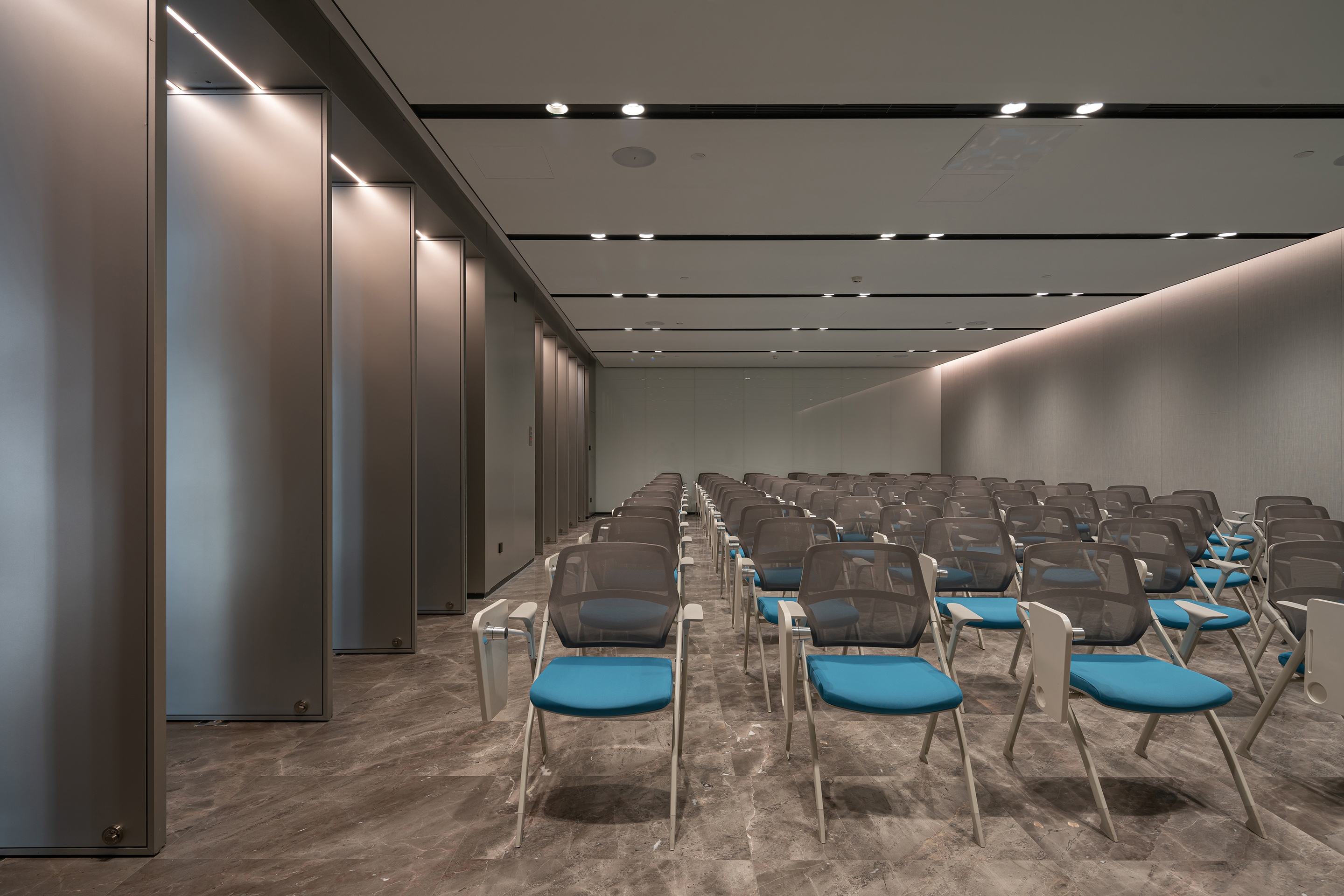 As an open training room, a bright and energizing atmosphere is crucial for maintaining focus and clarity. The circular backlit stretch screen ceiling in the conference space is both functional and aesthetically pleasing, serving as a visual focal point. The addition of accent lighting on the tables and chairs elevates the overall ambiance of the space.