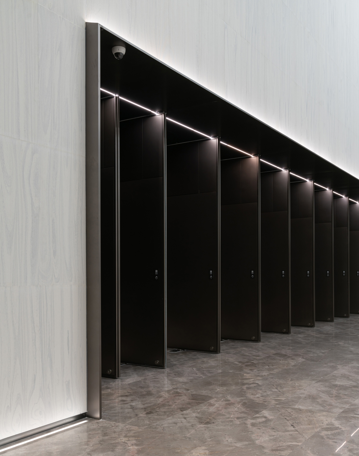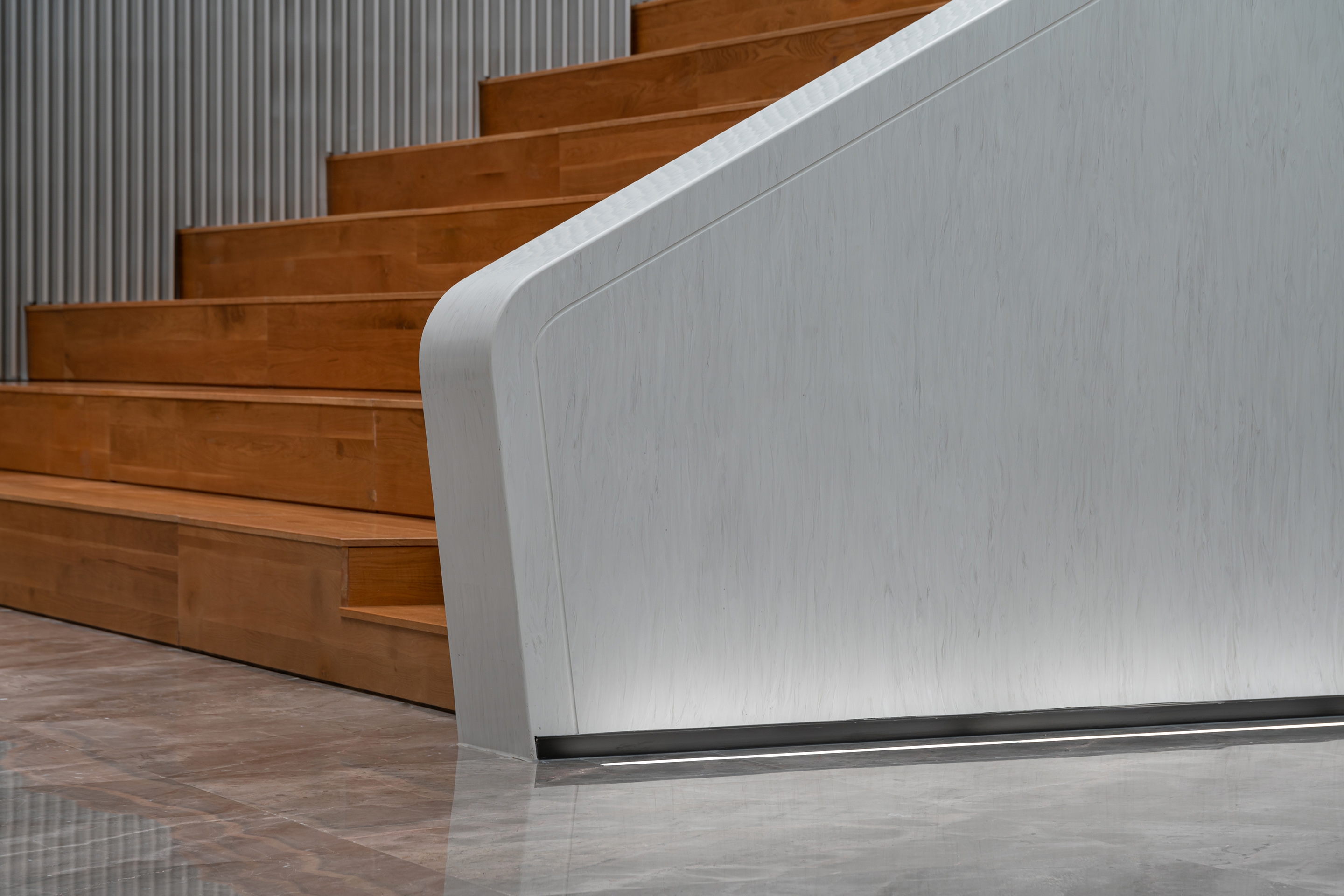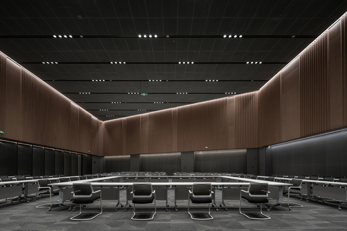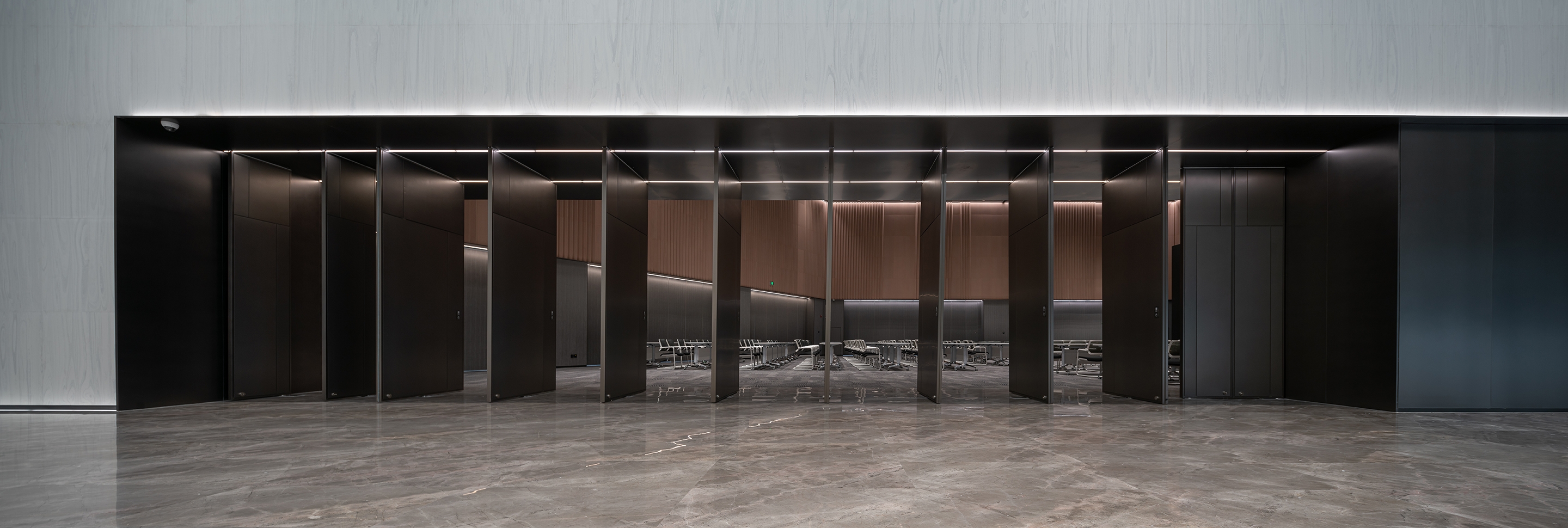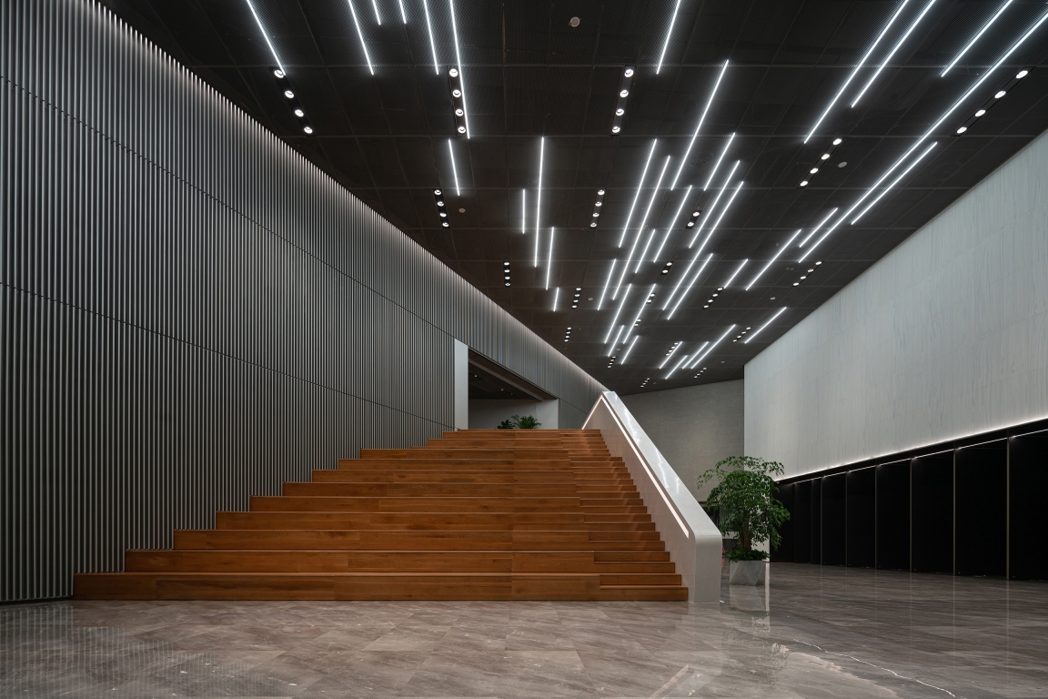Entry DescriptionThe first space that catches our eye is the modern and innovative atrium area. The entrance of the multi-functional hall is illuminated by strip lights, which enhance the modern, technological atmosphere of the space, and bring attention to the metal door panel material. The design of the multi-functional hall incorporates a layered and textured concept through the use of various materials and shapes.