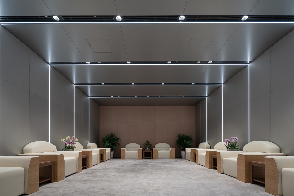 In the VIP reception room, the combination of lines and surface elements creates a unique and modern space. The lighting technique focusing on points and lines adds depth and dimension to the space, creating a reception area with a strong sense of artistic style.