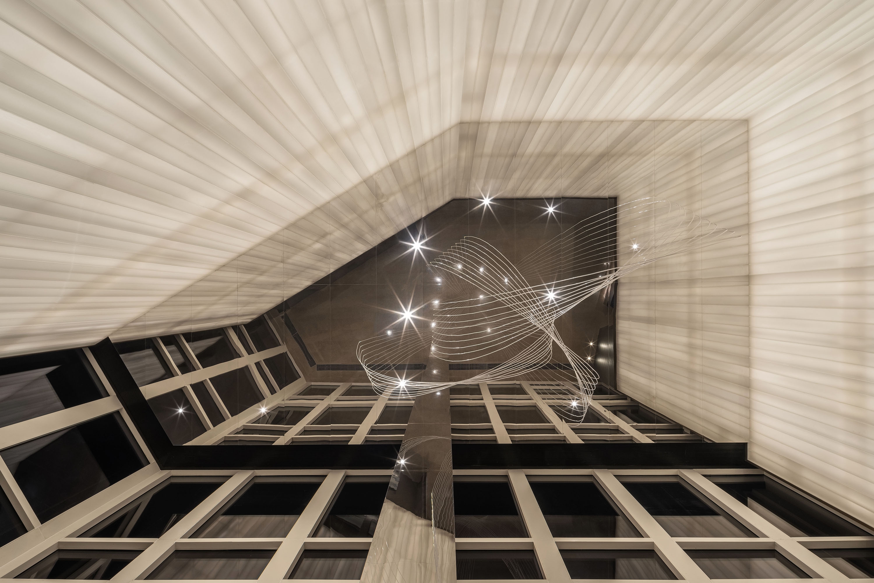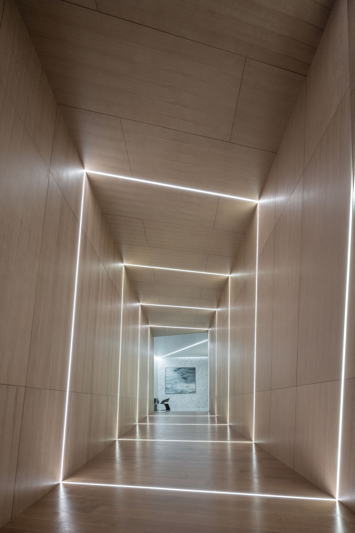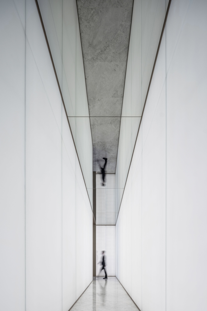 In the corridors, a combination of diffuse lighting fixtures on two sides and mirrored suspended ceilings create a sense of depth in the space, presenting a bold visual tension.