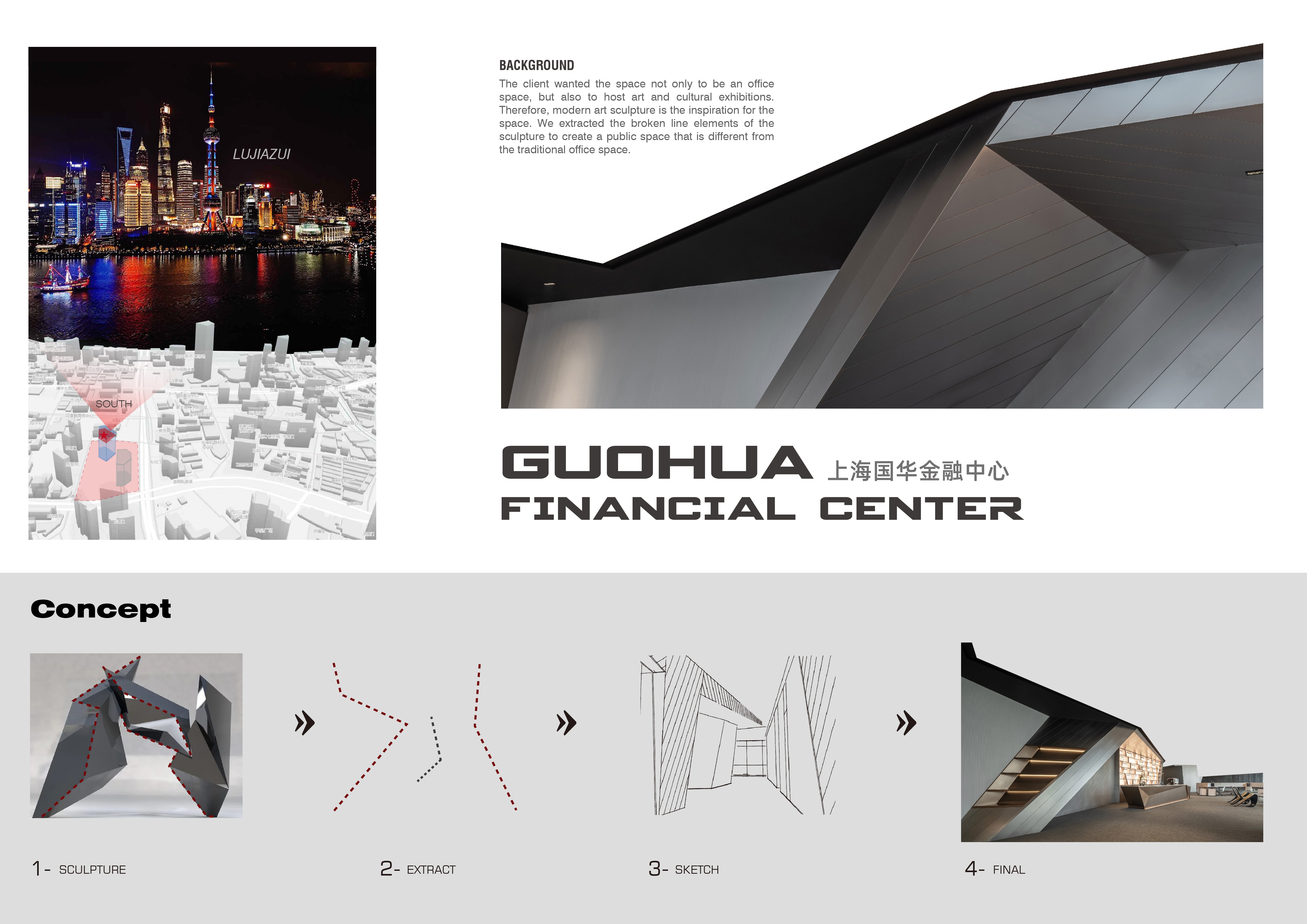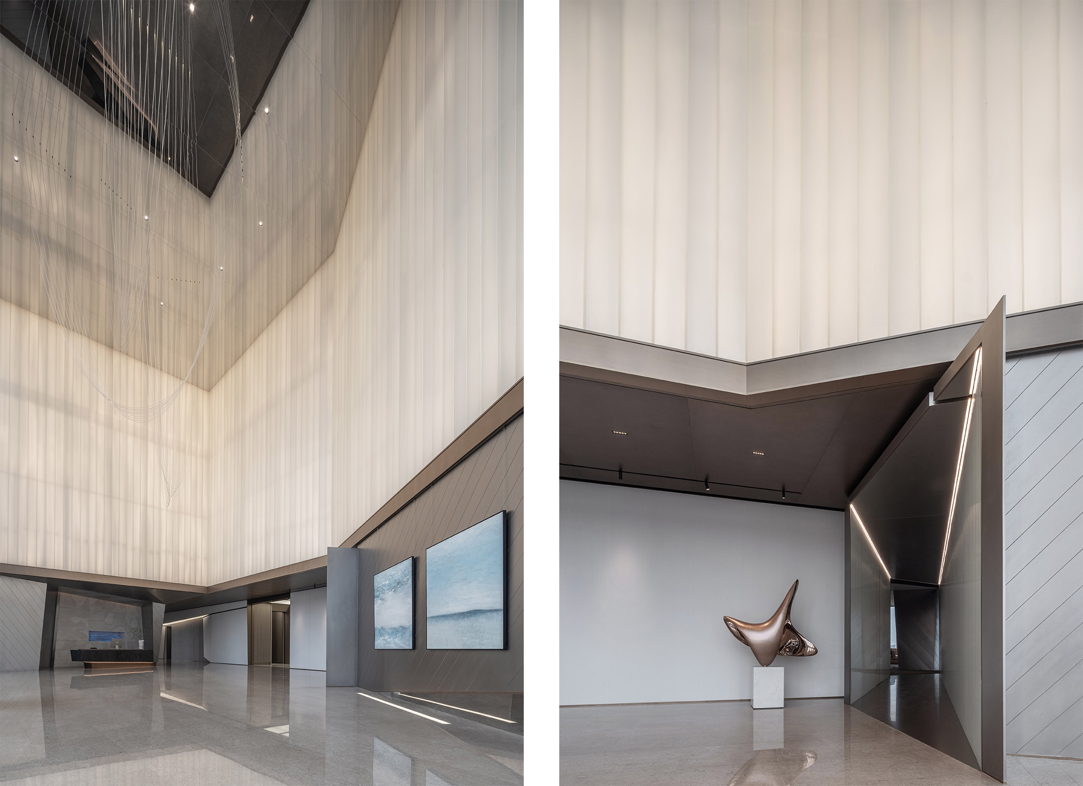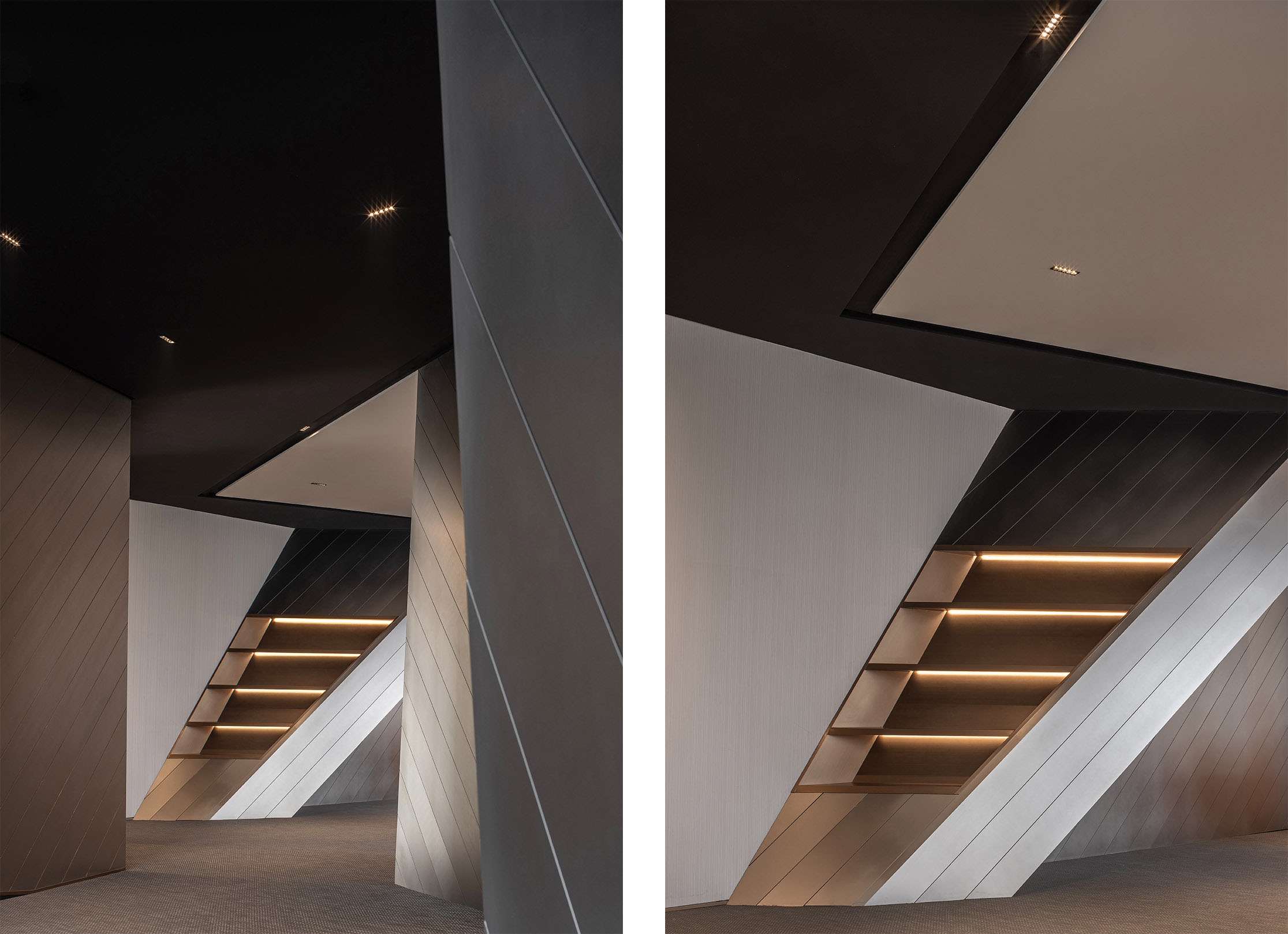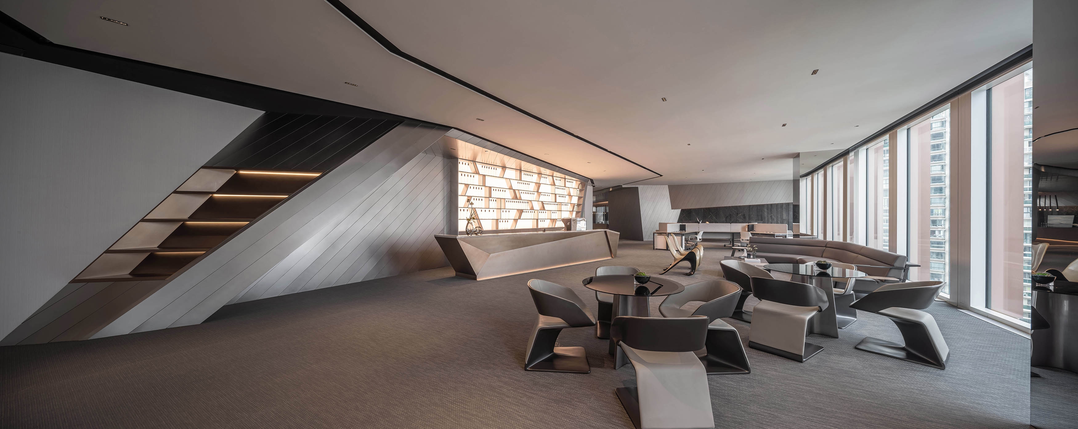 This is an office public space design.Drawing inspiration from the refraction of light, the design showcases a dynamic interplay of linear forms, utilizing lighting to accentuate the unique geometric shapes of the space. Different lighting materials are employed to create three distinct scenes where time and space intersect.
