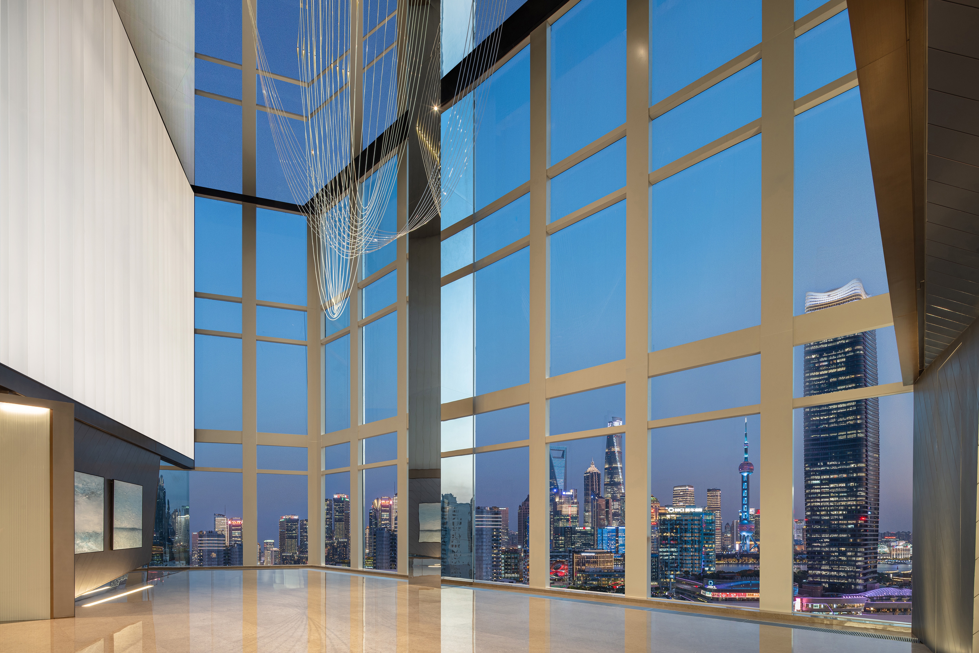 The open and spacious lobby serves as an art exhibition space, where a main fiber optic light art installation enhances the artistic ambiance. The large-scale floor-to-ceiling glass panels are defined as art showcases, not only displaying the latest products but also allowing for the display of various art installations, effectively enriching the urban interface.