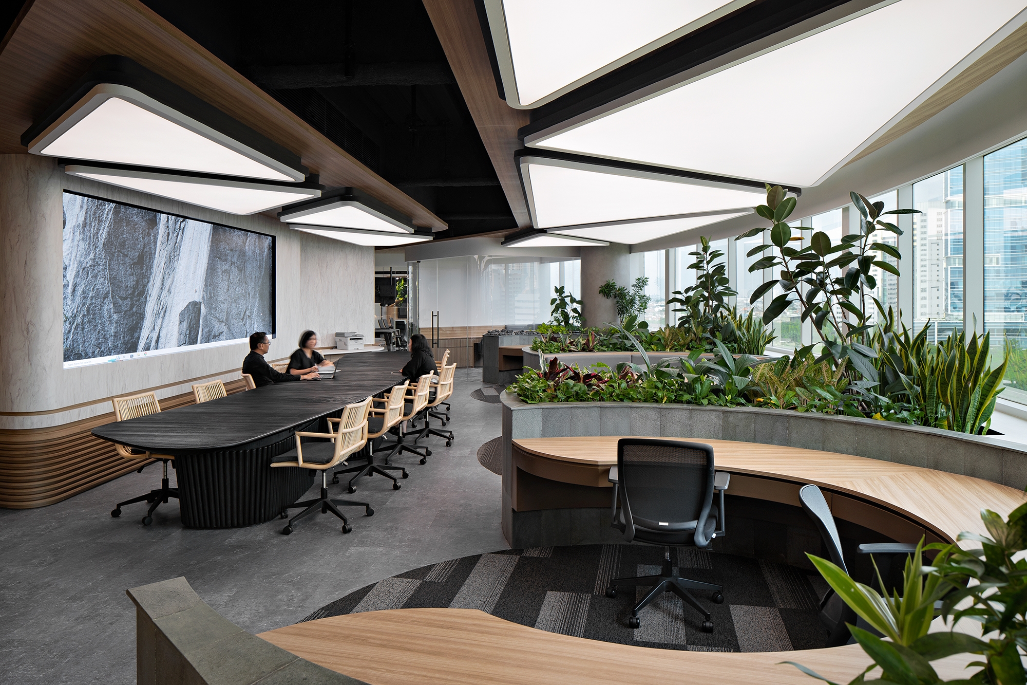 Sustainability ApproachWe use tunable white LED with DALI system and sensors. By using sensors, lamp energy consumption can be controlled optimally. During daytime conditions with maximum sunlight entering, the brightness level of the lamp immediately adjusts. Likewise, when there is no activity, the lights will automatically turn off. Apart from that, the use of tunable white is aimed at maximizing the performance of the team working there, which is adjusted to the rhythm of the human body clock.