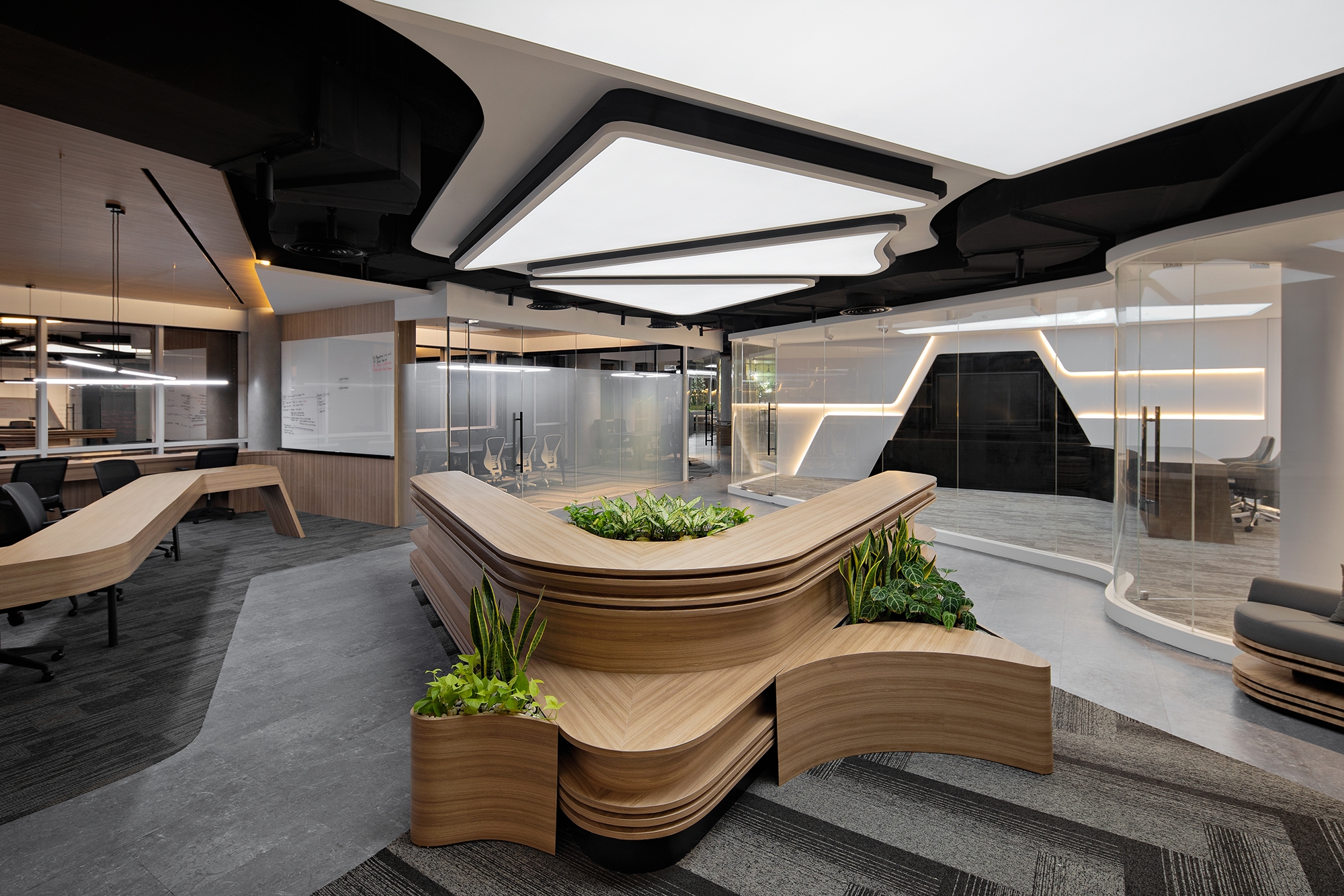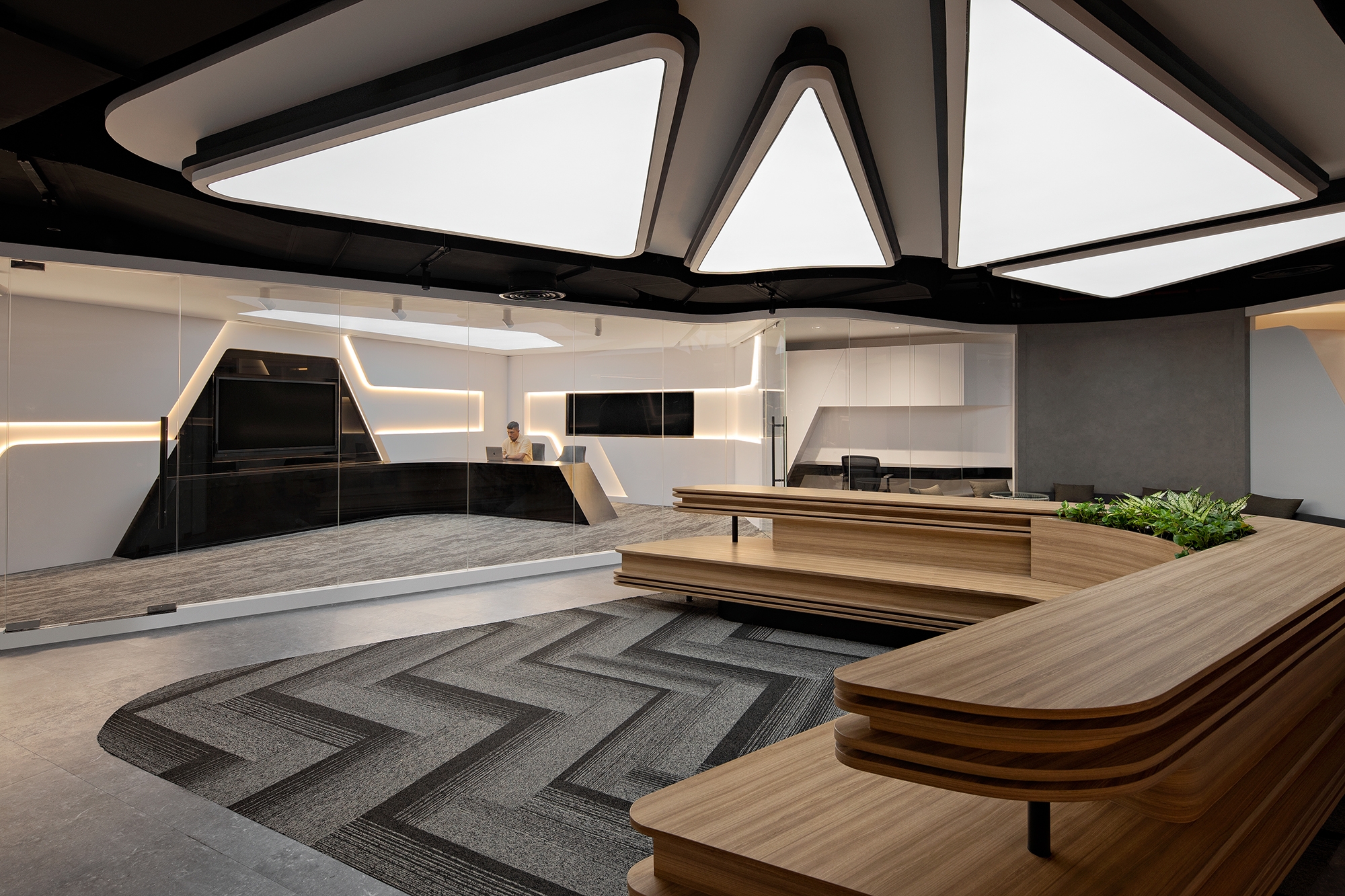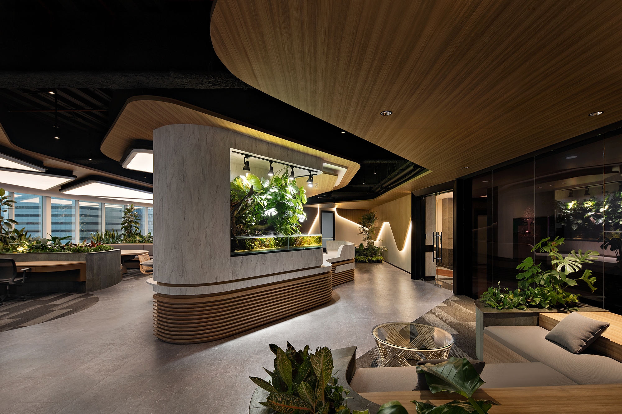 Entry DescriptionSaham Rakyat is a stock market platform based in Jakarta Indonesia. As a company owned by the young millennial generation, they want to have an unusual office. As a lighting designer, we come up with a concept where employees can work optimally, efficiently and happily by using the human body's biological clock approach. So we suggest to have a luminous stretch membrane ceiling as general lighting in the work area. This also aims to strengthen the formation of a dynamic interior concept by reducing the use of repetitive downlights. The color of the light changes over time from daylight to warm white, which is consistent with research on the relationship between circadian rhythms and light. Then, considering that there is a lot of natural light during the day, the brightness level of the light also changes so that the electricity needed for the lights becomes more efficient. For the lounge area, we present an alternative outside of working hours with a more fun concept by presenting a dynamic color concept in the membrane following the ongoing event. For the private meeting area we used turbular hanging lights to reduce the scale of the room. The live studio area is also designed using a membrane with the addition of several spotlights to maximize the appearance when live online. The lobby area is designed to provide a more welcoming atmosphere with a prominent paludarium