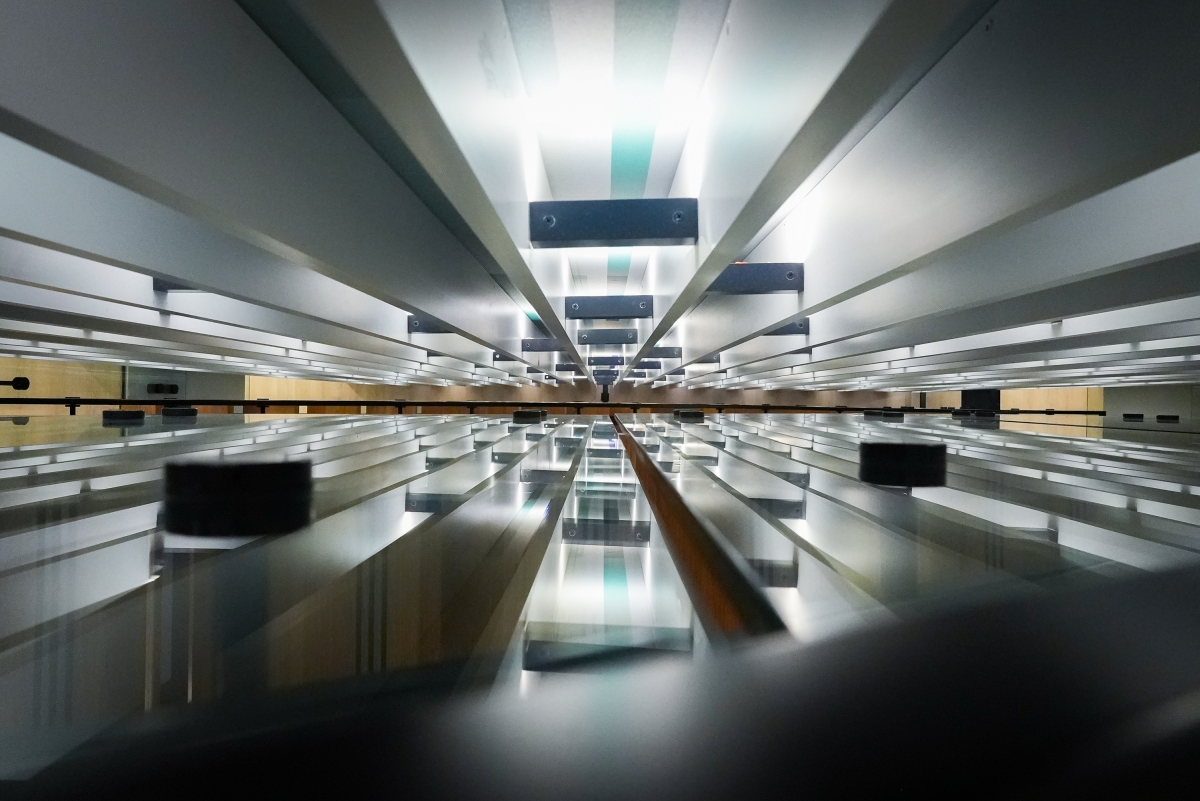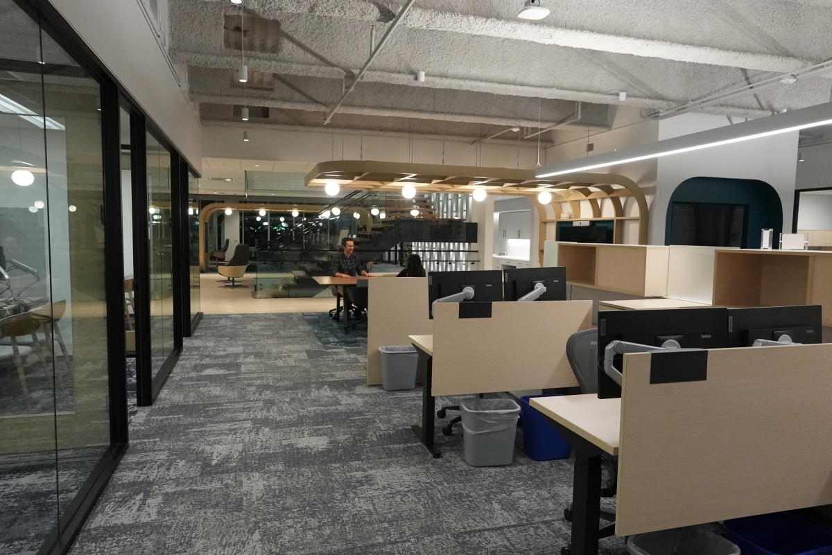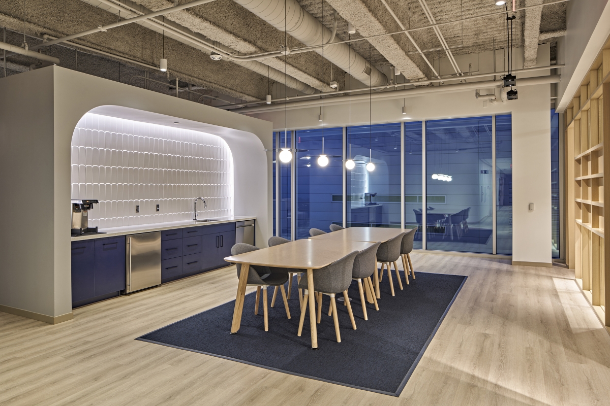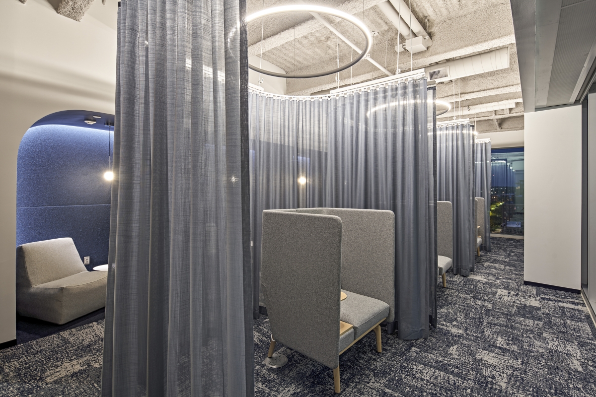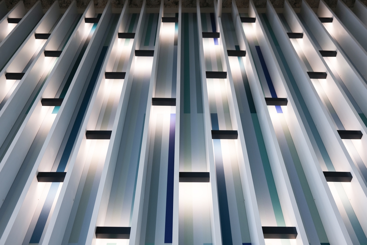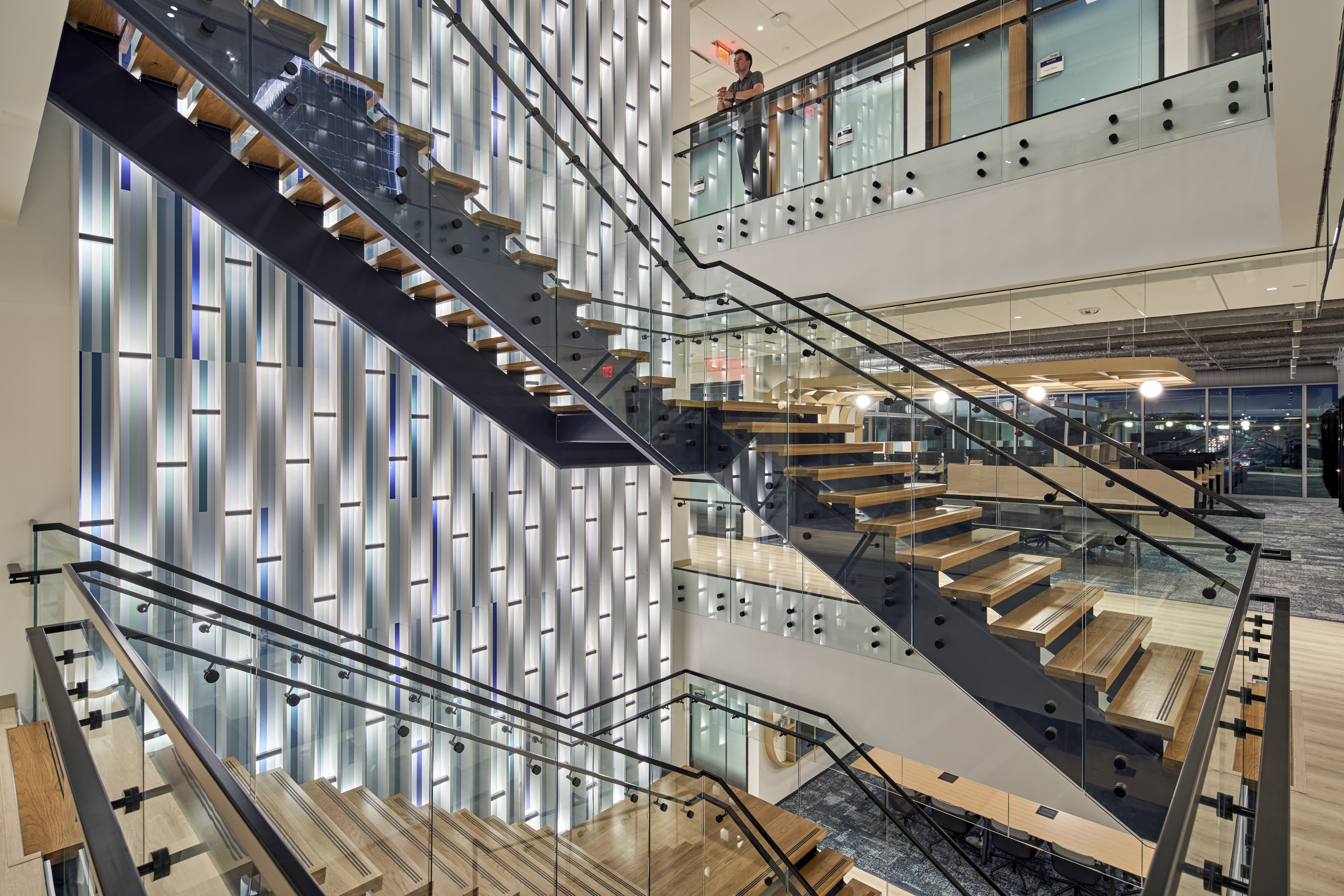 The communicating stair epitomizes the design concept. The mural interweaves simple elements (vertical fins, light bar, and vinyl wall graphic) and resonates to provide a soothing quality indicative of light interacting with a waterfall or a tree canopy. The soft sparkle reverberates throughout the office.