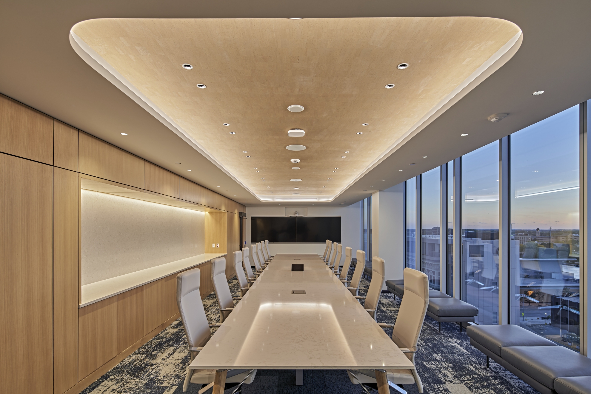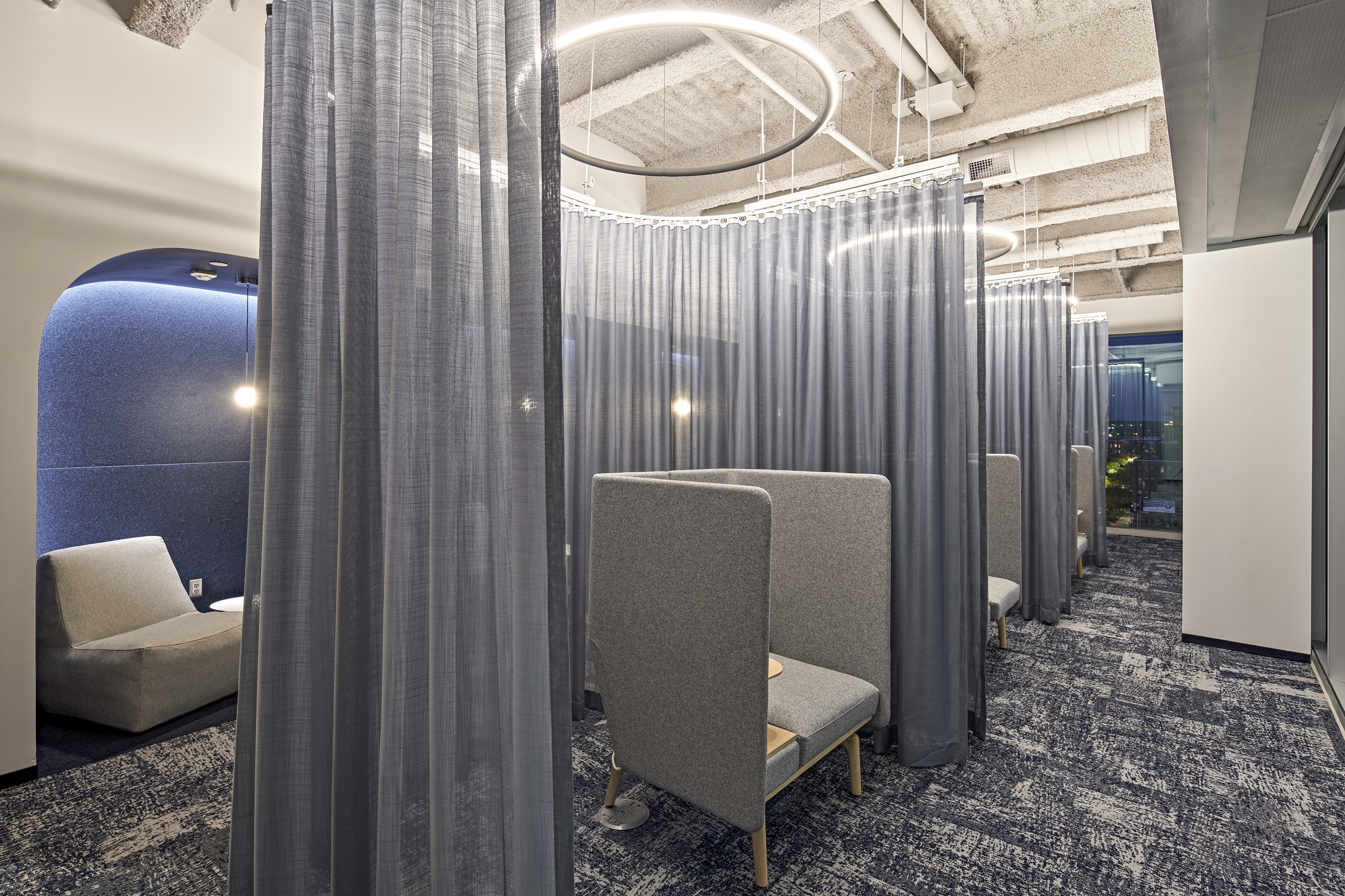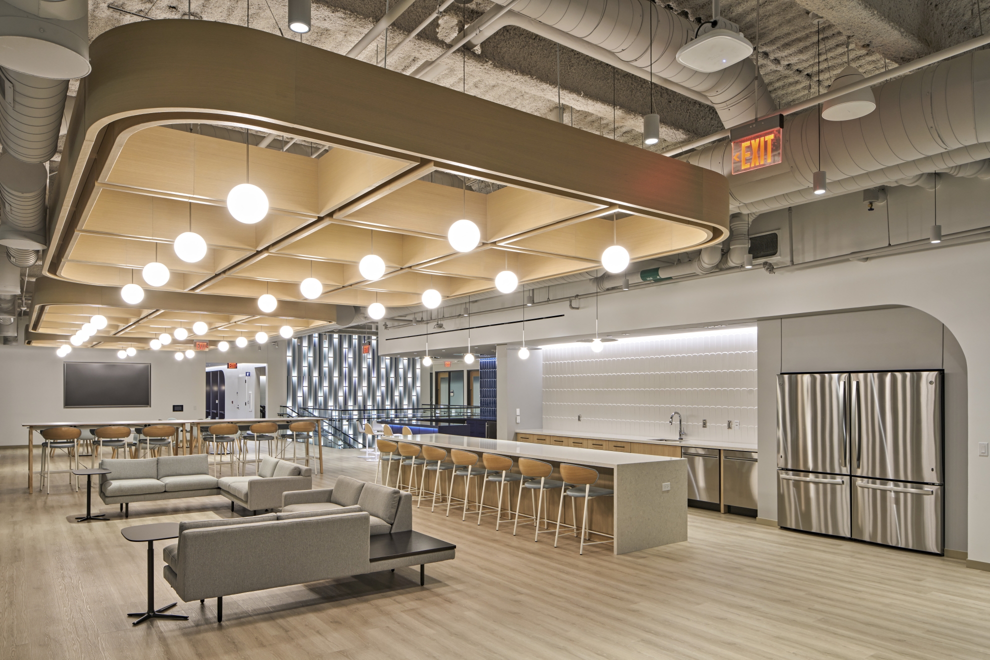 Office lighting mixes relaxed work environments with playful collaboration zones. Cove lighting traces curving architectural niches. Color temperature pairs with interior finishes: crisp 4000K with brand’s blue, neutral 3500K for general illumination; warm 3000K with wood accents. Indirect illumination softens the workspace. Direct illumination utilizes baffles for glare control. Decorative pendants provide playful and inviting glows.