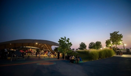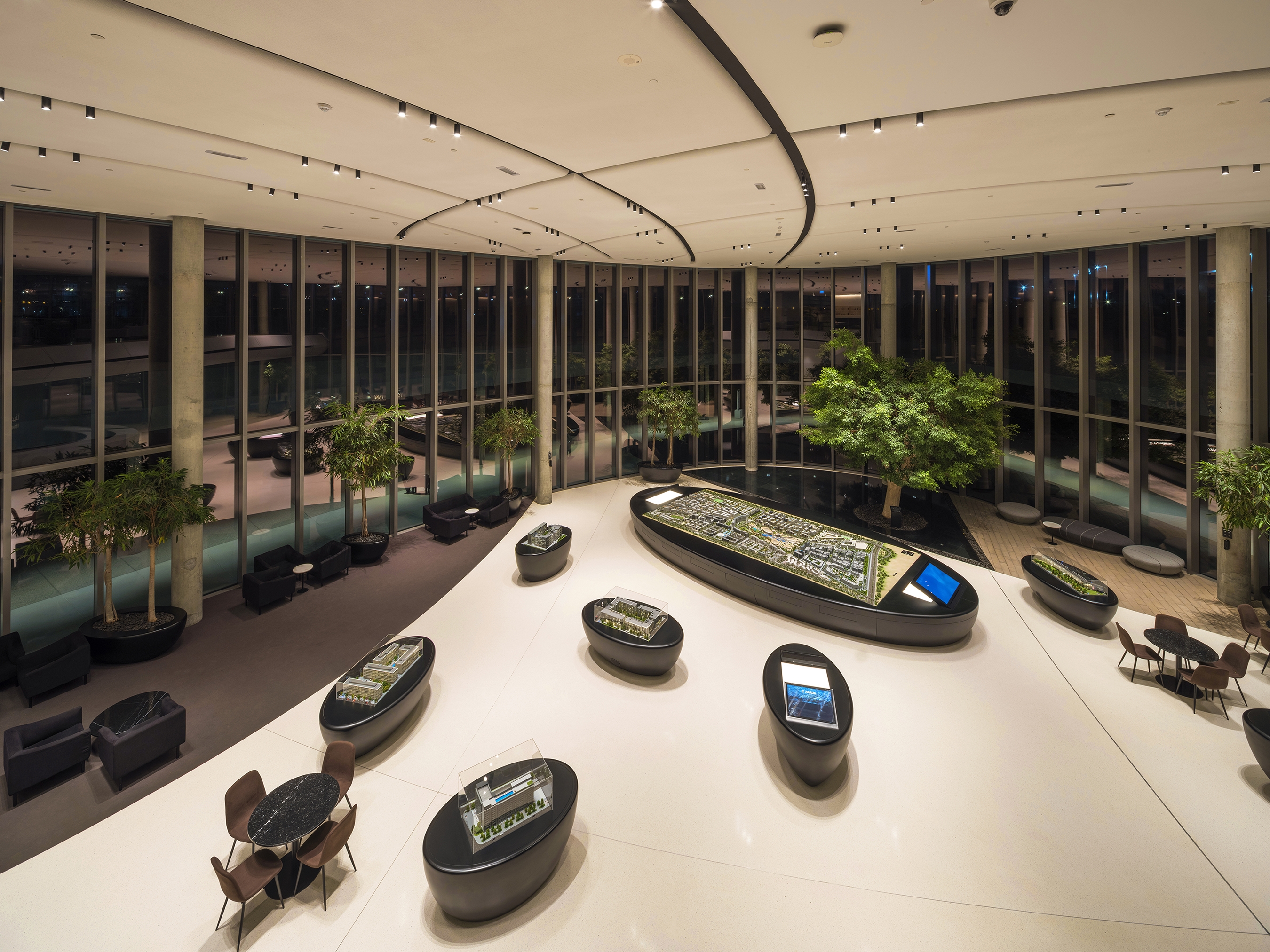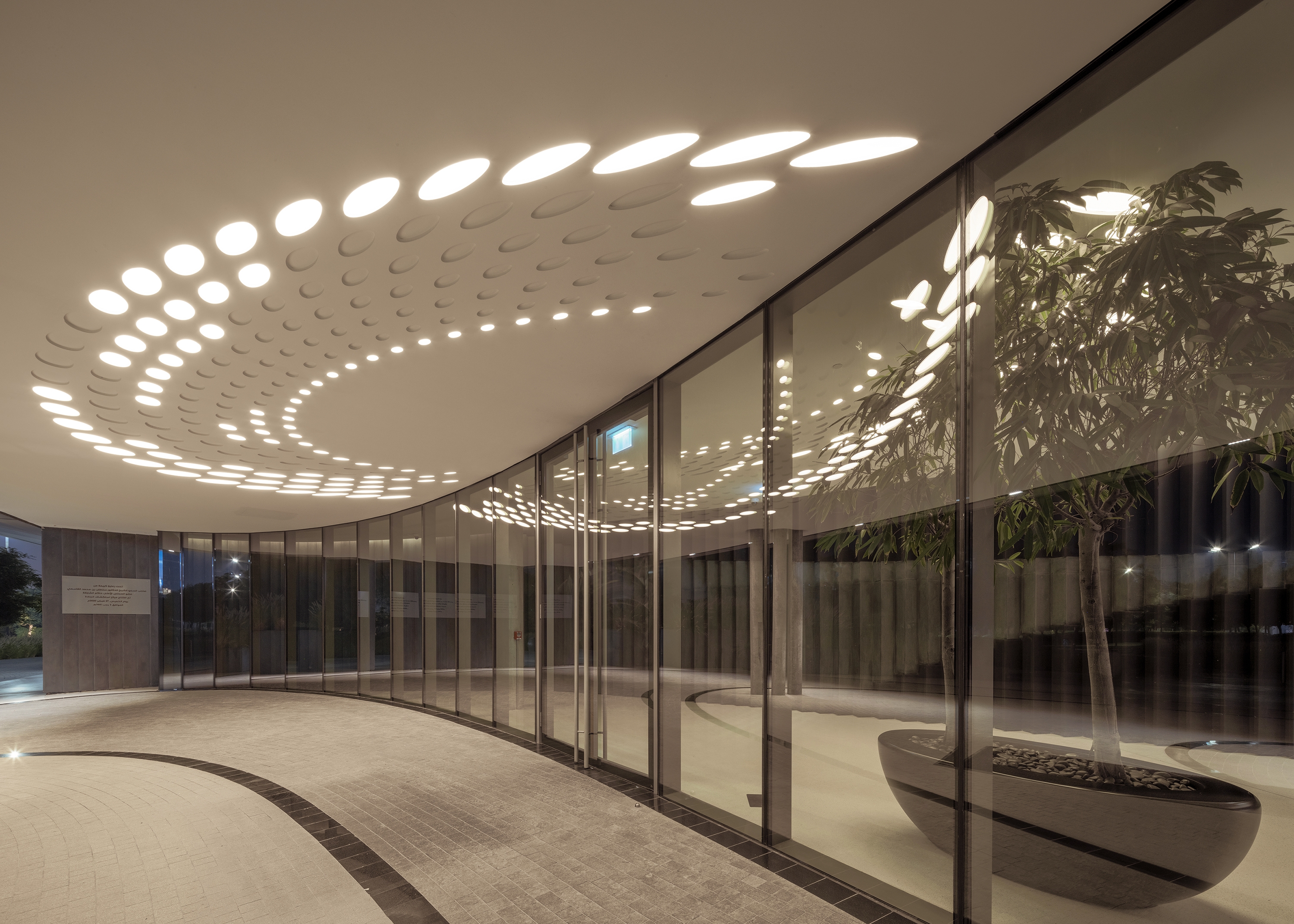 Entry DescriptionAljada’s Masterplan is conceptualized as a metaphorical falling water droplet, resulting in a radial pattern of geometries of oval-shaped buildings. An exhibition and event space amidst its sculpted landscape, is the Discovery Center. All lines and shapes are fluid, following the contours of the gravitational centerpoint, while an illuminated path around the building guides visitors to the entrances. The architectural lighting seamlessly blends into dedicated shadow gaps around the building contours, remaining inconspicuous during daylight hours. The exhibition space features an expressive ceiling and lighting layout, following fluid lines and overlapping areas for higher densities to provide flexible and ample lighting coverage in the double-height space. Gallery-style lighting with flexibility and contrasting elements creates focal points for exhibition objects. Luminaires are strategically installed and controlled to avoid manual aiming and repositioning, while minimization of lighting types enhances user-friendliness and functionality. Rather than a uniform brightness, a holistic design promotes intuitive wayfinding by allowing neighborhoods to dictate the lighting intensity, with pathways defined by their illumination levels. Selective graphic lighting elements such as the entrance canopy’s luminous parametric pattern lend visual prominence, enhancing the user experience.