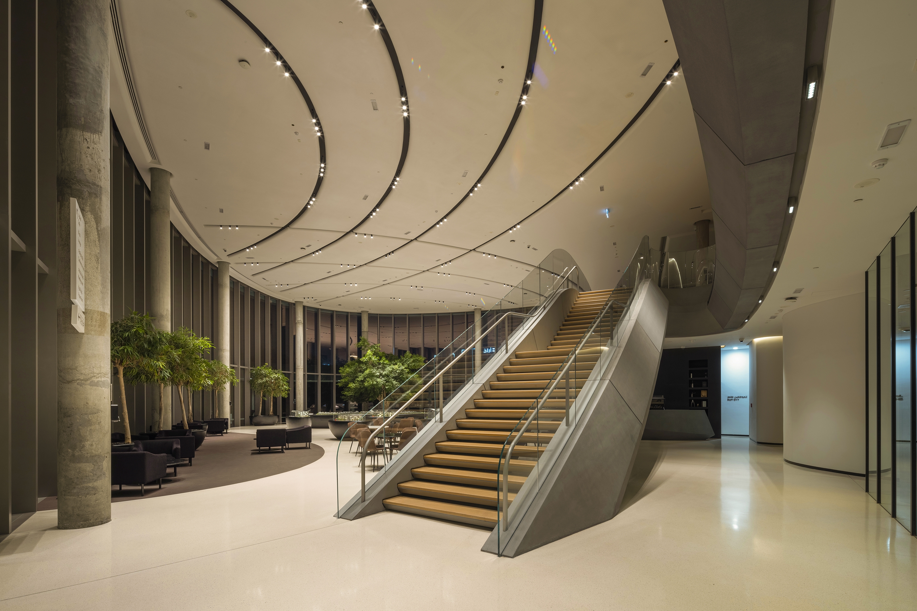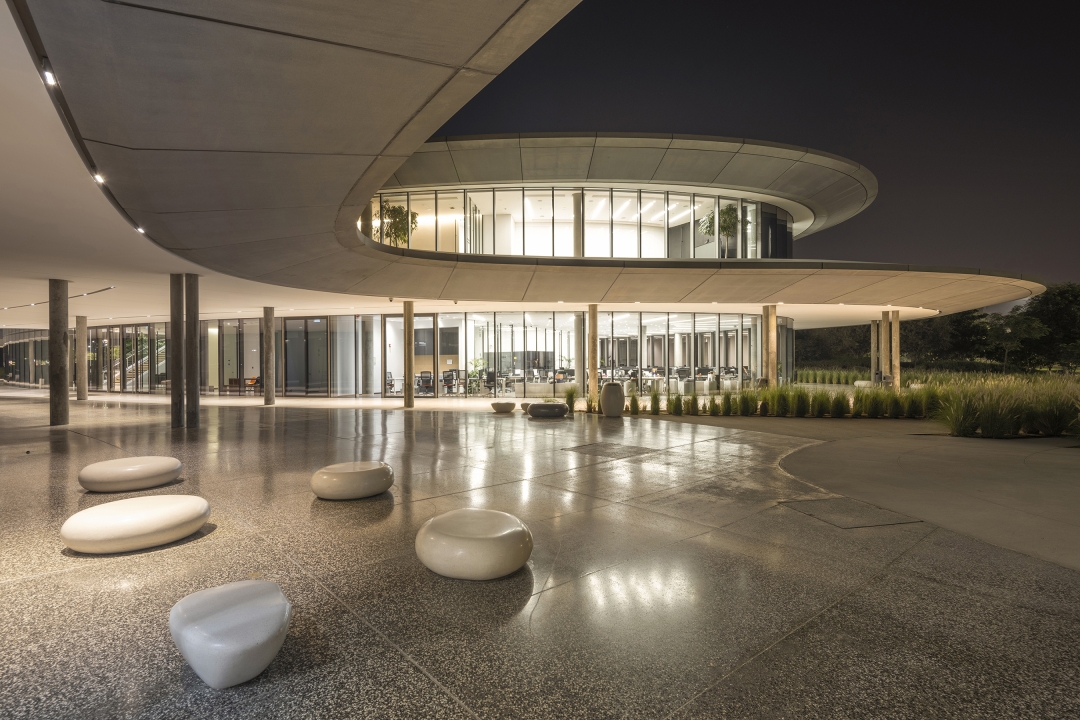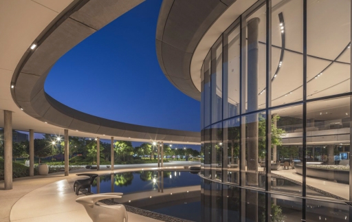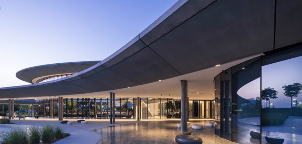 Sustainability ApproachThe sustainability approach strategically positions lighting precisely where it’s needed, avoiding excessive or unnecessary usage. All luminaires utilize energy-efficient LED technology with minimal power consumption. Luminaires are deliberately spaced in segments to provide only essential illumination, yet simultaneously form continuous, graceful, undulating lines of light throughout the ceiling to create a seamless and fluid luminosity. On the outer facades, spill light is borrowed from the building’s interior bouncing out onto the canopy edge, minimizing the requirement for additional illumination, while crafting a halo effect that elevates the building’s distinctive character. In a human-centric approach, shielded lights are used in the exterior areas to protect from excessive glare while providing ample illumination.