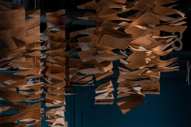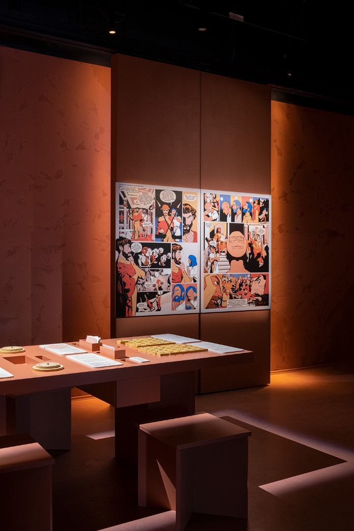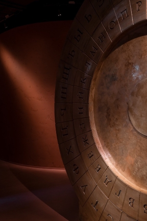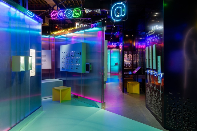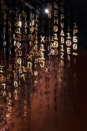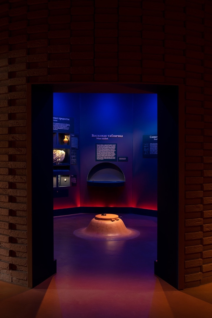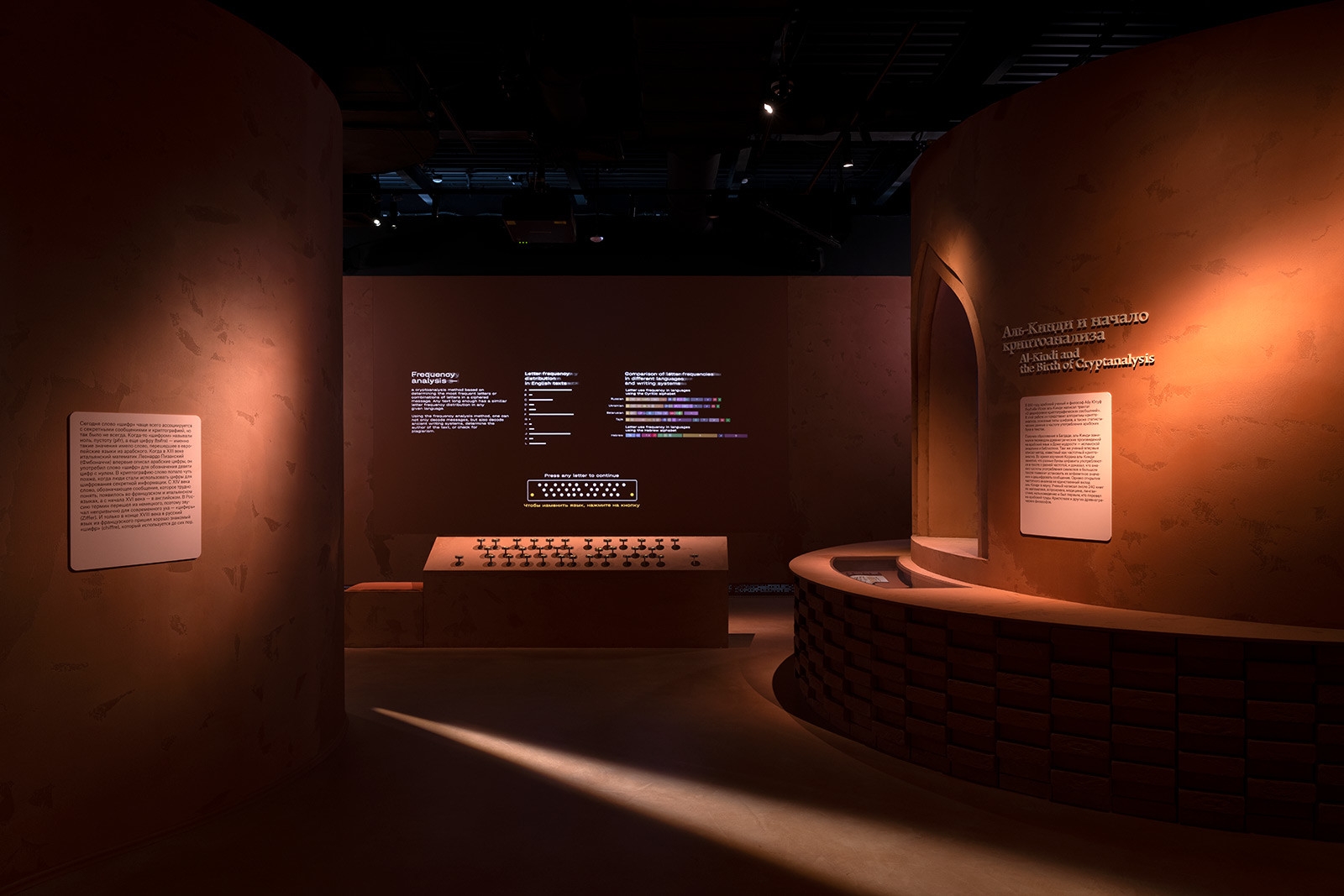 The modern hall is inspired by cyberpunk and Steven Kubrick's "Space Odyssey" with chaotic, cold, colored, and shimmering light. The industrial era of the Cold War has ? feeling of rustling secret papers and metallic machines. The 17th century halls are represented with candlelight flashes. As for the ancient times the exhibit is showcased in an entirely alchemical and mystical light haze.
