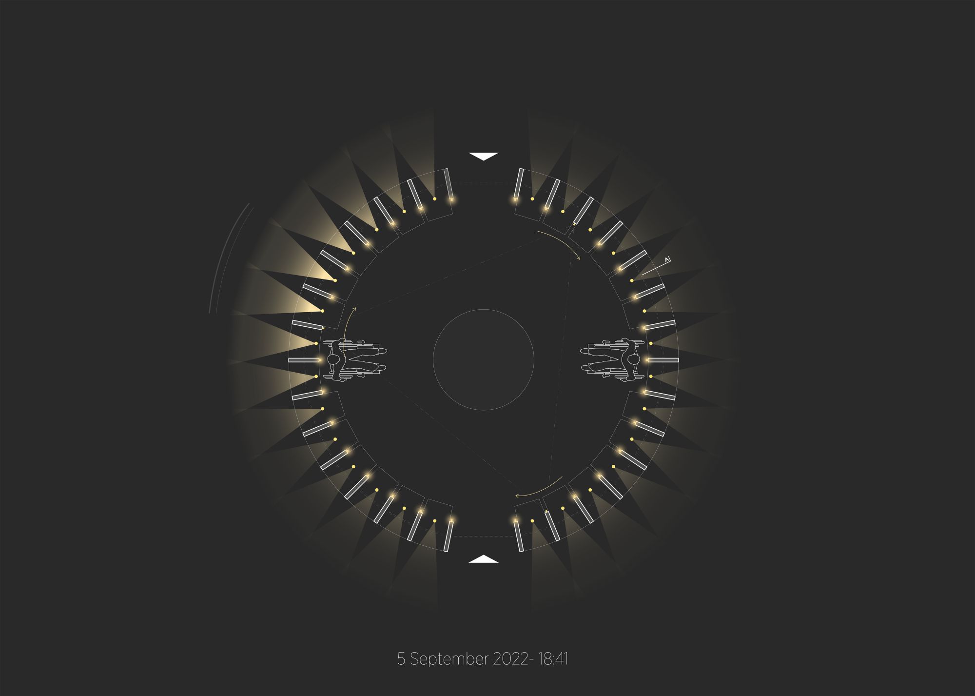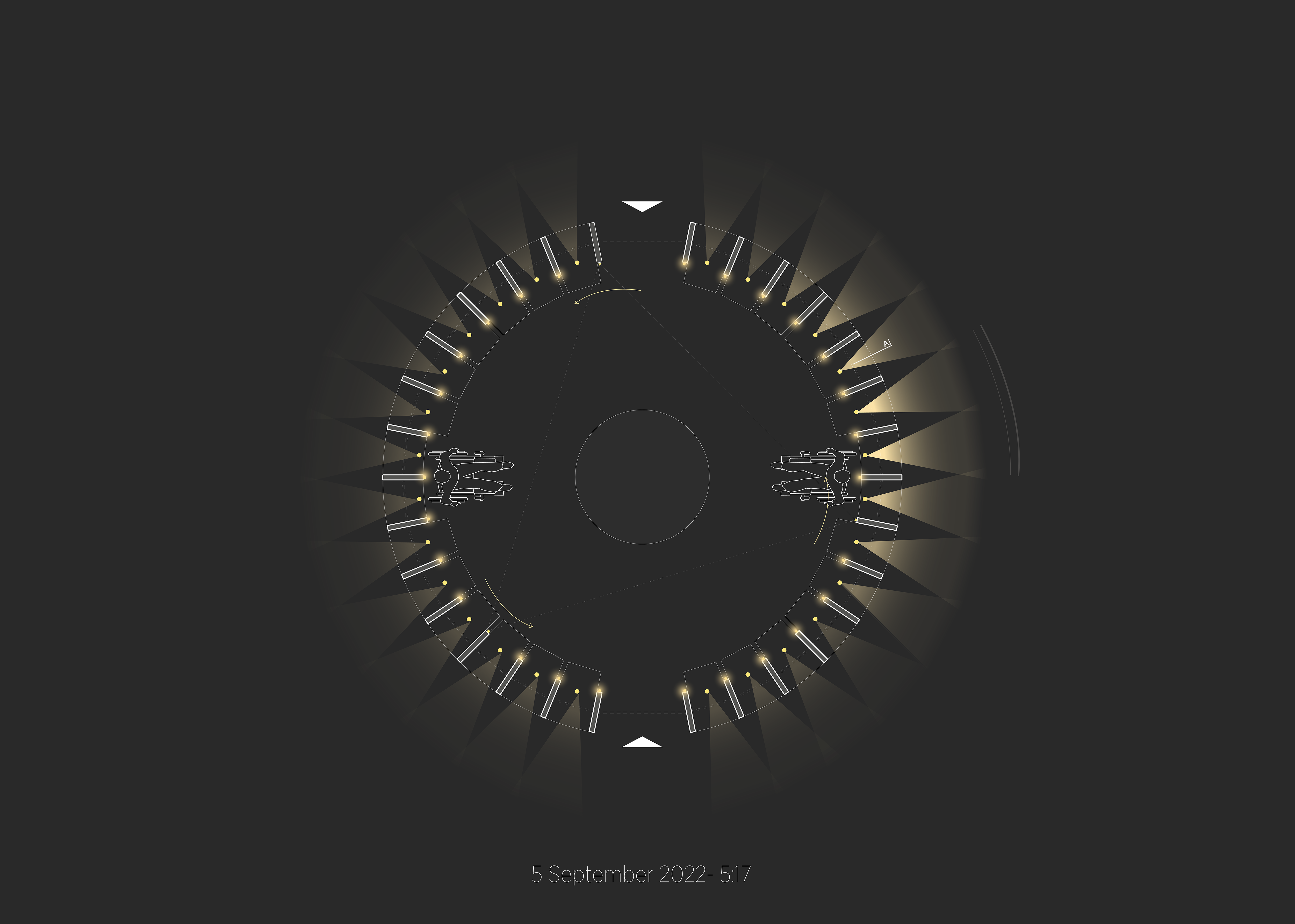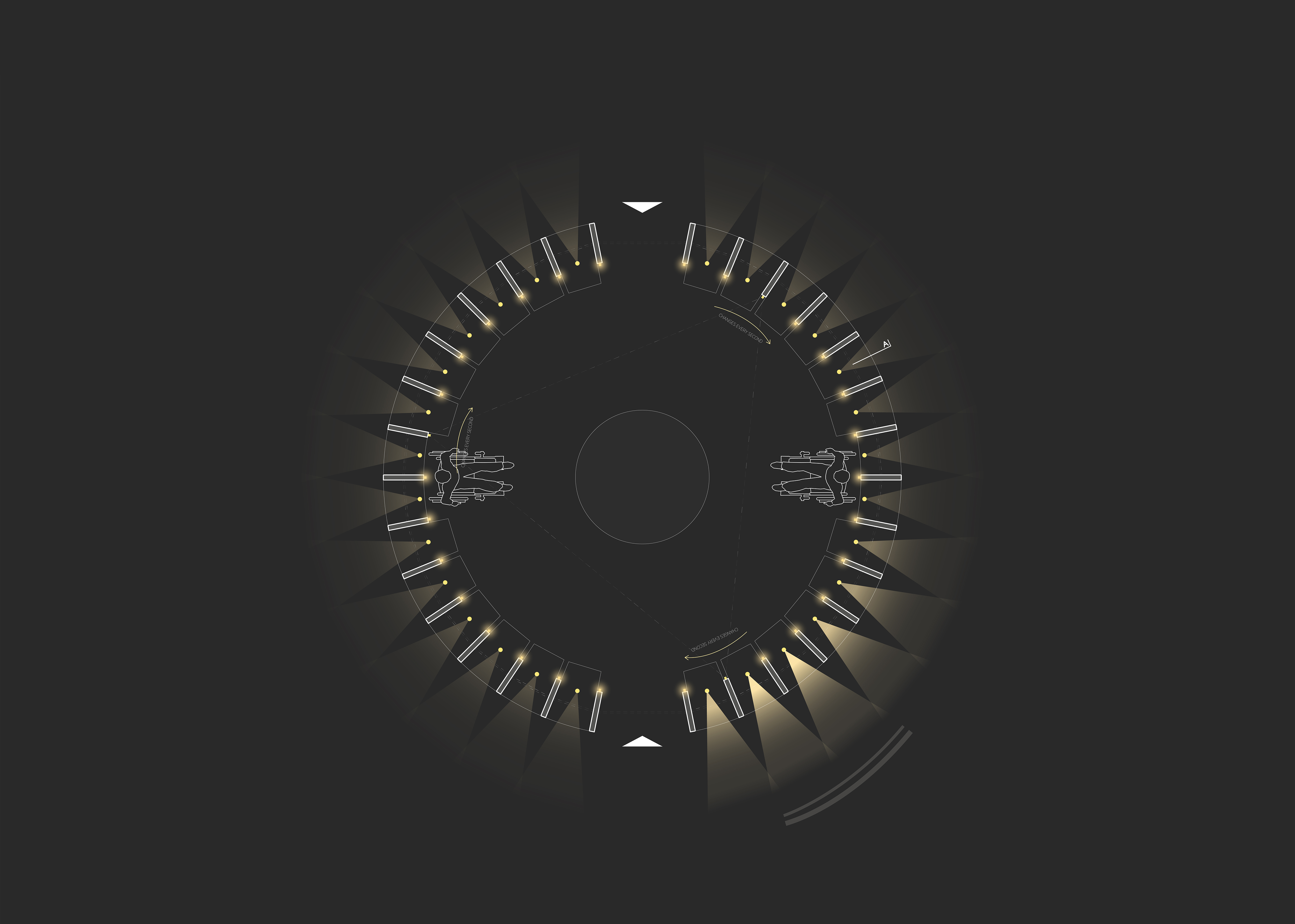 As each quarter hour approaches, a carefully choreographed light sequence breathes life into the installation, not only infusing it with animation but also paying homage to ‘Henge' as an artistic instrument of