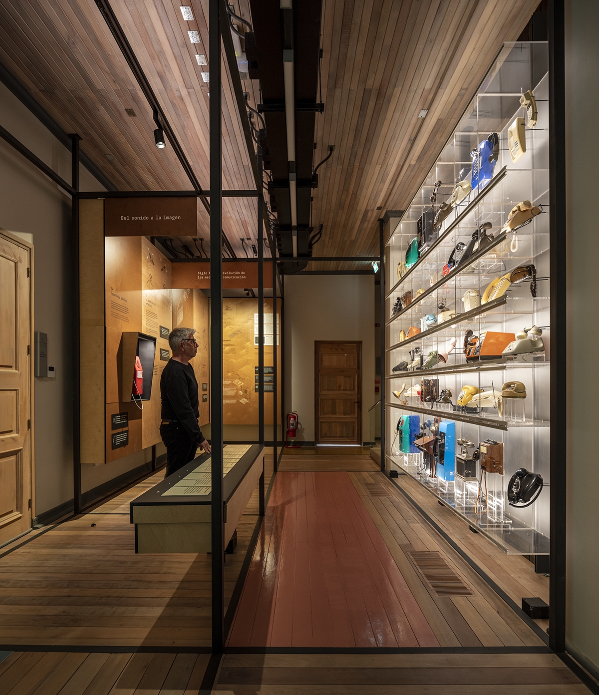 The interior architectural and museographic lighting is following the museographic script form the first room of the museum, which relates to the history of communications before electricity is lit with 2200K, the second ambient which relates to telecommunications following electricity’s arrival is lit with 2700K, the third ambient which relates to the fifties and sixties has a 3500K lighting, and finally the IP era is lit with a 4000K and RGBW lighting. Lighting was custom designed for each kind of showcase, looking for integration of lighting systems and generating the best experience for visitors. The project is equipped with control system based on DALI protocol that allow to program on a very precise level each luminaire as to produce the right ambient for visitors experience in each room.