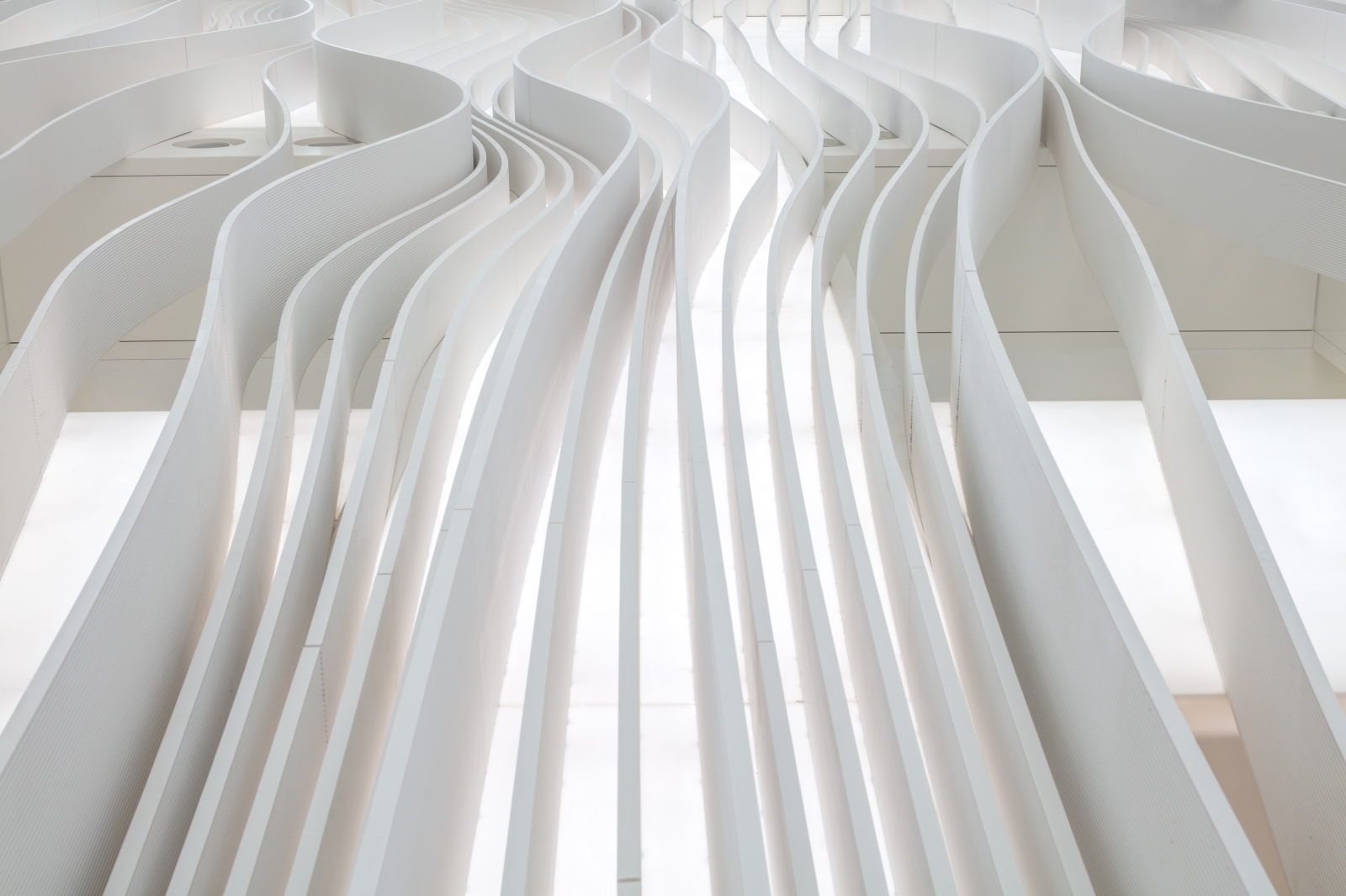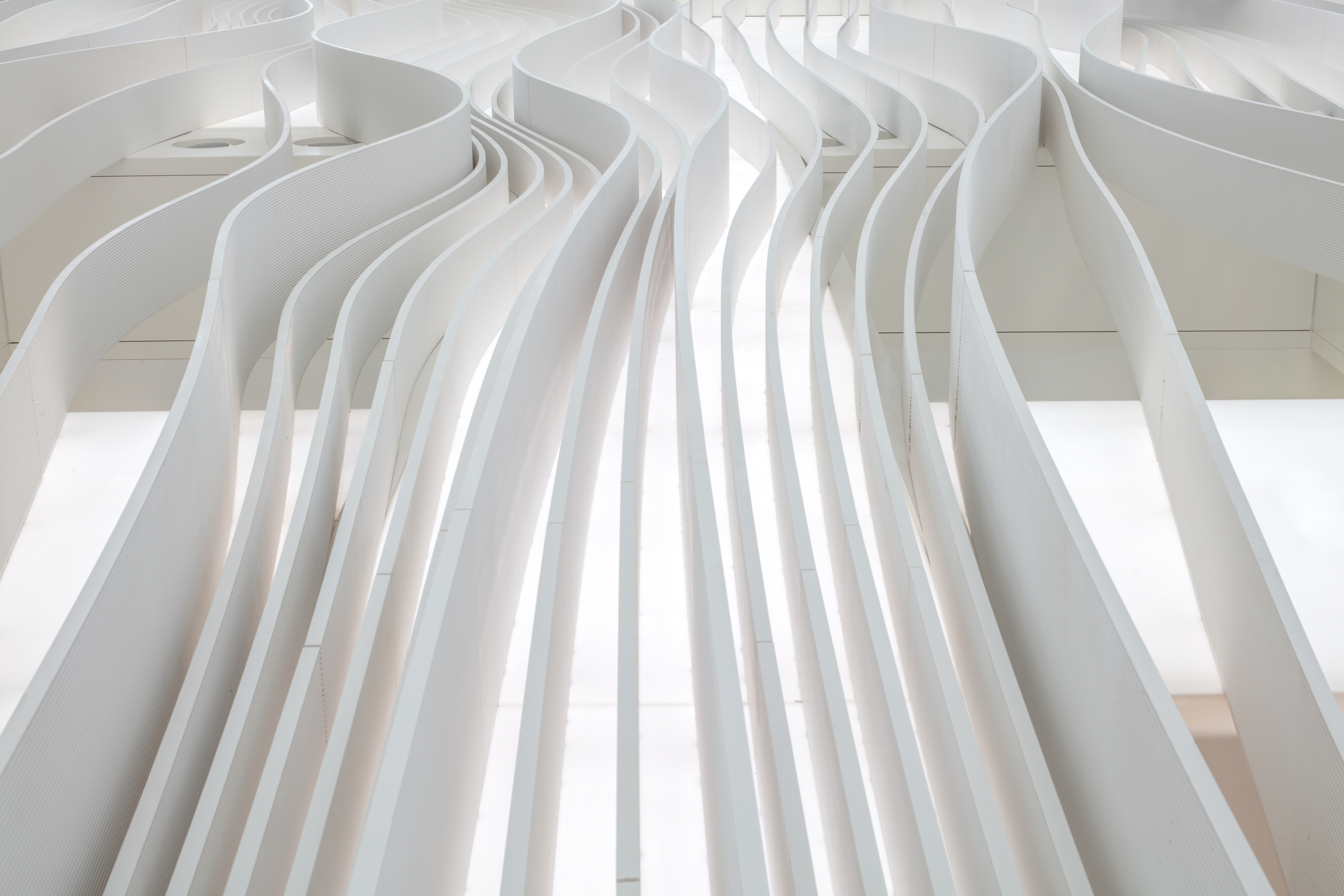 The 22m tall main facade is a series of flowing opaque fins mounted to translucent solid surface panels backlit by tunable white light emitting sheets. The hardness of the fin’s material is broken down by variation in depth and oscillation of texture. Each fin has a grooved pattern etched on its surface to diffuse the light and soften its materiality. Lighting scenes were designed with DMX control which ebb and flow, creating a subtle shift in hue and intensity of light through the day that interacts with the daylight contribution from the atrium skylight and then shifts into evening. The varying depth of the fins reveals layers of texture and light as you move across the atrium. This interplay of the light enhances the façade's dimensionality to create the effect of movement, all leading to an architectural pleat in motion.