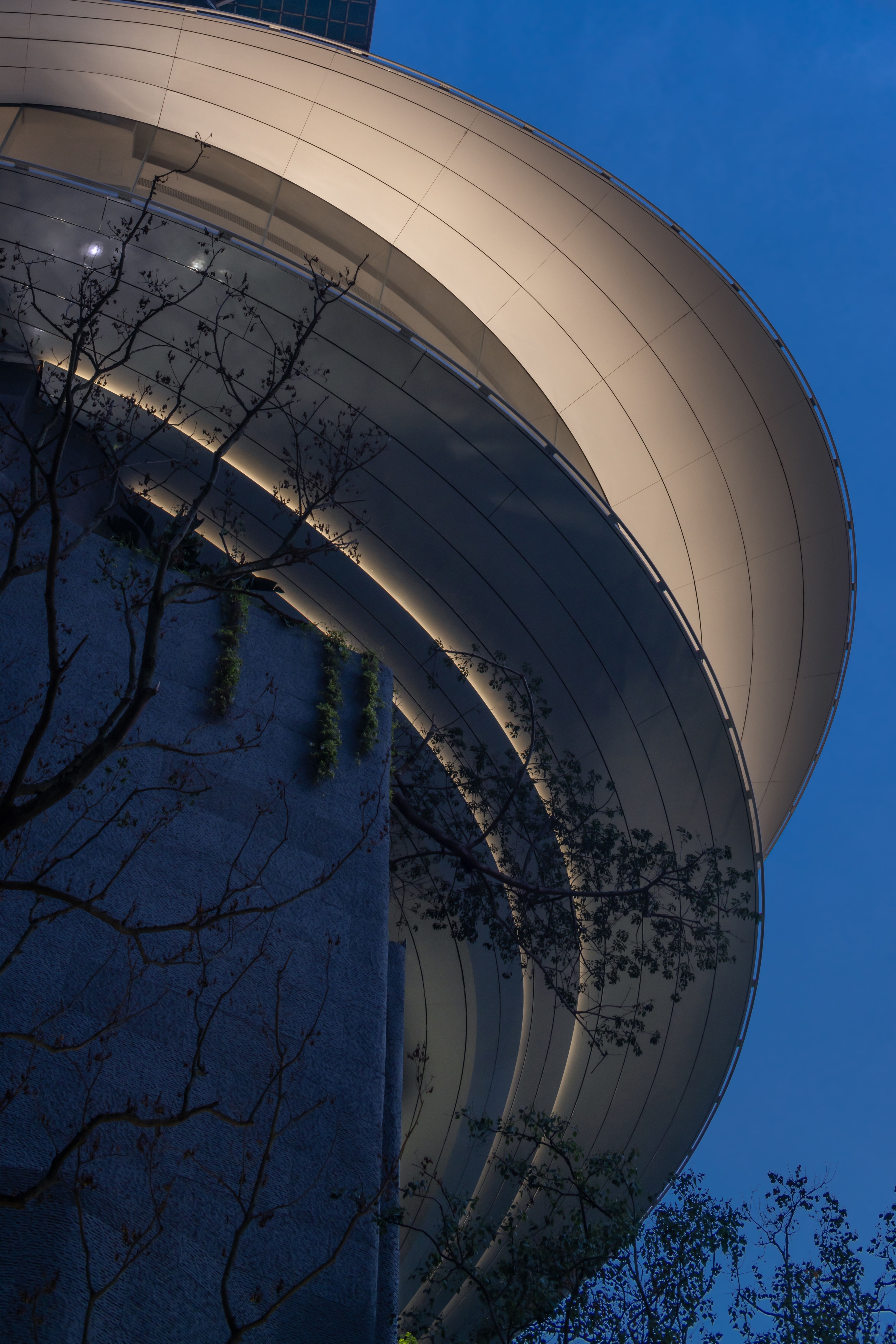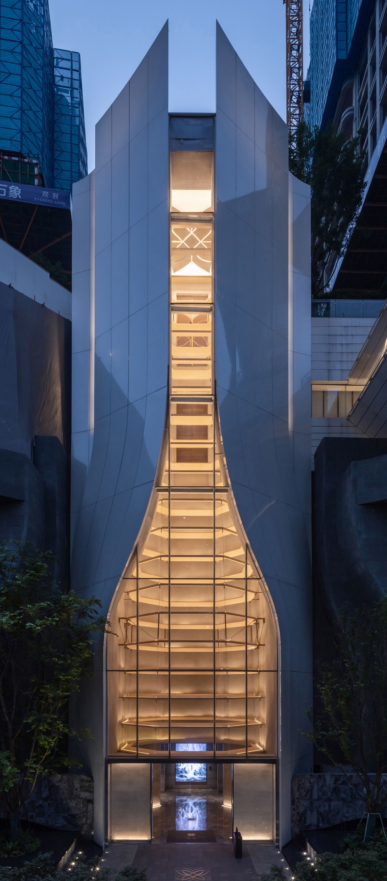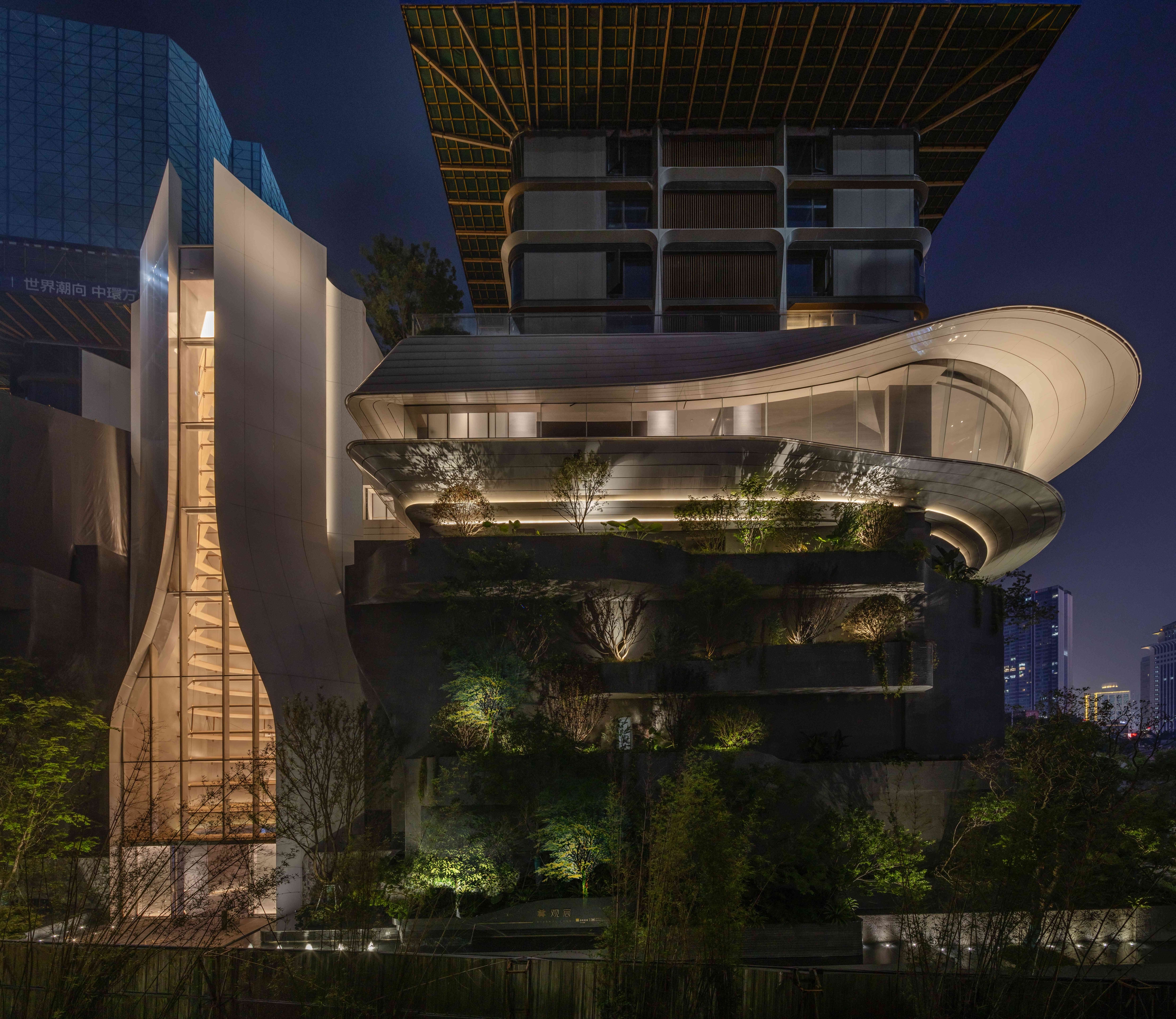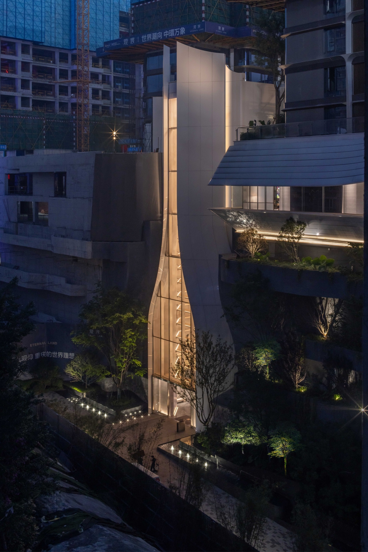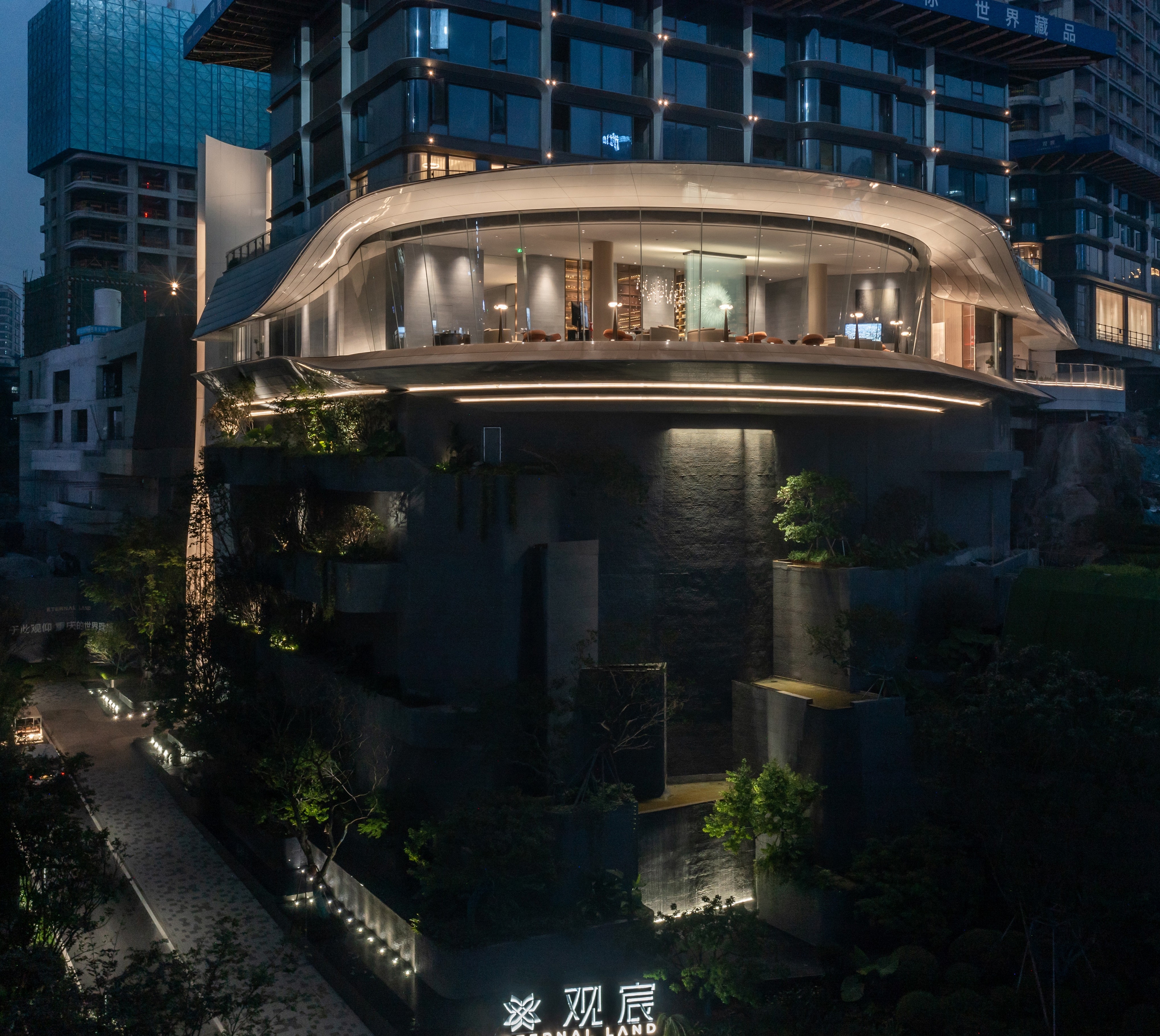 There are three levels of building lighting. The first is highlight the top architecture without seeing fixture. All fixture are all combled with curtain structure and landscape. The second is try too keep landscape wall nature. Only use a few tree up light to lit tree canopy. Linear LED water proof lights for the waterfall are concealed with the water pipe. Making people feel living in the natural environment. The third is the street scale lighting environment. Focusing on the living funtain lighting, bright polo lighting beside the street. So that the owners feel relax and safe when they come back home.