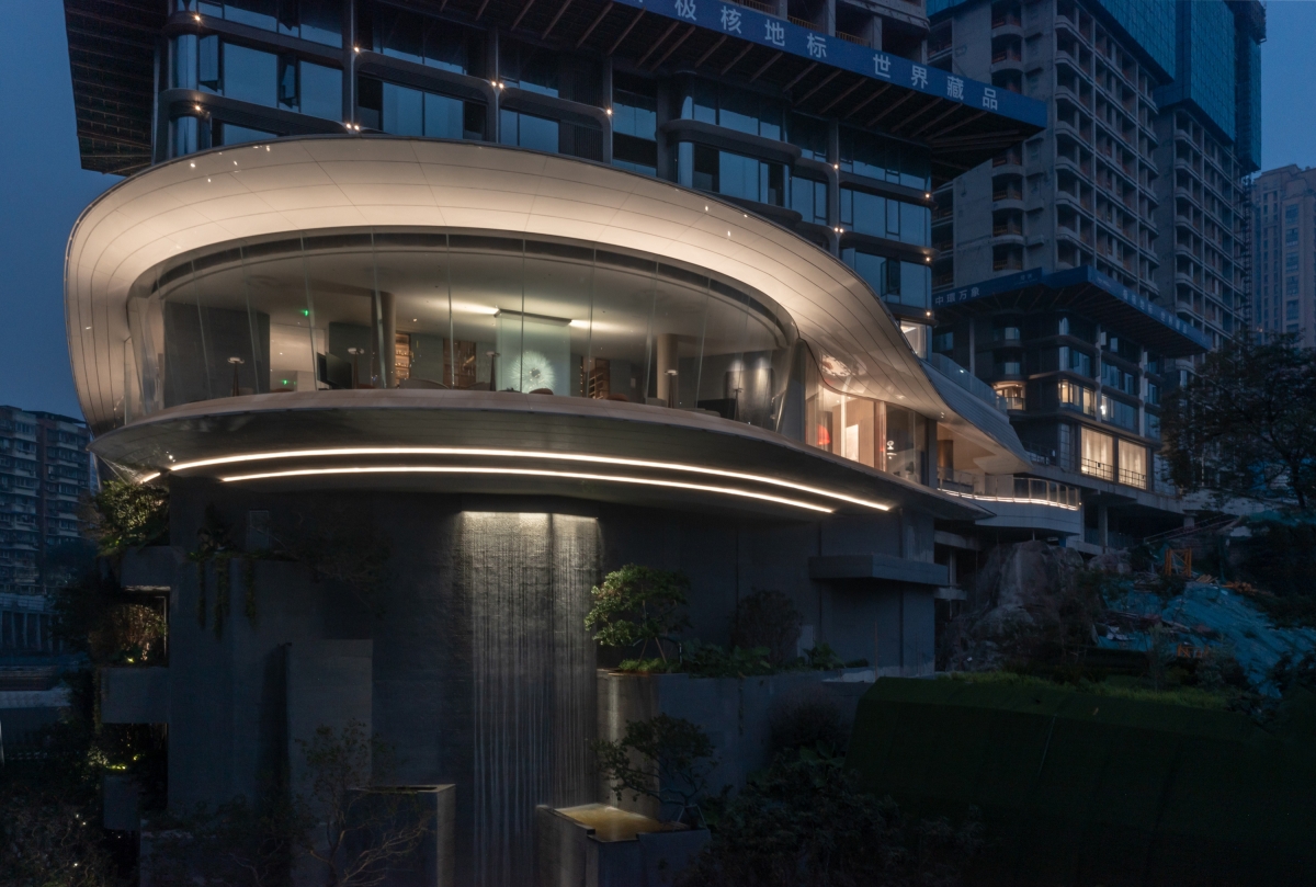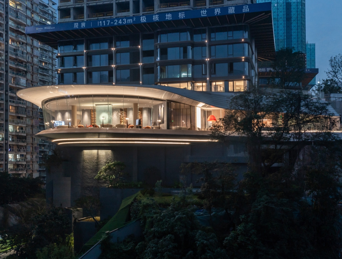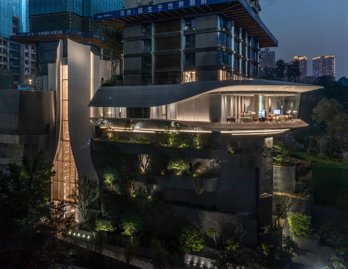 Entry DescriptionThe sales center is located in the bustling Guanyinqiao business district in Chongqing , which is easy to find. There is a large height difference on site, and the architects make full use of the existing terrain conditions to create a iconic display window in Chongqing.