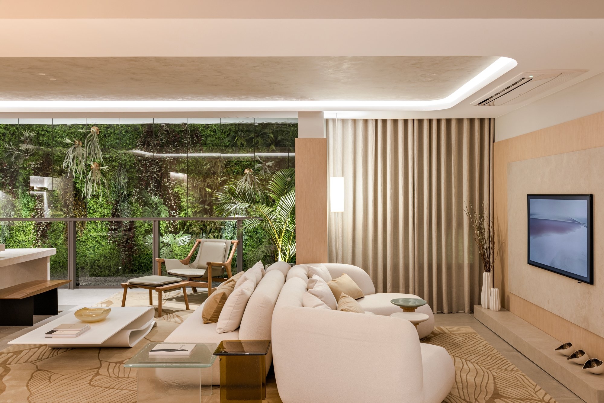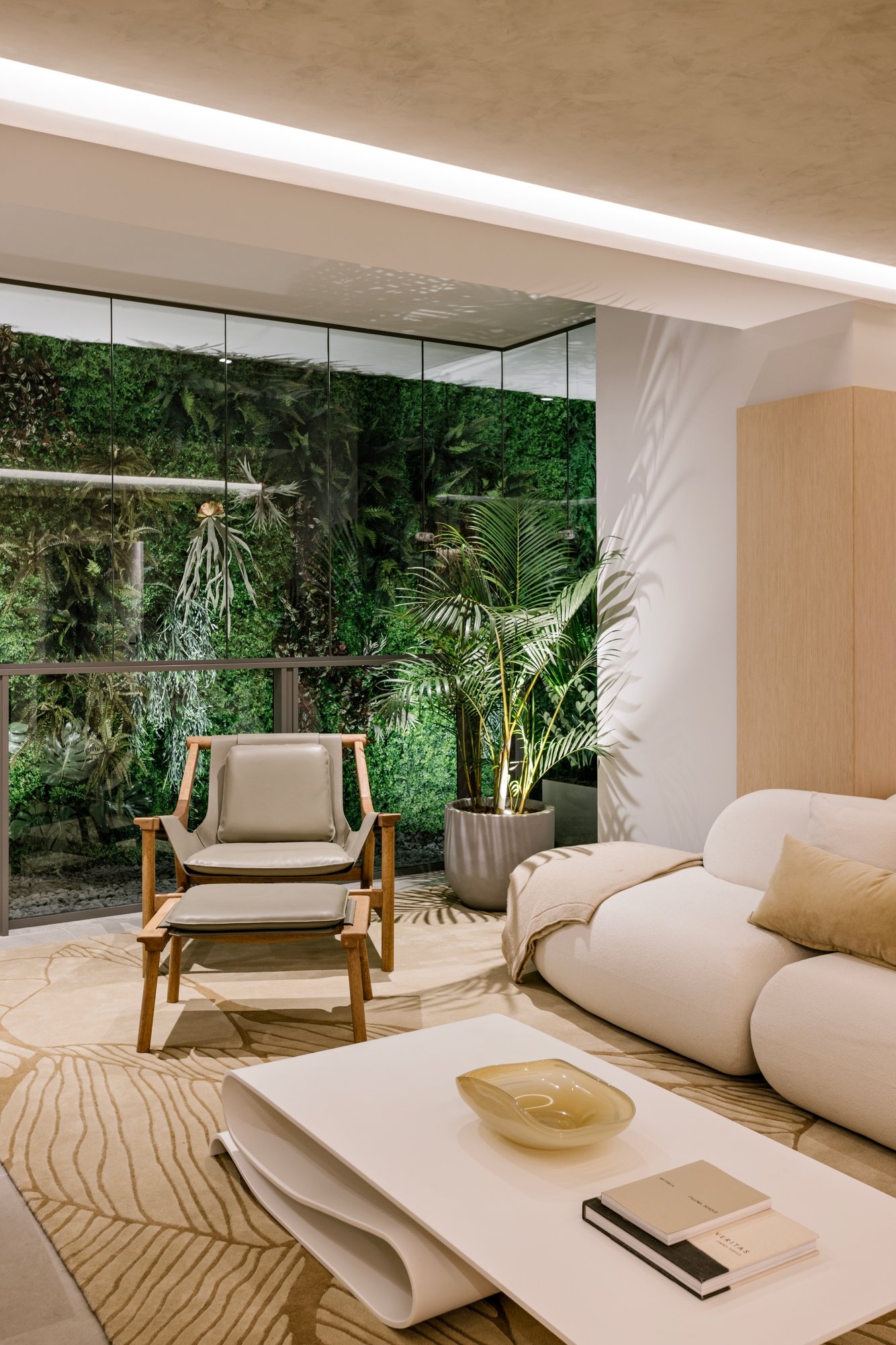 Entry DescriptionThe proposal for this lighting design project was to create a cozy and sophisticated atmosphere for the space. The combination of indirect lighting and minimalist accent lighting points promotes a pleasant balance between a light and shadow. The wood is highlighted by a soft light like a veil, while accent points, such as the uplighting in the vegetation, bring dynamism and vitality to the environment. The combination of different layers of lighting adds depth to the space, resulting in a elegant and functional environment. All lighting is dimmable, allowing users to control the light and choose the best mood for each moment. In conjunction with organic shapes, the space invites relaxation and living life in moments of pleasure and well-being.