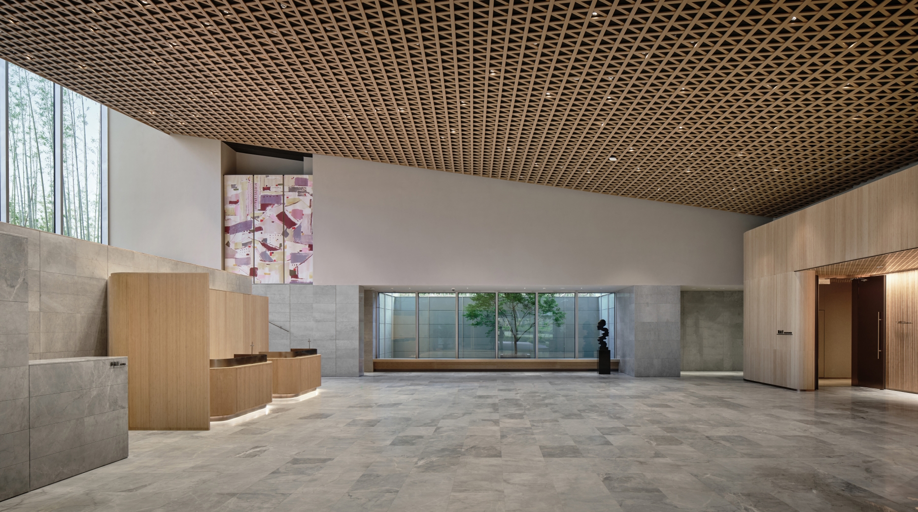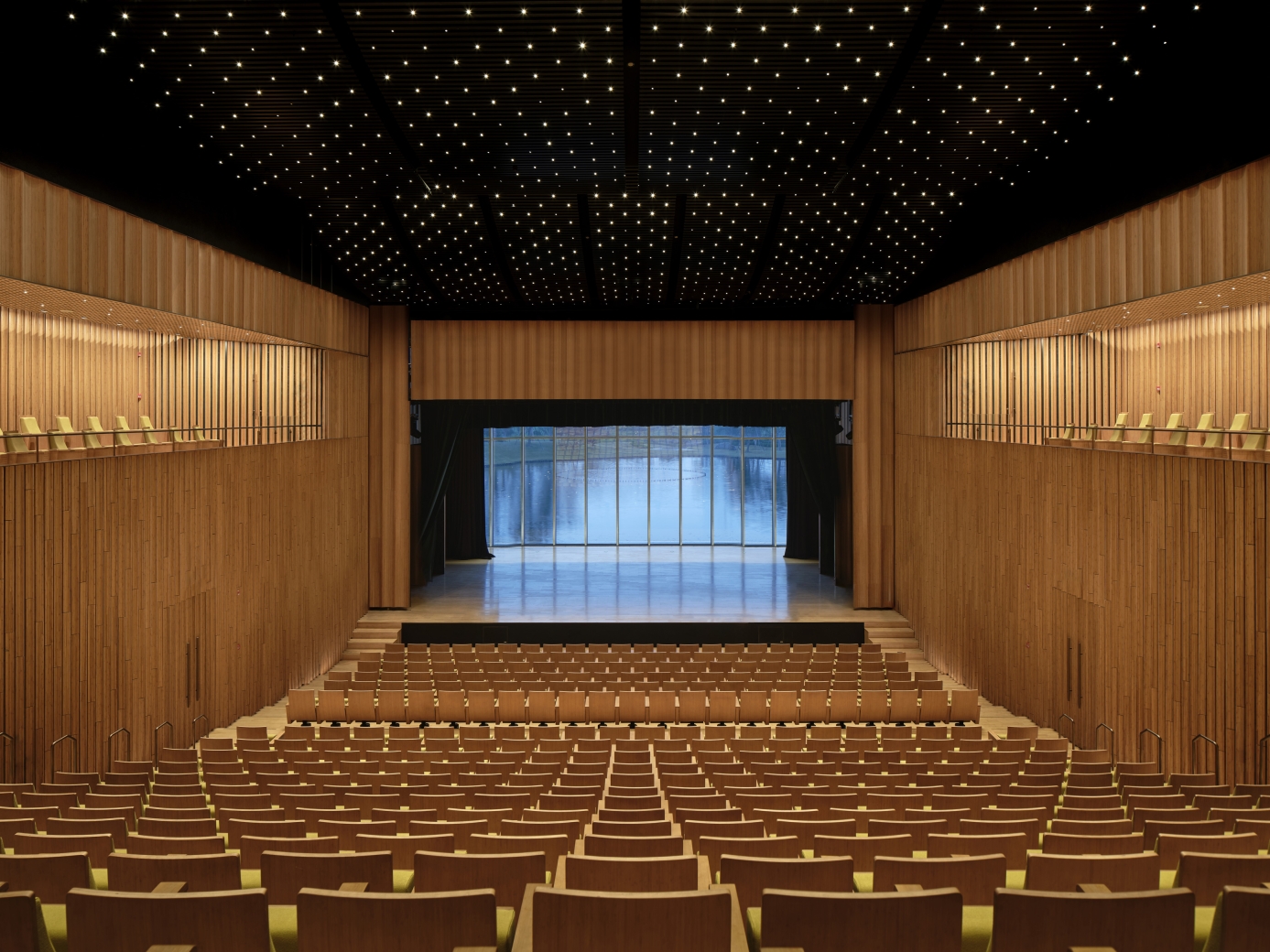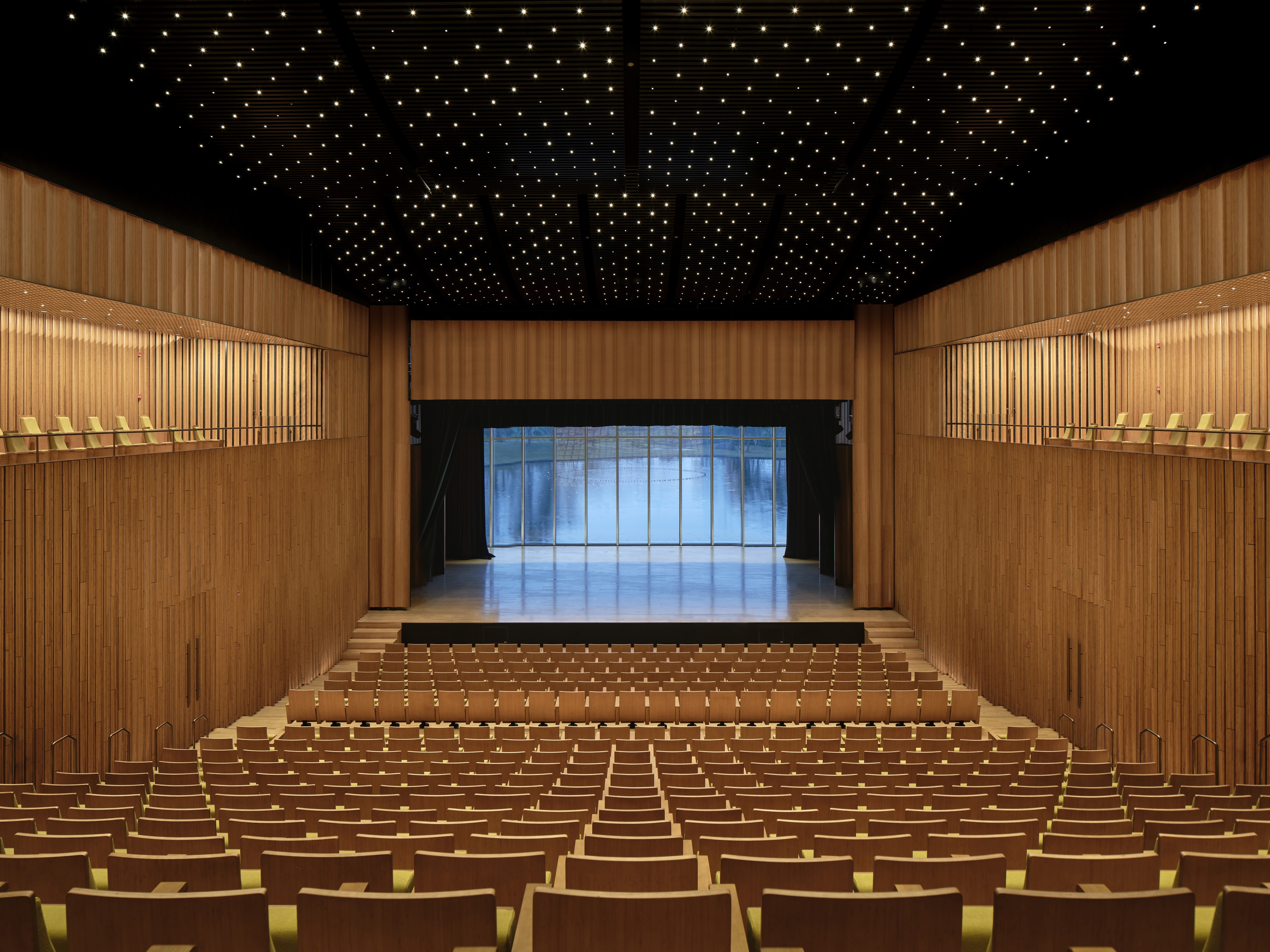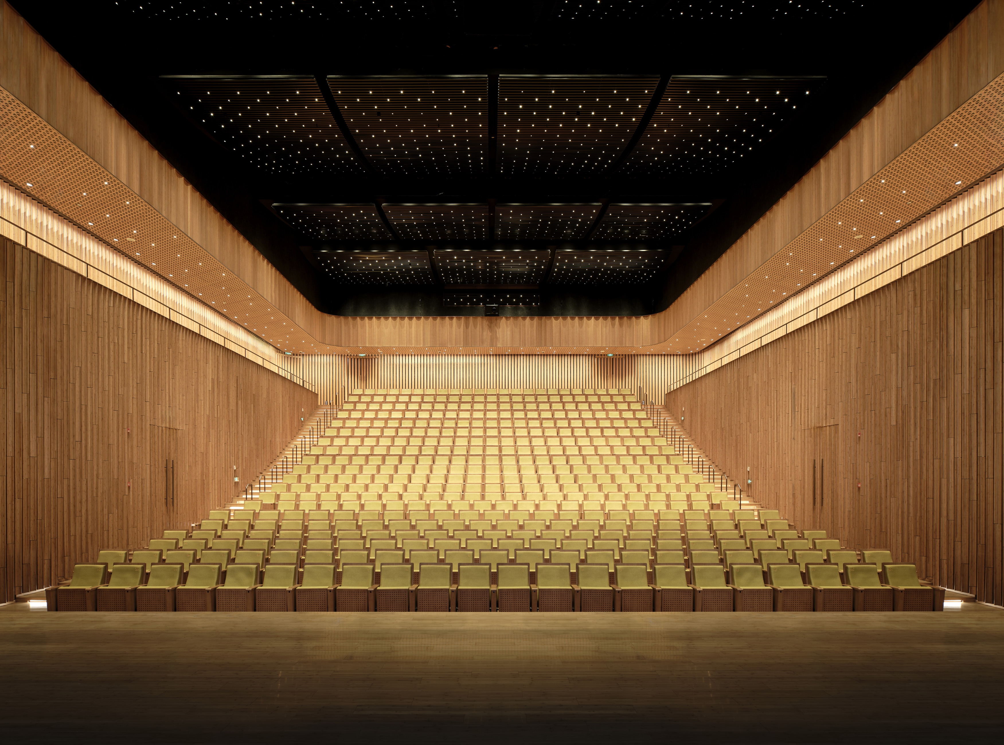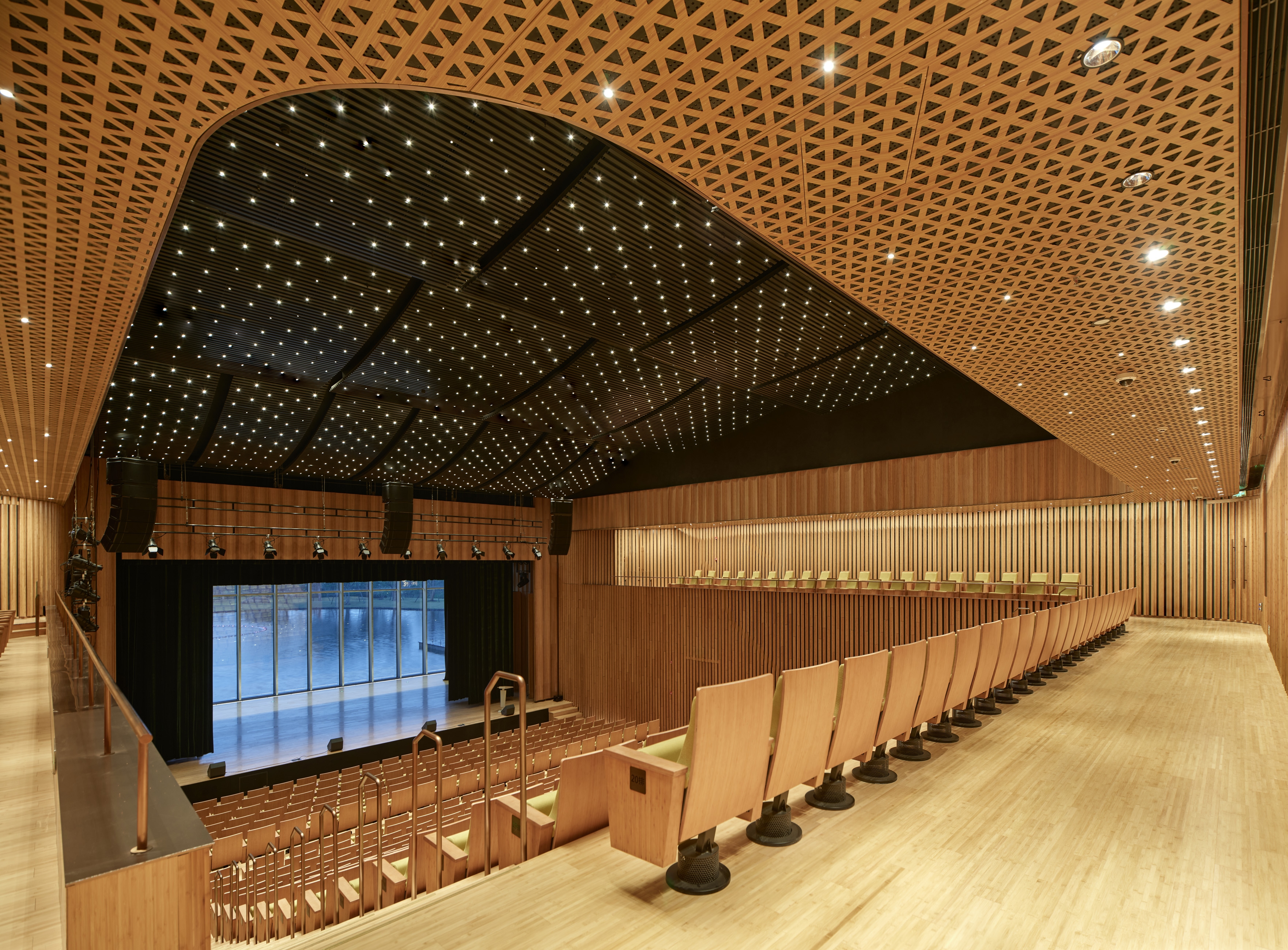 The interior design of the theatre is inspired by bamboo. Lighting design emphasises materials and textures while ensuring functional lighting. 3000K luminaires keep with the warm and soft visual feeling of bamboo. In the lobby, the use of 3W custom-made downlights creates a visual effect of starlight. 3W highly reflective luminaires are uniformly arranged along the ceiling texture, weakening the size of the metal panel while deliberately creating a starburst effect.