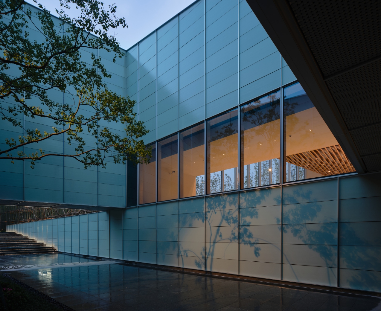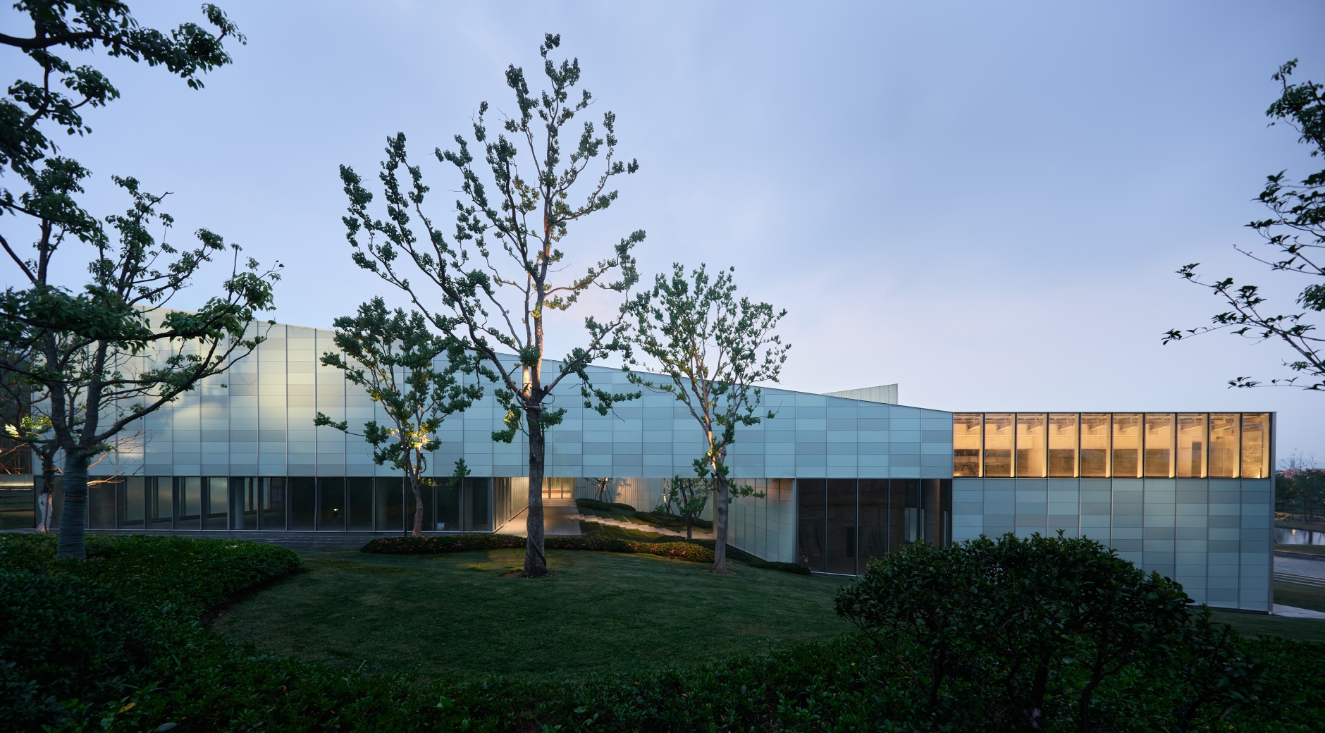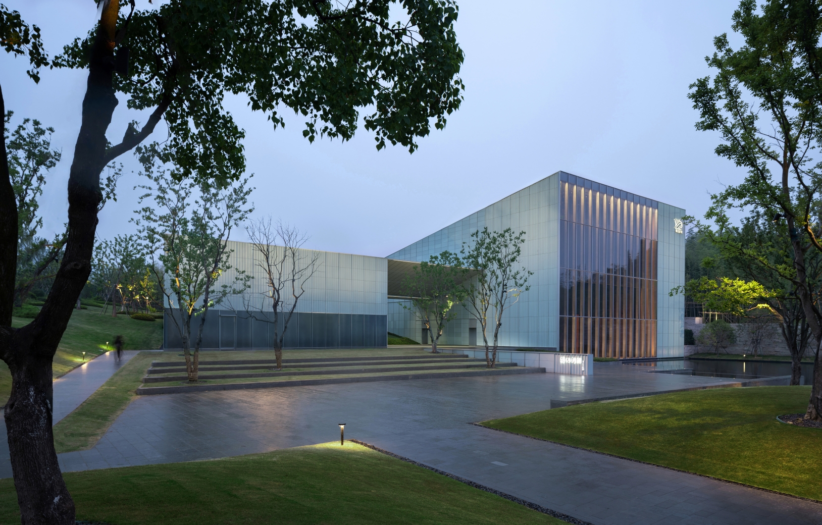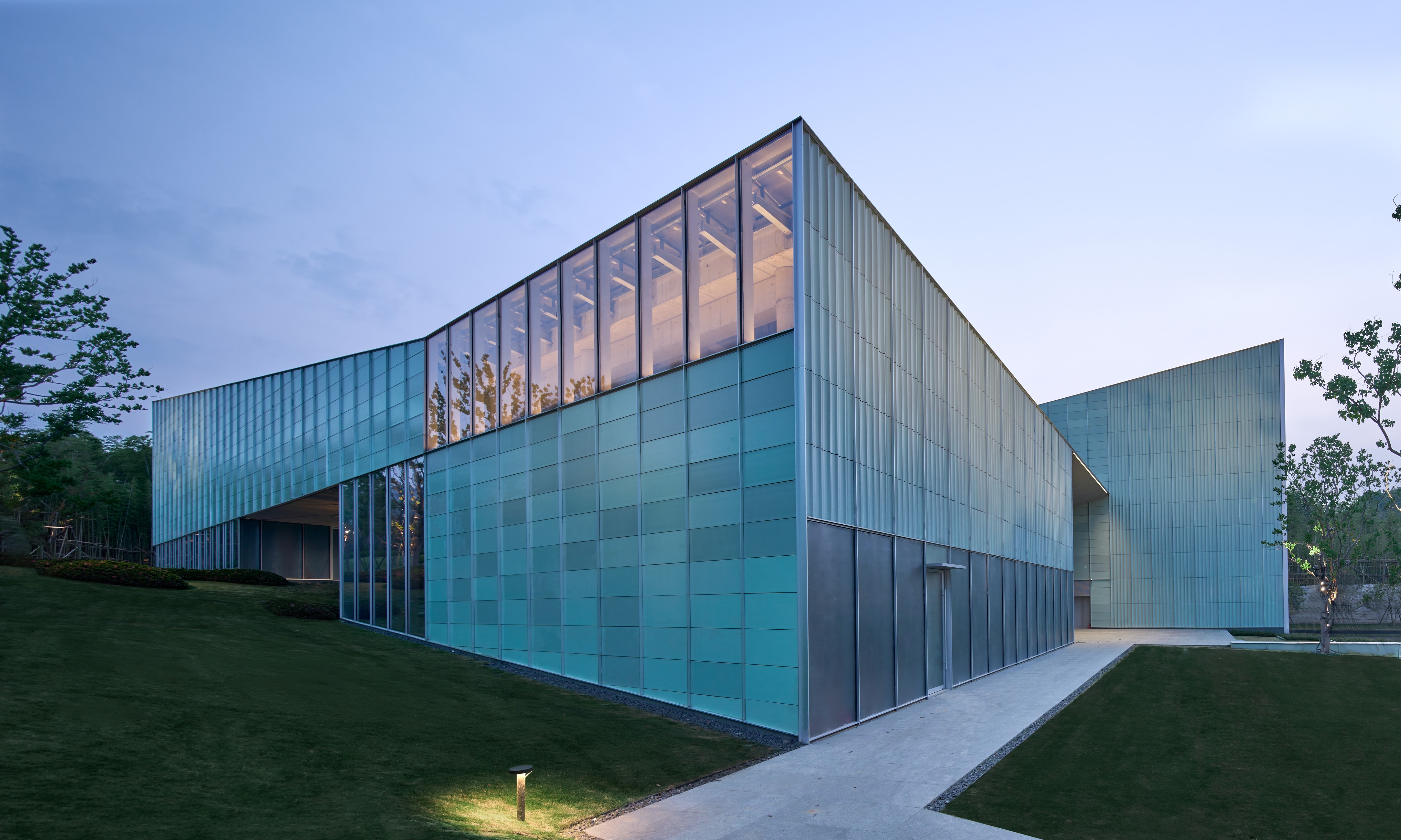 The greatest challenge was to illuminate and avoid light spots on the cyan ceramic panels. Mockup was introduced during the design to verify a better lighting solution. The design was combined with the landscape design, combining the positions of the plants with the luminaire to achieve a concealed installation. 4000K colour temperature floodlights fixed on top of the plant trunks to achieve the effect of gradual wallwash of the ceramic panels.