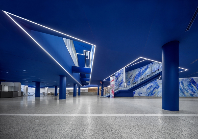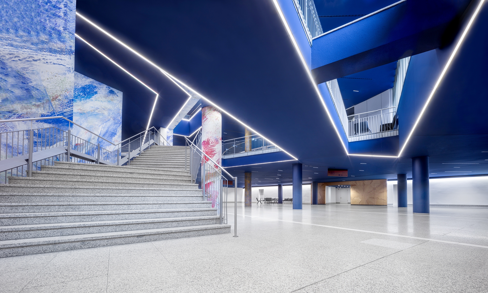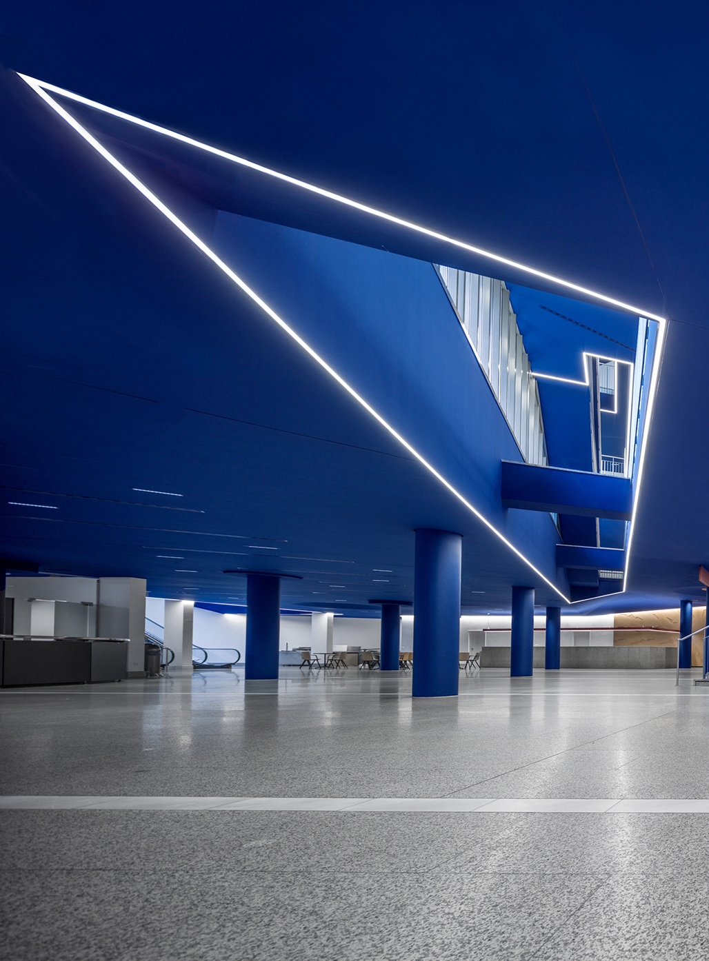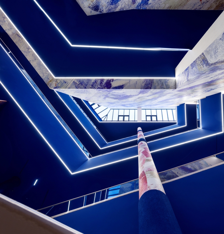 Entry DescriptionDue to the complex ceiling structure, the main challenge was the transformation of the foyer into an inviting space, providing serenity and elegance. On top, a high uniformity was part of the lighting brief, to serve the various events held in the space with a well balanced illumination. The proposal, to change the former white ceiling into a solid blue surface came from the lighting designers and is an important feature in the lighting concept. Small LED-luminaires with precise optics have been seemlessly integrated in the ceiling, and the reflection of the floor supports the generous spatial feeling. LED-Lines follow the main edges of the various voids in the ceiling, to enhance their impact in the space.