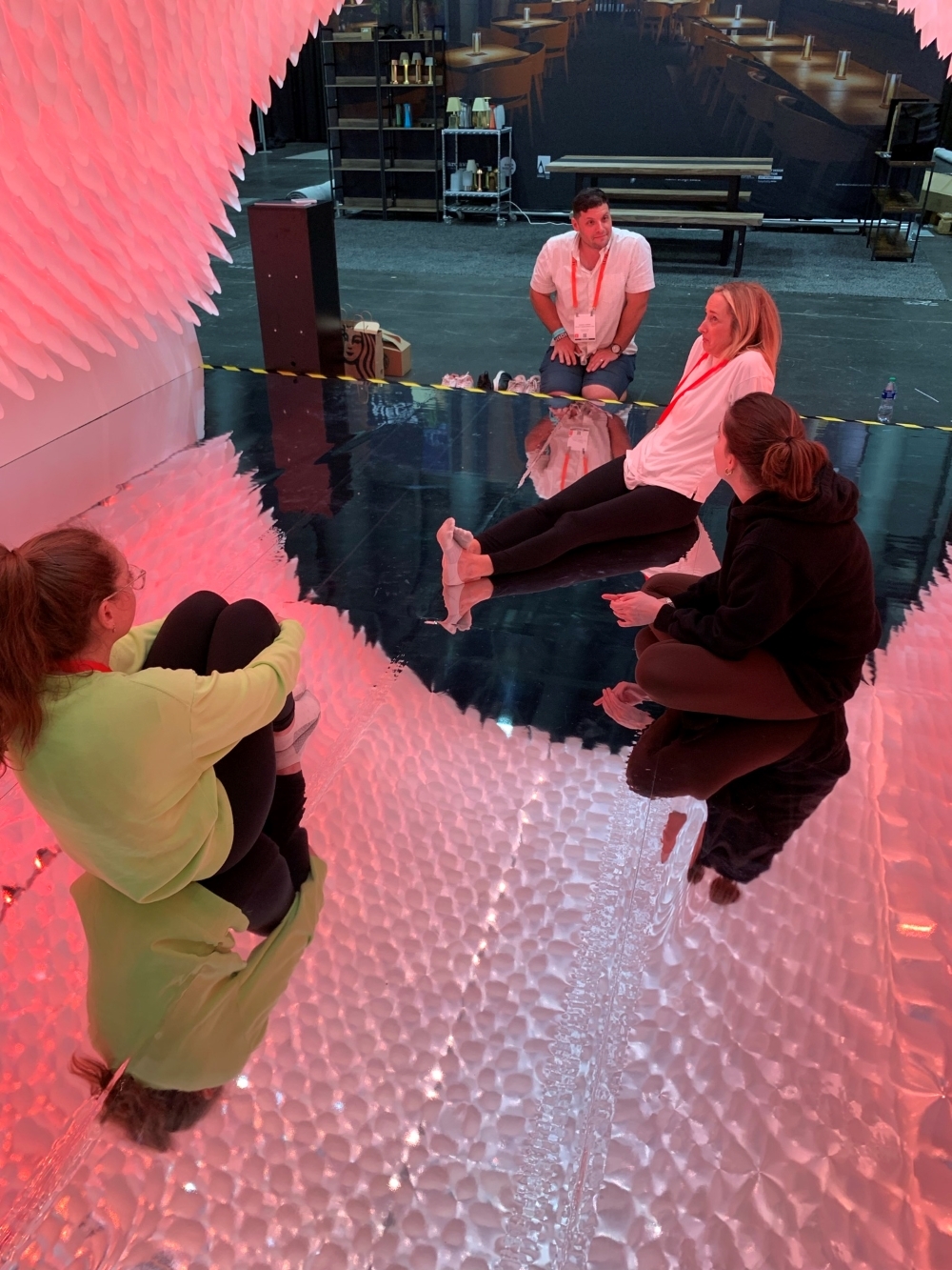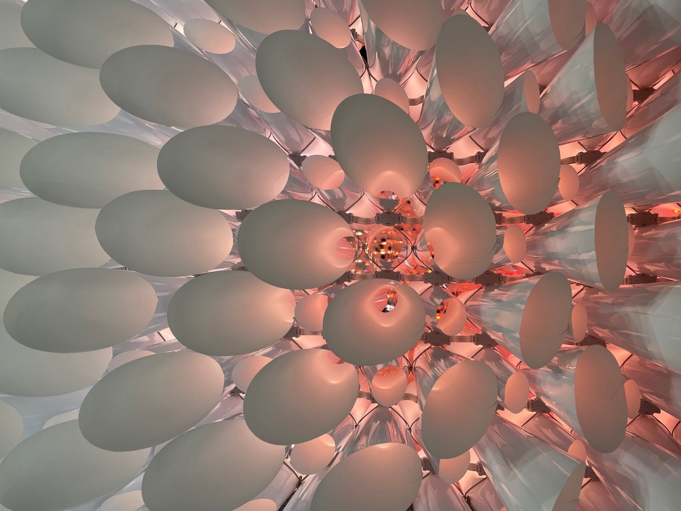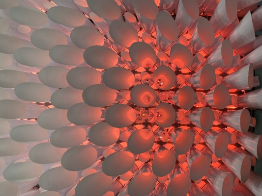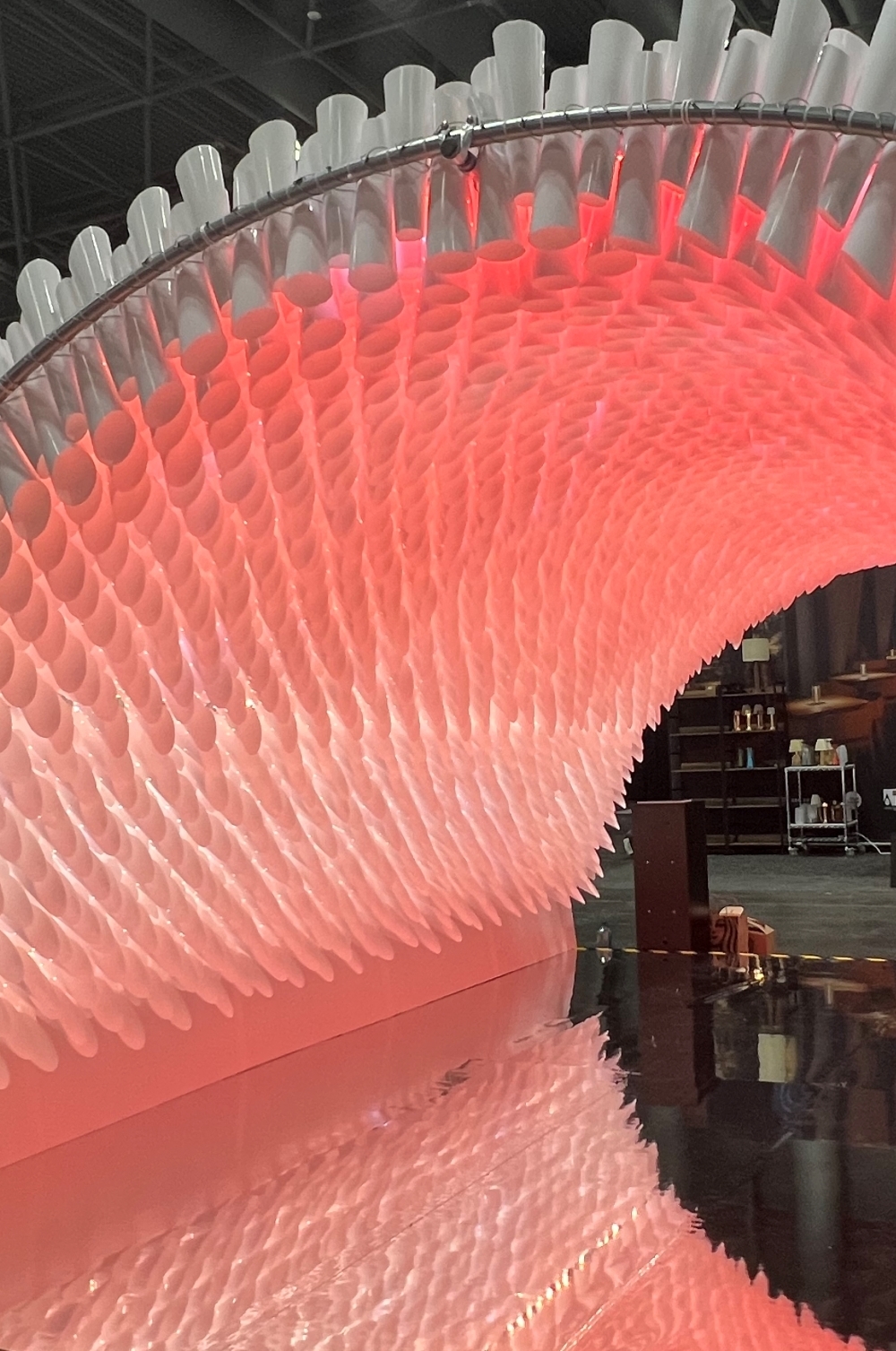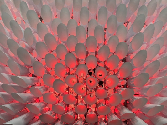 Sustainability ApproachEvery day we are thinking about the resources we extract from the earth, the beauty we coax from them, the experiences they enable, and our responsibility to ensure that they remain accessible to future generations. Only repurposed, reusable and recyclable materials were used. The extruded petals were cut and rolled each by hand to keep emissions low. The conical form is tension held within the mesh without added fasteners and easily stacked for compact packaging. It was critical that the installation not just be recyclable but be reusable and adaptable for future display. Selected materials are durable yet efficient- all easily collapsed, packaged and shipped for future destinations (currently in London)! Sustainability is at the very forefront of our exhibition design – not just in these resourceful efficiencies but also in maximizing meaning with restraint.