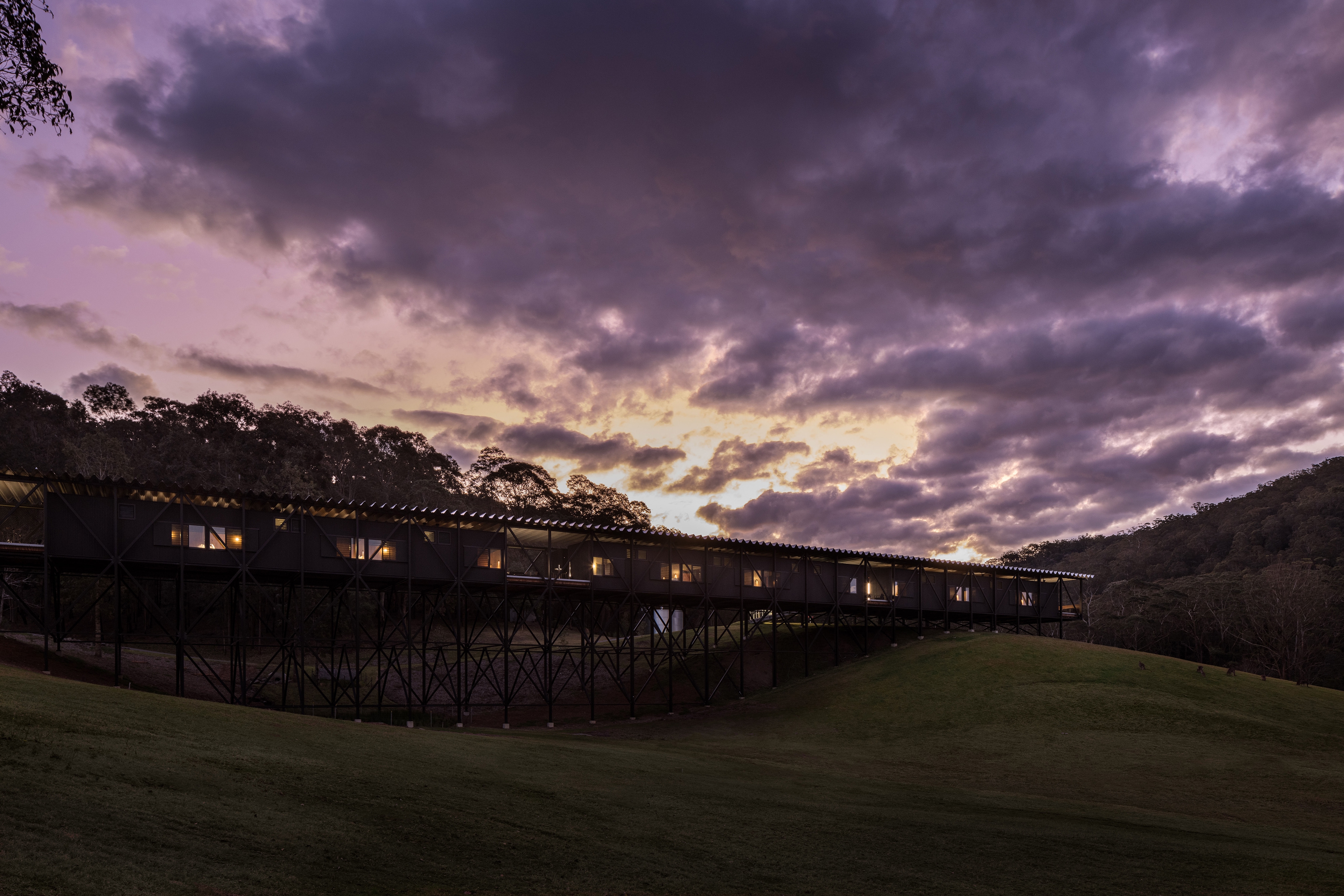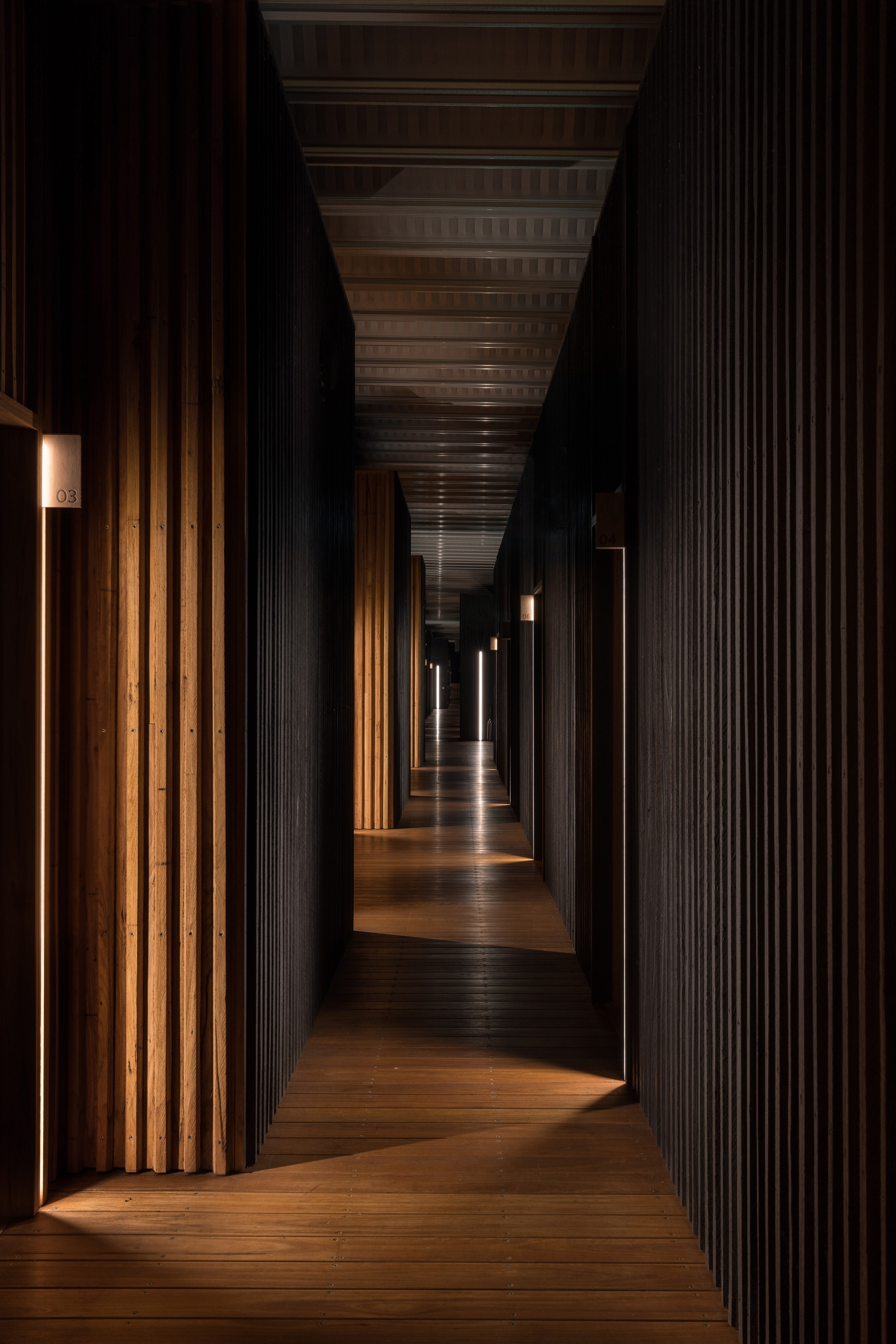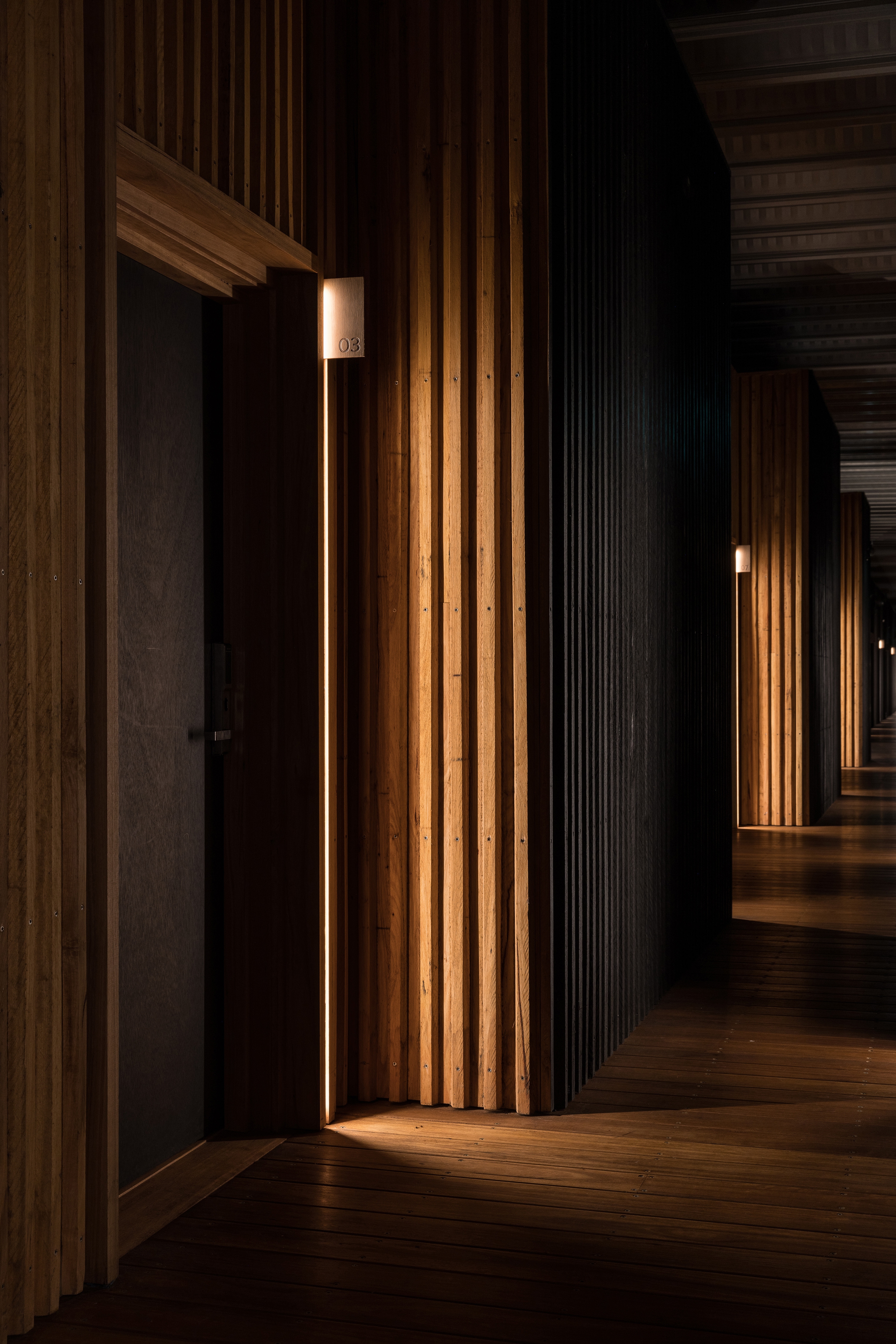 By day, natural light pours into the accommodation and central passage. At night, light is simple, elegant and curated with specific purpose to be in harmony with the environment. Humbly unlit from the outside, lighting is internalized within the bridge forms. Warm pools of light accent task areas in the rooms with no overhead illumination, vertical markers define the room entries and warm diffused light softly washing the timber and ceiling, enhancing the warmth of the materials with a clean design language. Sensors activate the lighting only when needed, reducing energy consumption, embracing darkness and connection with nature.