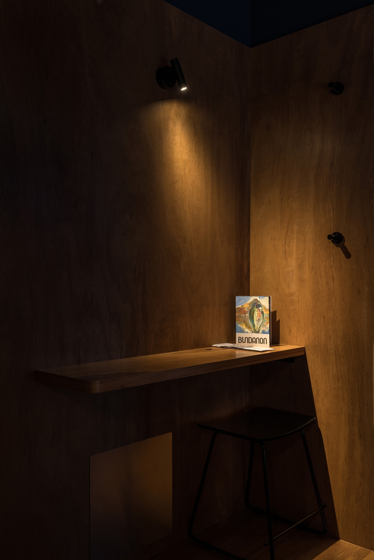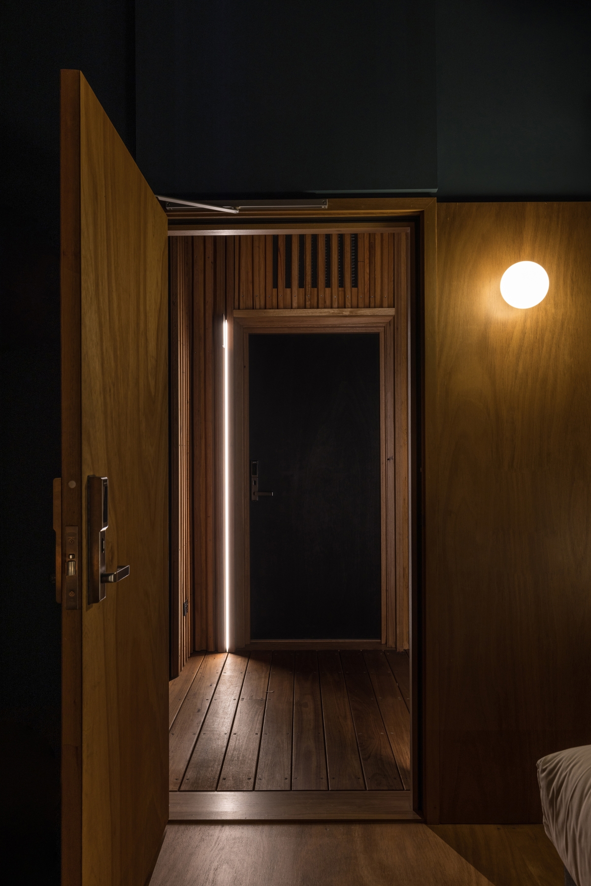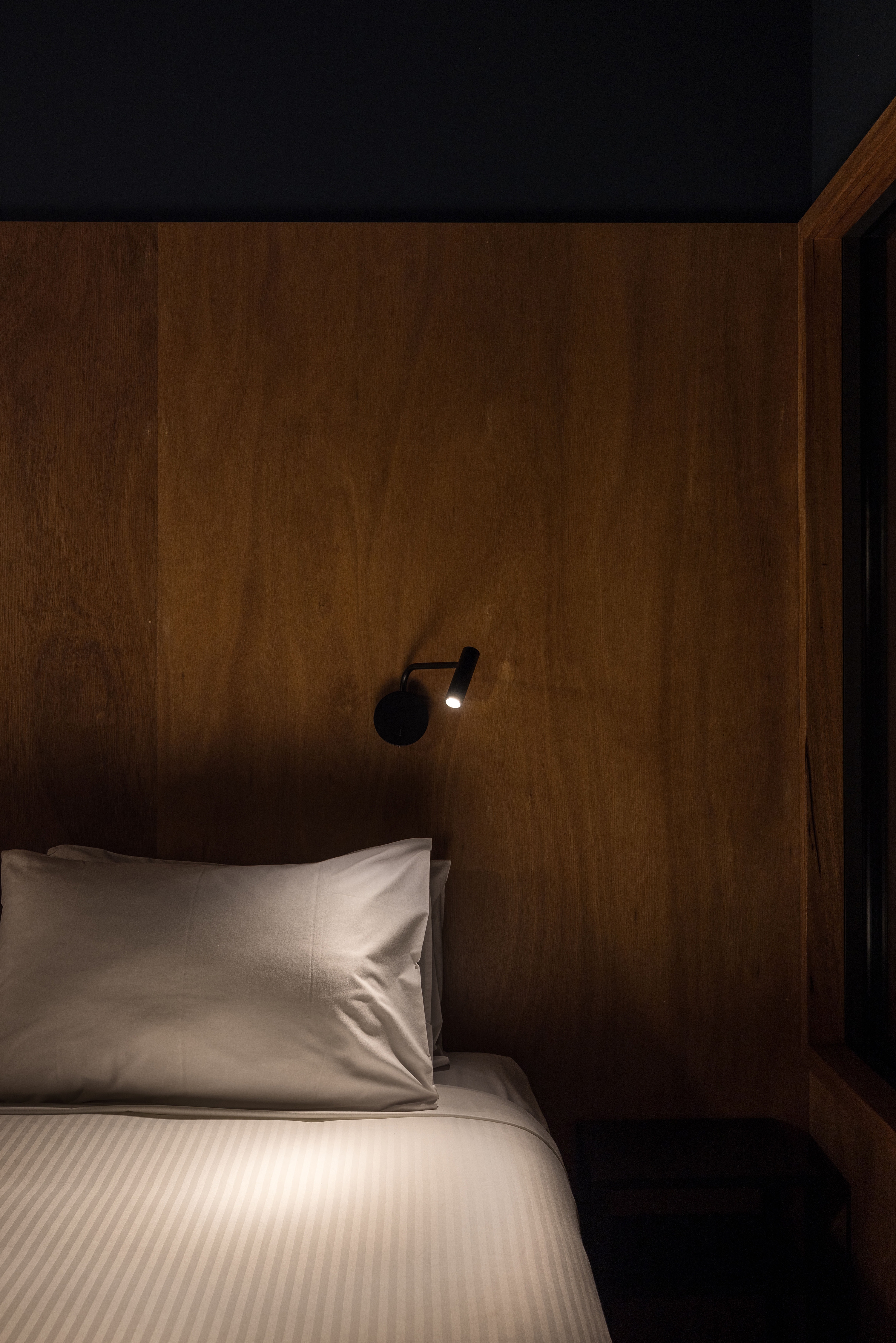 By day, natural light pours into the accommodation and central passage. At night, light is simple, elegant and curated with specific purpose to be in harmony with the environment. Humbly unlit from the outside, lighting is internalized within the bridge forms. Warm pools of light accent task areas in the rooms with no overhead illumination, vertical markers define the room entries and warm diffused light softly washing the timber and ceiling, enhancing the warmth of the materials with a clean design language. Sensors activate the lighting only when needed, reducing energy consumption, embracing darkness and connection with nature.