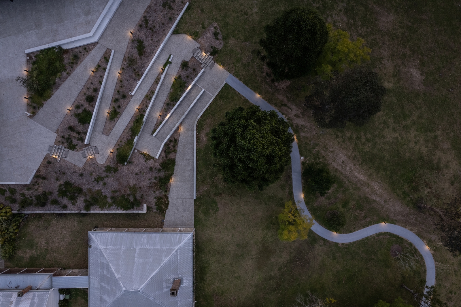Integrated, low level path and bench lighting minimizes light spill and impact to the night sky, facilitating movement and wayfinding whilst supporting site ecology.