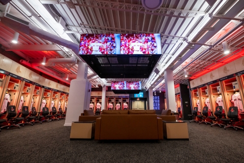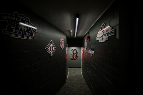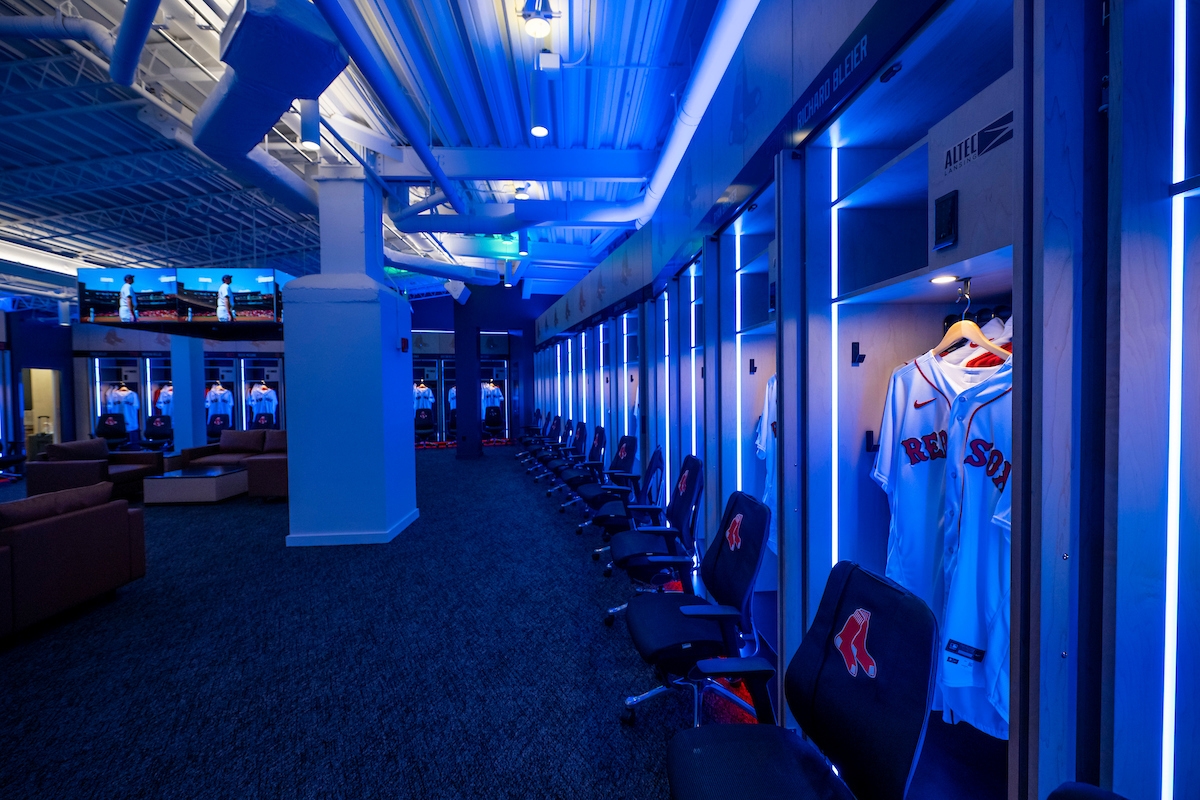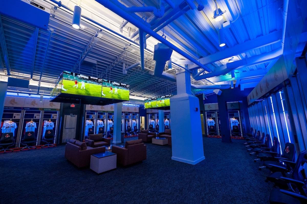 Entry DescriptionFenway’s Red Sox Clubhouse is a project like no other. The dated clubhouse is wedged underneath the stadium’s seating bowl, with sloping ceilings full of ductwork and other systems. There was an aggressive schedule of just three months to design, procure, and install all lighting and controls. Also of concern, all the lighting products could be subject to accidental damage from rowdy baseball players, which necessitated product durability. A meeting with the MLB’s sleep doctor resulted in the chief design direction: use RGBW to create different lighting scenes to amp up players before games and help them to calm down afterward with the goal of improving their performance. Separately controllable uplight and downlight luminaires, ceiling washers, and toe-kick lights were designed in addition to the lighting integrated into the locker casework. Each lighting scene manipulated the hue, saturation, and intensity of these different layers. The color-changing concept also applied to the corridors that connect the batting cages, clubhouse, and dugout, so that mood lighting was implemented throughout the players’ entire path of travel on game days. The finished scenes were a painterly composition of colored surfaces, using varied-CCT white downlight to keep skin tones from veering off into the unflattering realm, that ultimately achieved the design goals and the project’s requirements.