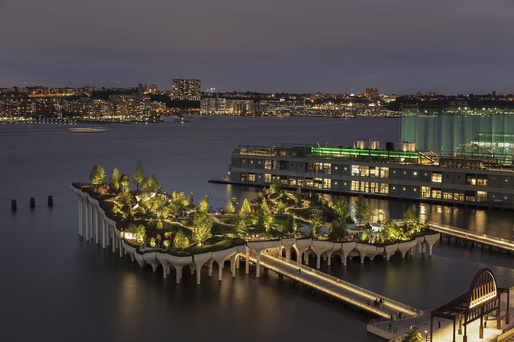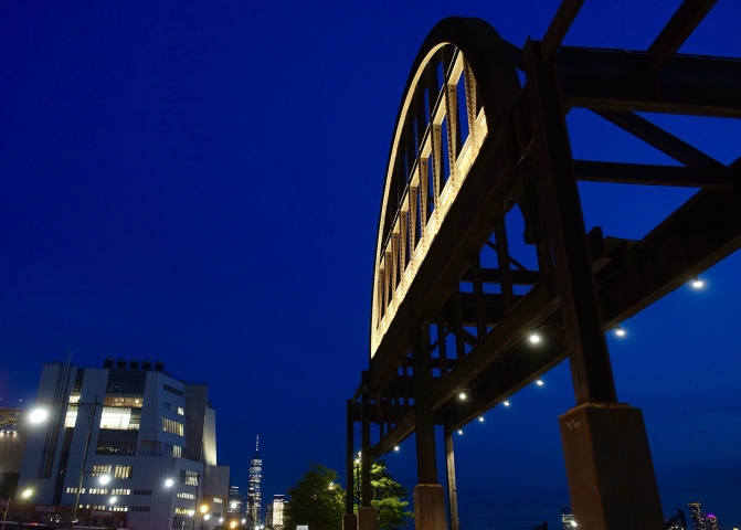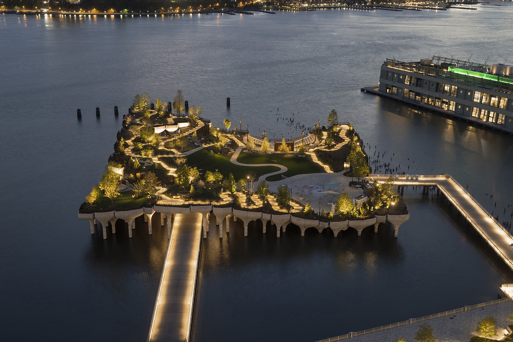 Sustainability ApproachLow level concealed lights allow safe passage for visitors, while allowing unobstructed views of the island features and city and river vistas. The imposing supporting structure is not illuminated at night in deference to the Hudson River marine habitat. In addition, light surveys and calculations were performed to ensure light levels would not penetrate and be disruptive to marine life down to several feet below the level of the water surface. All fixtures near the park’s edge are shielded and aimed away from the river.