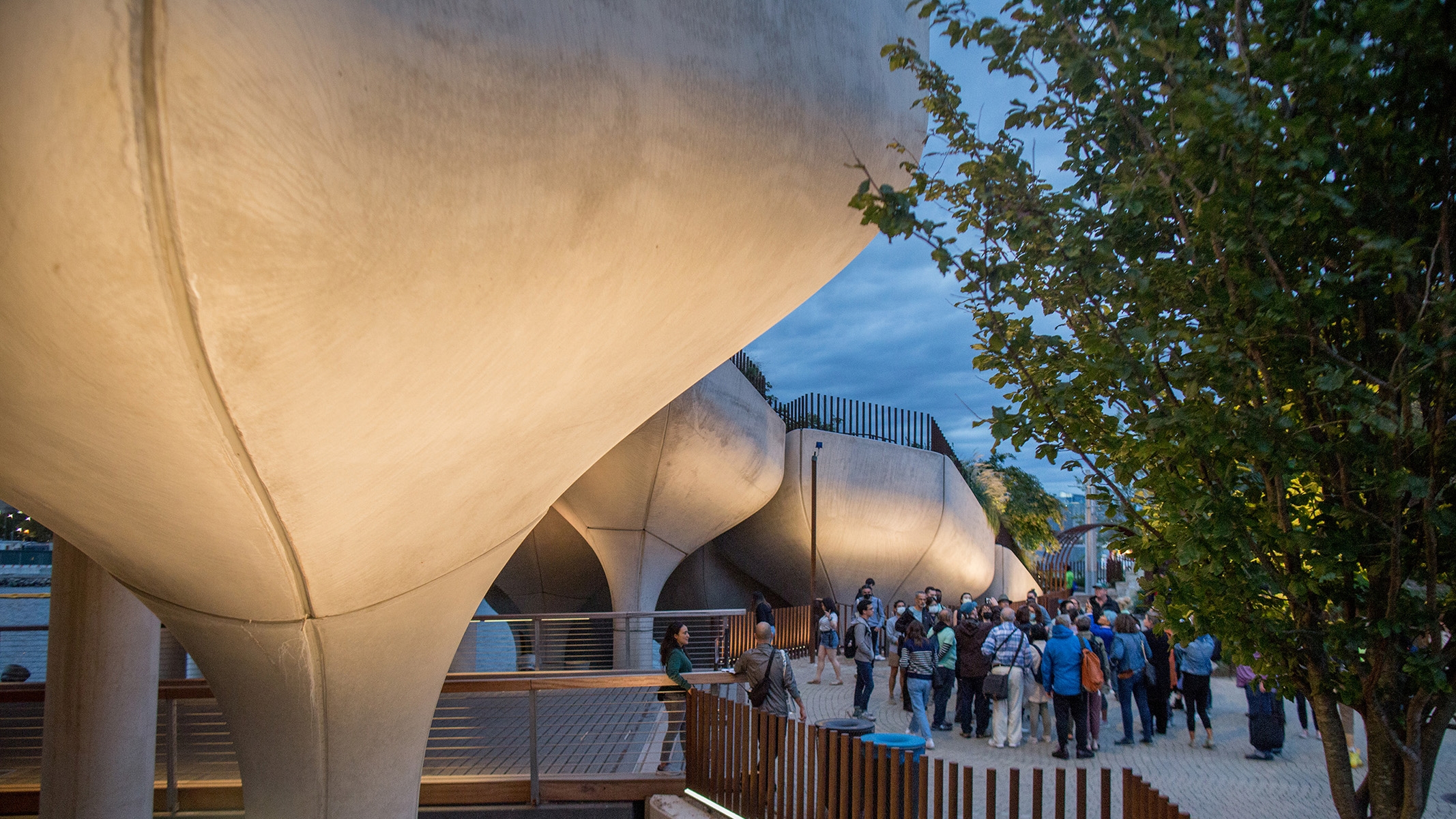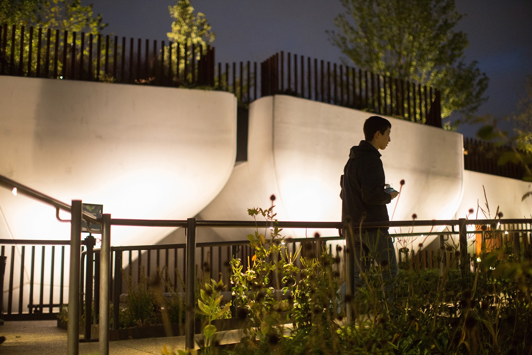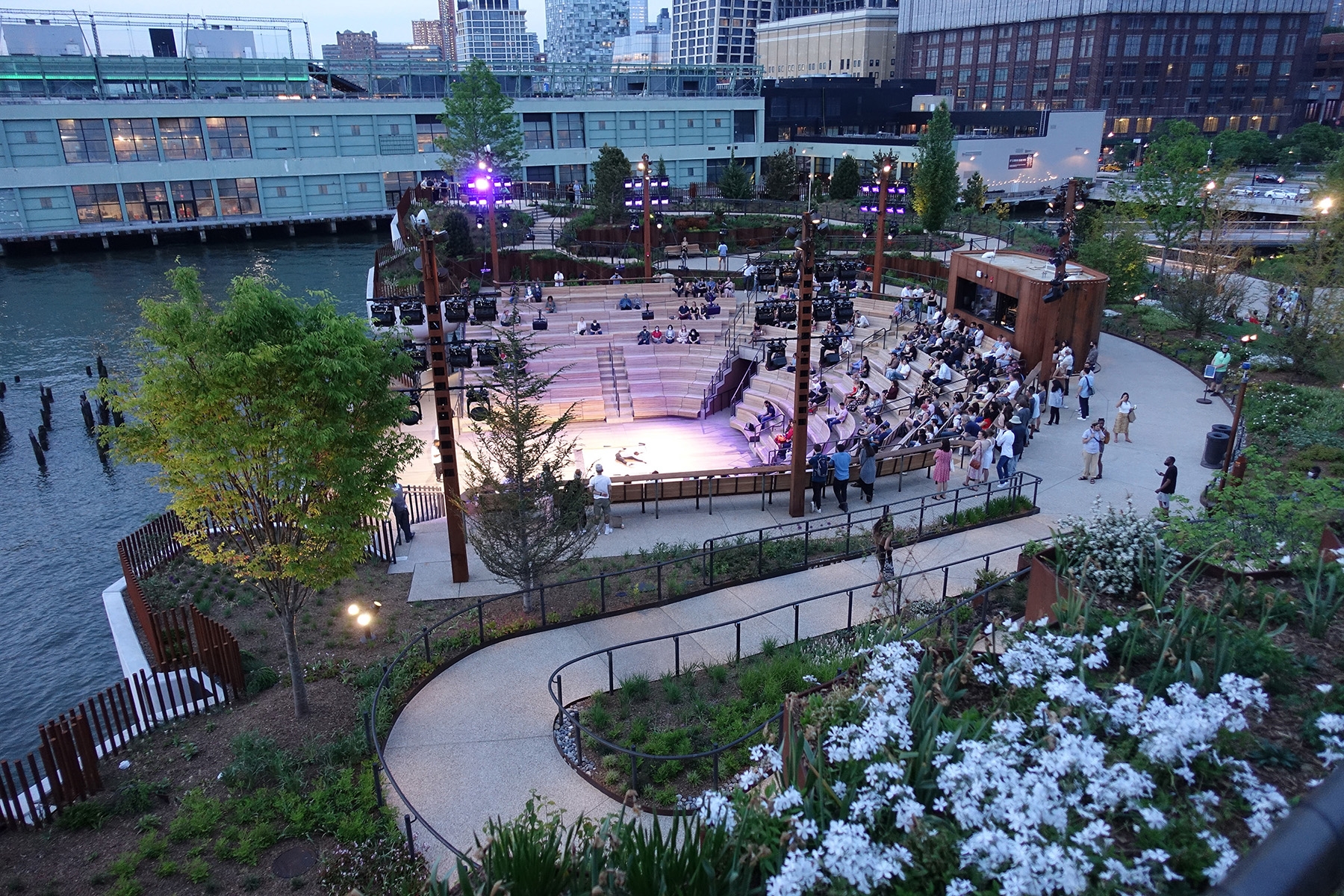 Sustainability ApproachLow level concealed lights allow safe passage for visitors, while allowing unobstructed views of the island features and city and river vistas. The imposing supporting structure is not illuminated at night in deference to the Hudson River marine habitat. In addition, light surveys and calculations were performed to ensure light levels would not penetrate and be disruptive to marine life down to several feet below the level of the water surface. All fixtures near the park’s edge are shielded and aimed away from the river.