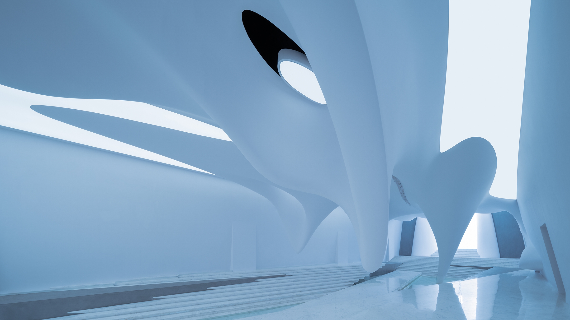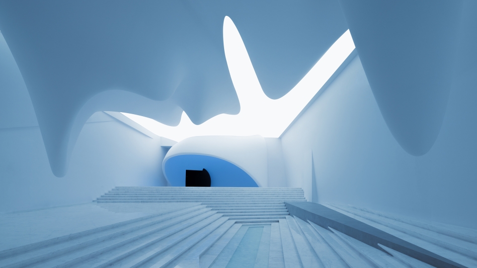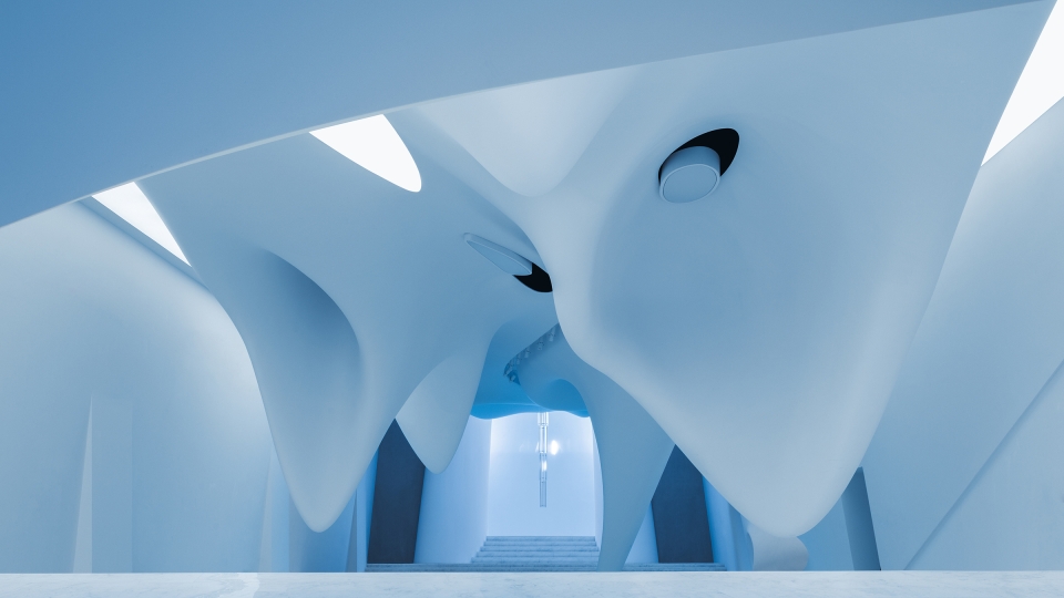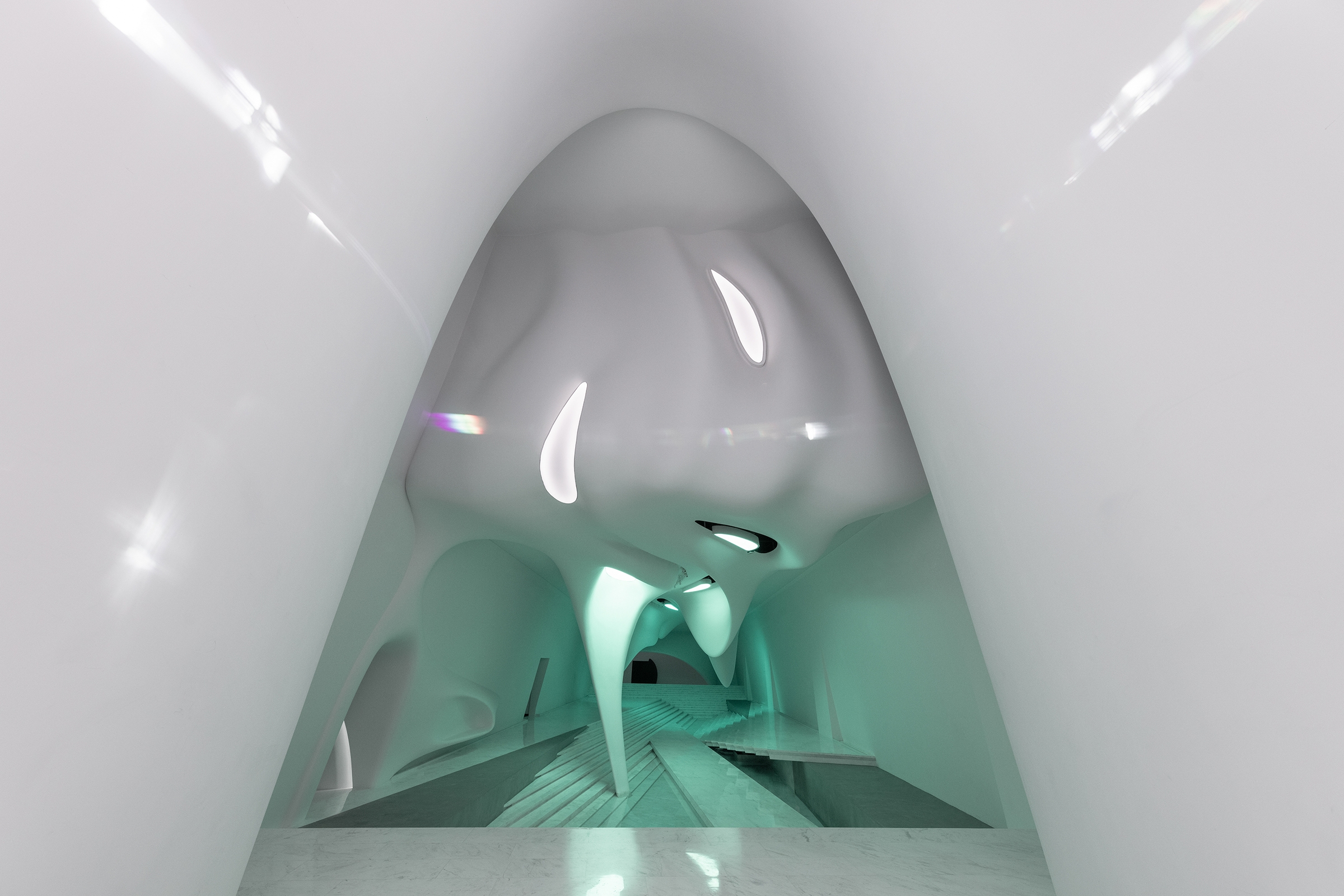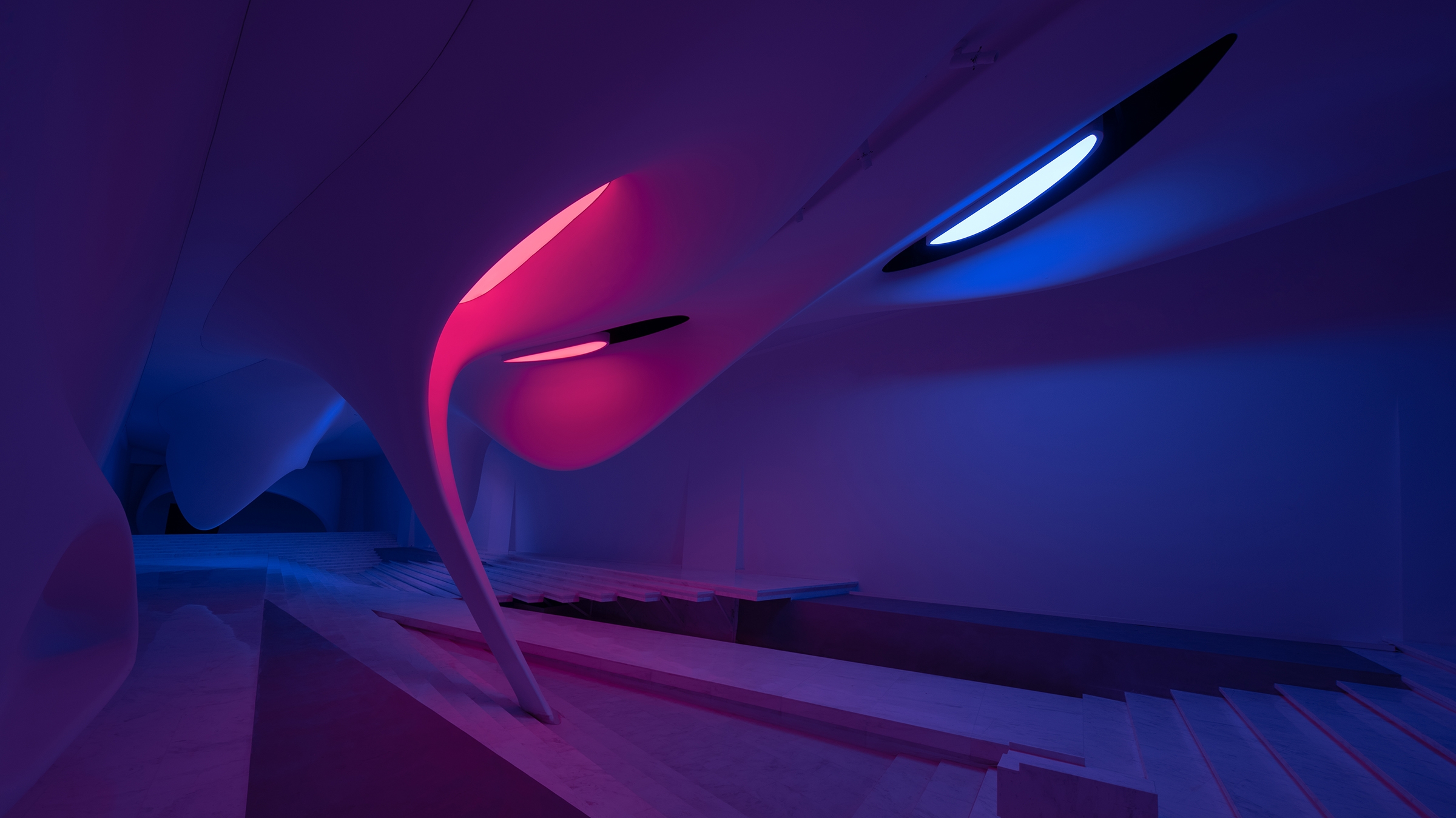 Behind the giant arch at the end of the space, two 2700k and 6500k 500W LED luminaires are installed to light upward, shaping the sense of immensity of arch and forming a backlight to shape the curve of the space. In this regard, it not only meets the lighting, but also reflects the grayness of the space.