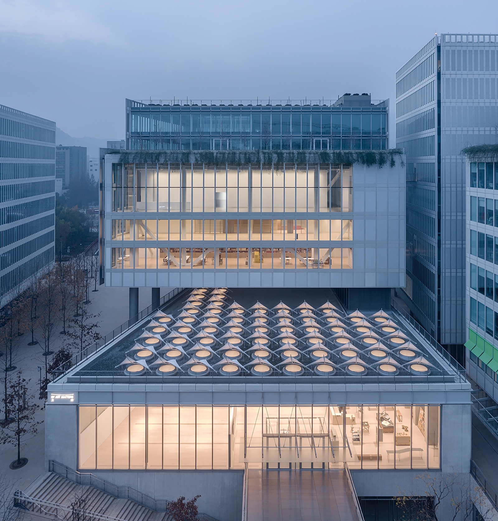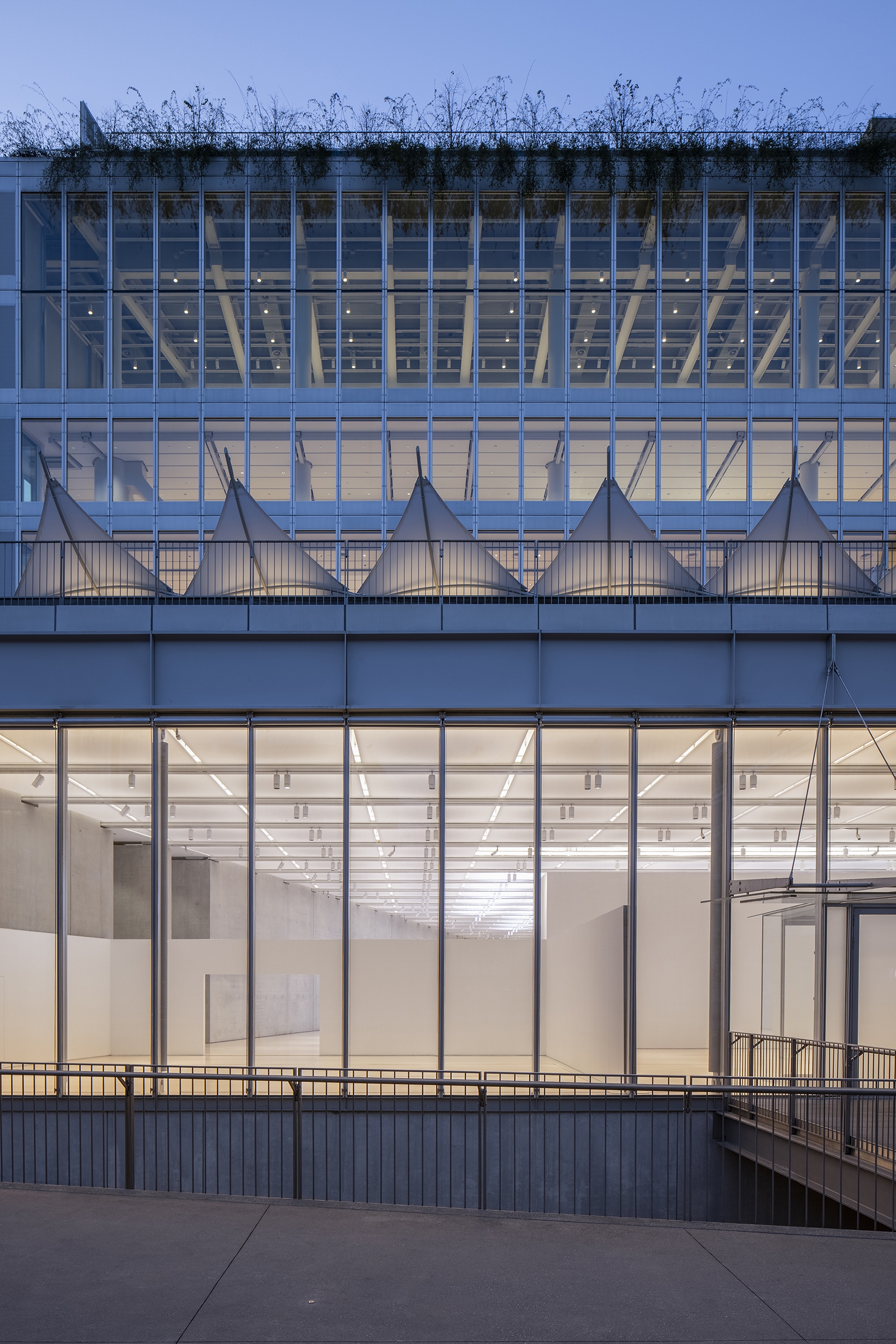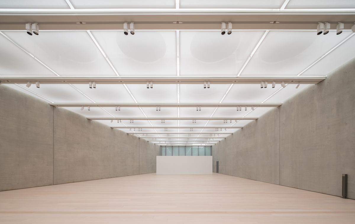 The sails above the skylights open towards the north block out direct sunlight during the day and allows diffused daylight to enter the gallery, creating soft a glow on ceiling scrim while maintaining a view to the sky. Skylights in central gallery zones that receive little daylight are integrated with LED to supplement ambient lighting, with colour temperature fine-tuned to resemble that of daylight entering the space. In addition, linear lights integrated to the beams above ceiling scrims enhance ambient light and reduce visual differences between real skylights and LED skylights. Track lighting were used throughout the gallery, ensuring flexibility for accentuating art displays.