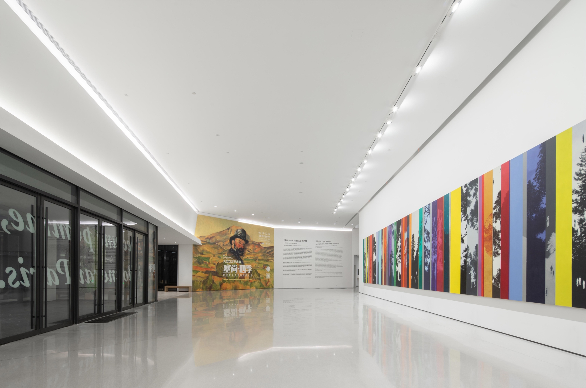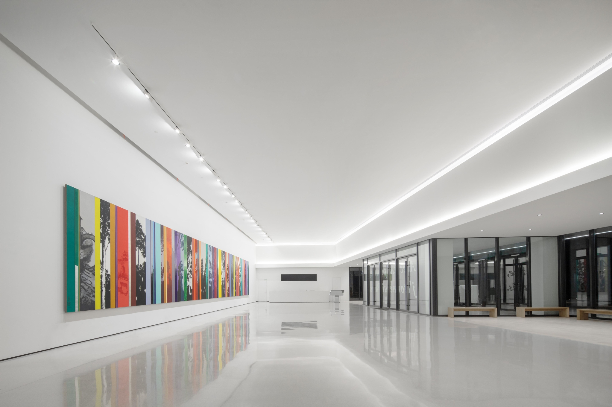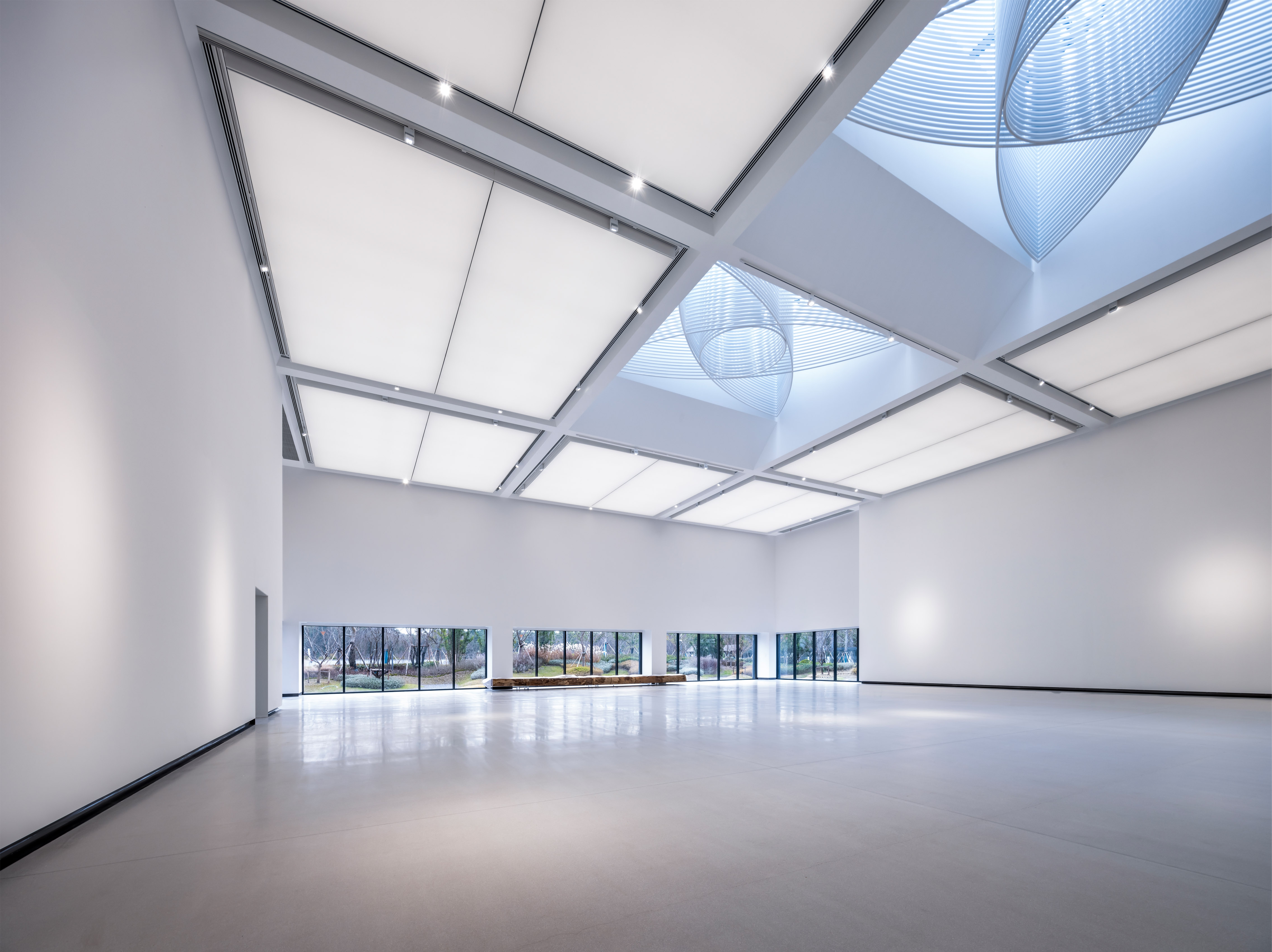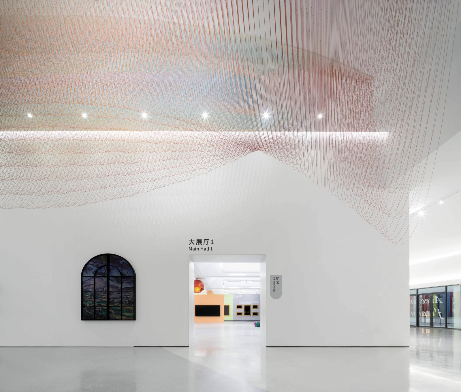 Entry DescriptionIn the lighting design,the team avoided common downlights and instead adopted the approach of illuminating the ceiling to achieve soft and diffused light that fills the entire space.Large-scale wall washing is used to highlight the exhibited artworks and introductions at the entrance,accentuating the spatial characteristics and guiding the visual flow.The public circulation spaces leading to various exhibition halls continue the consistent design approach.Through extensive wall washing and the high reflectivity of white walls,a uniform and bright visual space is achieved without the need for dense downlights.Suspended artworks in the public spaces are composed of colorful silk threads,featuring graceful and gentle forms.They are illuminated through diffused light,adding a touch of brightness to the pure white space.In the main exhibition hall,a large area of adjustable luminous ceiling provides a uniformly high-brightness environment that meets exhibition requirements.Additionally,a track lighting system embedded within the framework highlights the exhibited artworks.The skylight in the center of the exhibition hall was carefully designed to avoid direct sunlight on the paintings.The design team conducted a precise natural light simulation analysis to determine the height and spacing of the"eye"devices,ensuring that direct sunlight doesn't fall on the walls throughout the year.