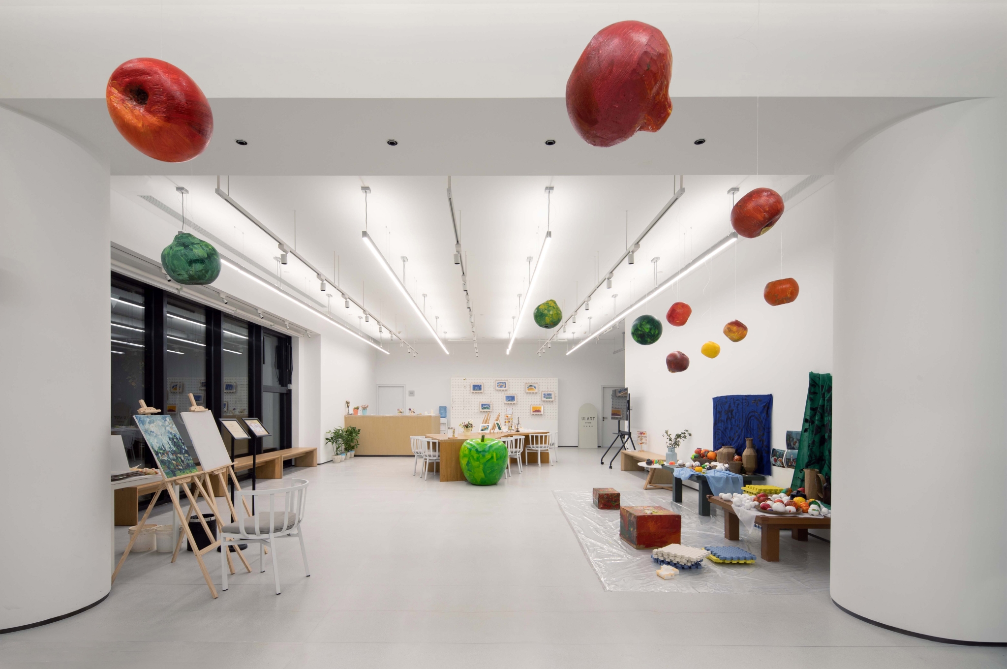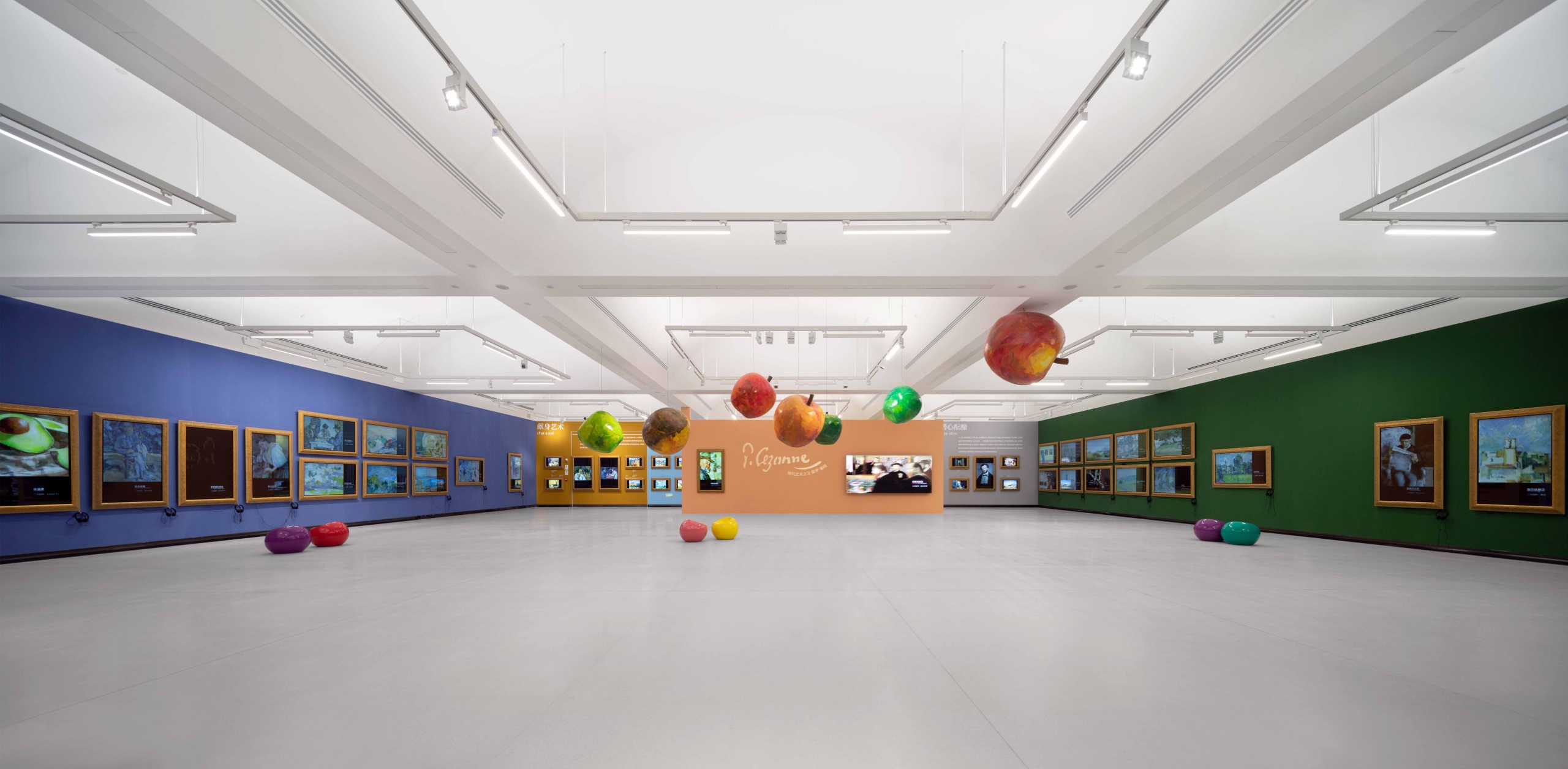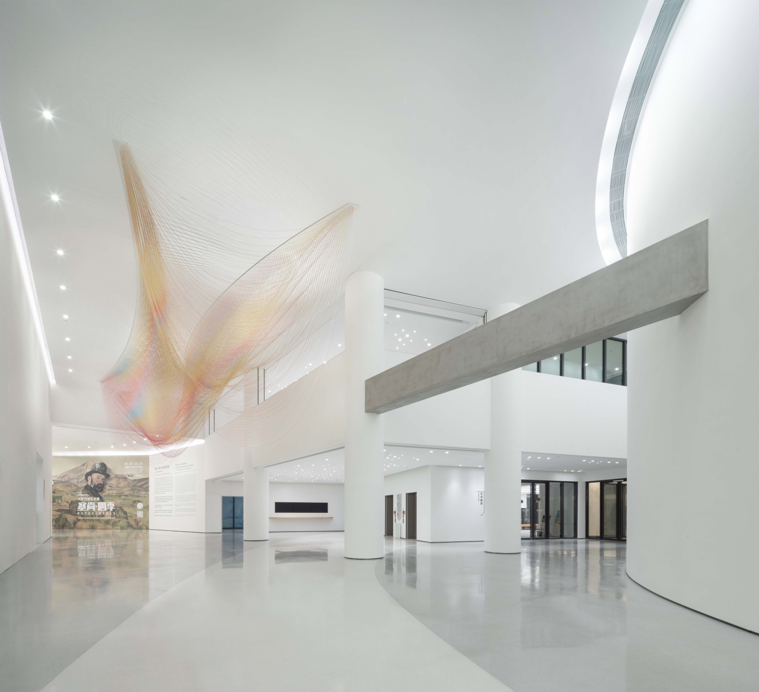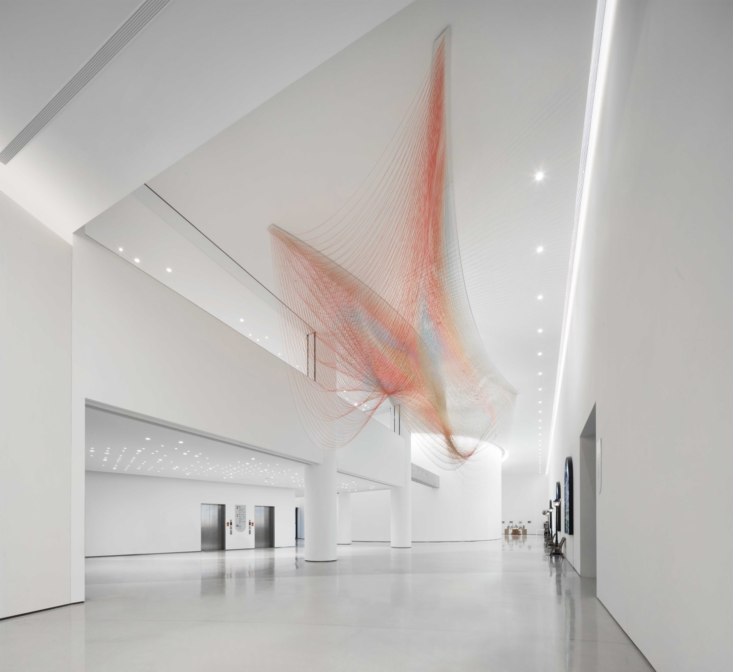 Entry DescriptionIn the lighting design,the team avoided common downlights and instead adopted the approach of illuminating the ceiling to achieve soft and diffused light that fills the entire space.Large-scale wall washing is used to highlight the exhibited artworks and introductions at the entrance,accentuating the spatial characteristics and guiding the visual flow.The public circulation spaces leading to various exhibition halls continue the consistent design approach.Through extensive wall washing and the high reflectivity of white walls,a uniform and bright visual space is achieved without the need for dense downlights.Suspended artworks in the public spaces are composed of colorful silk threads,featuring graceful and gentle forms.They are illuminated through diffused light,adding a touch of brightness to the pure white space.In the main exhibition hall,a large area of adjustable luminous ceiling provides a uniformly high-brightness environment that meets exhibition requirements.Additionally,a track lighting system embedded within the framework highlights the exhibited artworks.The skylight in the center of the exhibition hall was carefully designed to avoid direct sunlight on the paintings.The design team conducted a precise natural light simulation analysis to determine the height and spacing of the"eye"devices,ensuring that direct sunlight doesn't fall on the walls throughout the year.