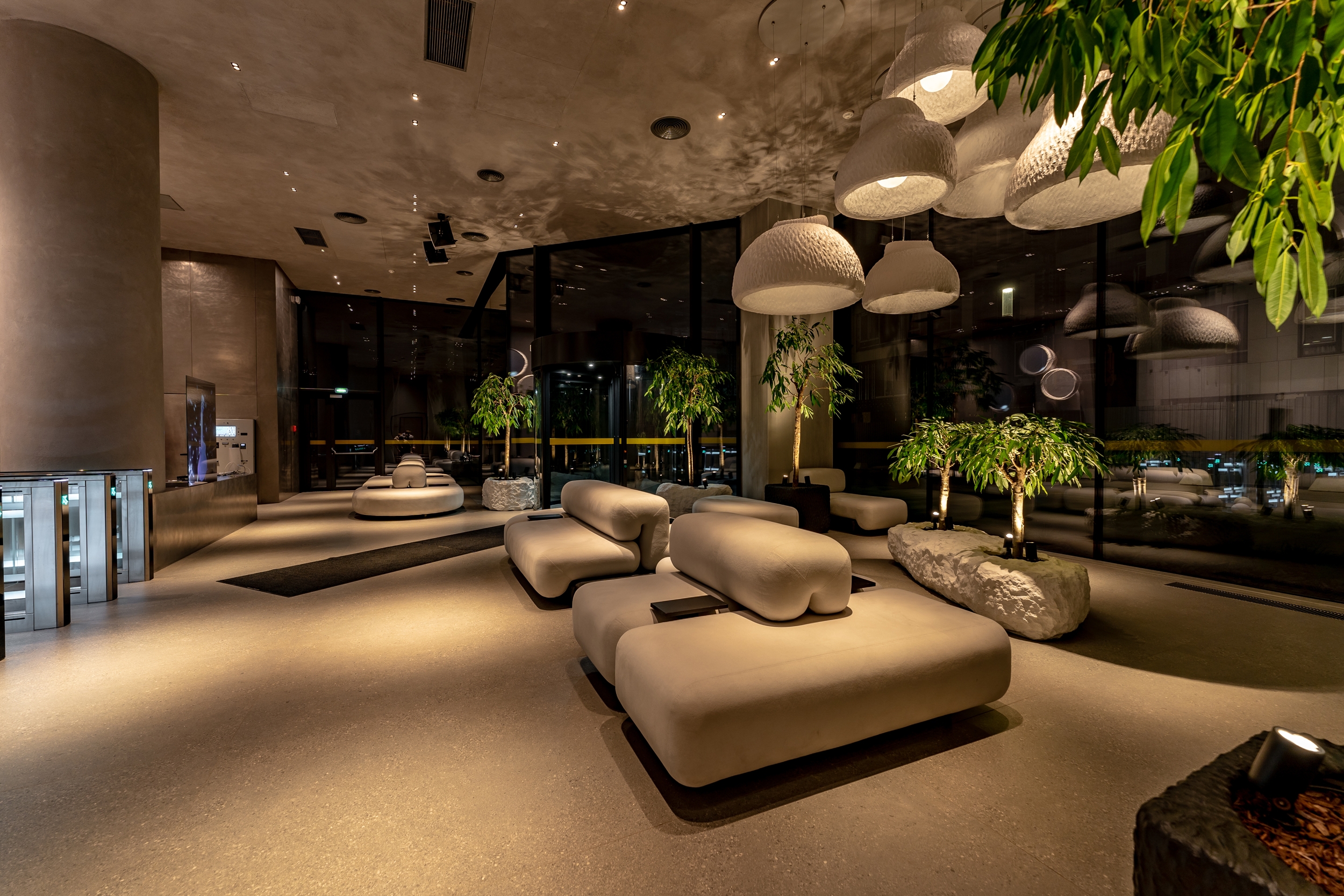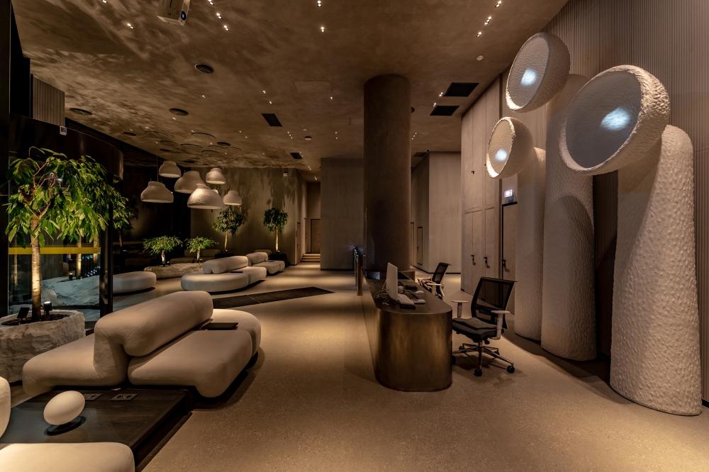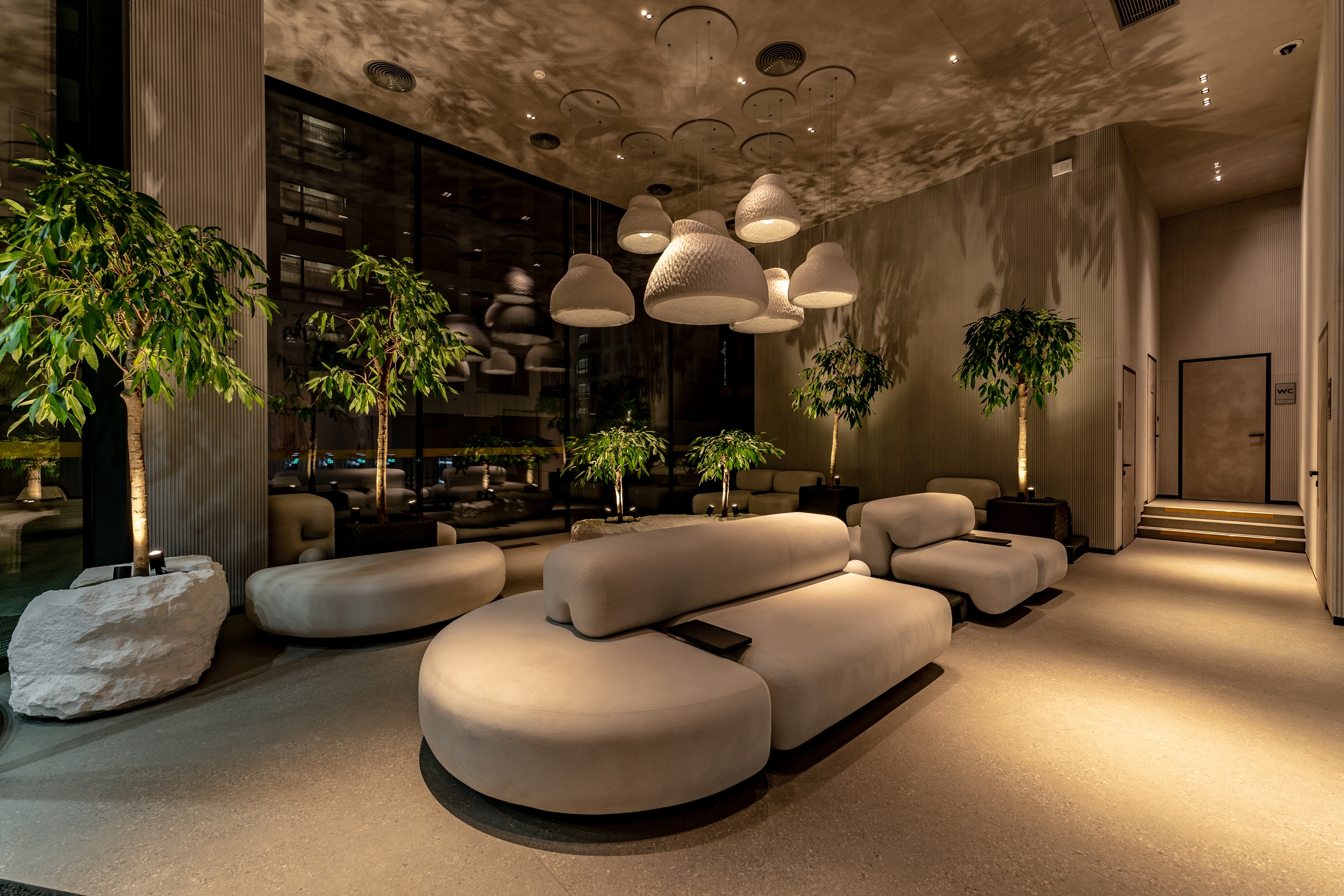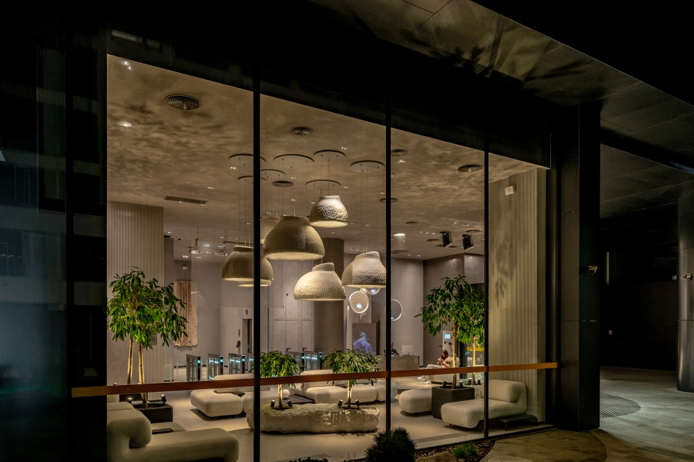 In addition, biodynamic lighting is built into the entire hall, which repeats the daily rhythms of a person and gradually changes in four scenes at the appropriate time of the day. In addition, the interior features of the Yakusha design were emphasized with light, and the atmosphere of the evening forest was created with shadows from plants on the walls and floor.
